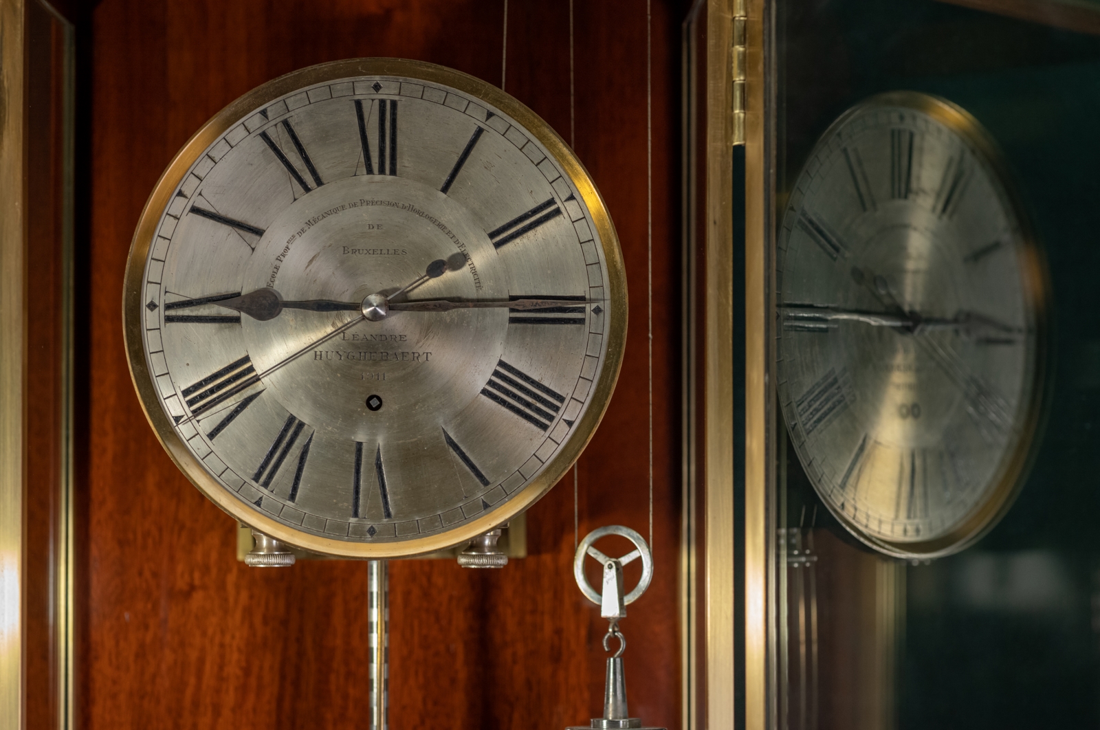 Hangende regulateur van sapeli mahonie met messing biezen. De nog origineel verzilverde wijzerplaat gesigneerd Leandre Huygebaert 1911 Ecole Professionnelle de Mécanique de Précision et d´ Electricité de Bruxelles. Meesterwerk van Huygebaert bij het afstuderen van zijn opleiding. Het uurwerk met centrale seconde wijzer loopt twee weken en heeft een lange temperatuur compensatie slinger, waarbij de slingerlens gevuld is met kwik.