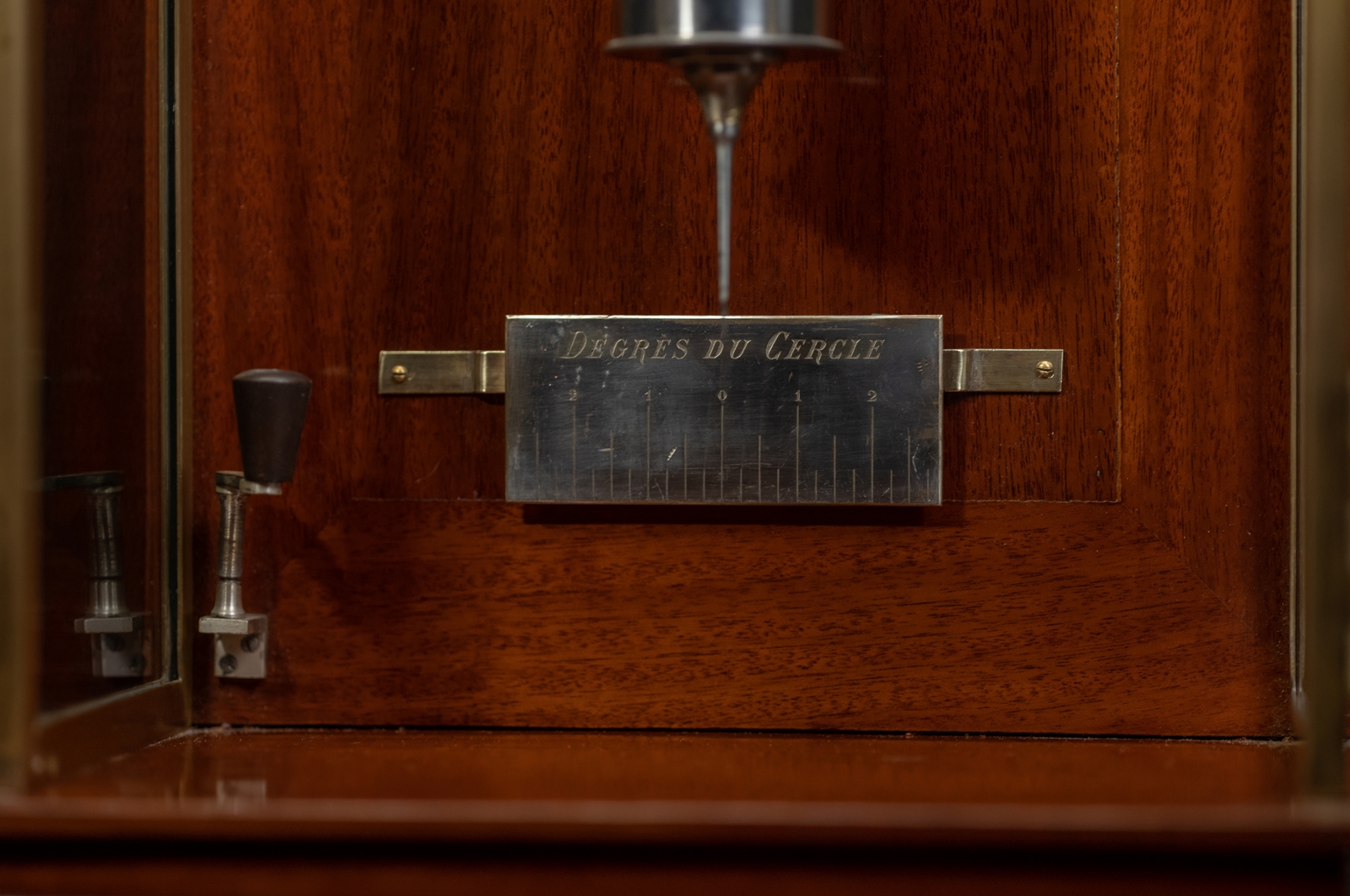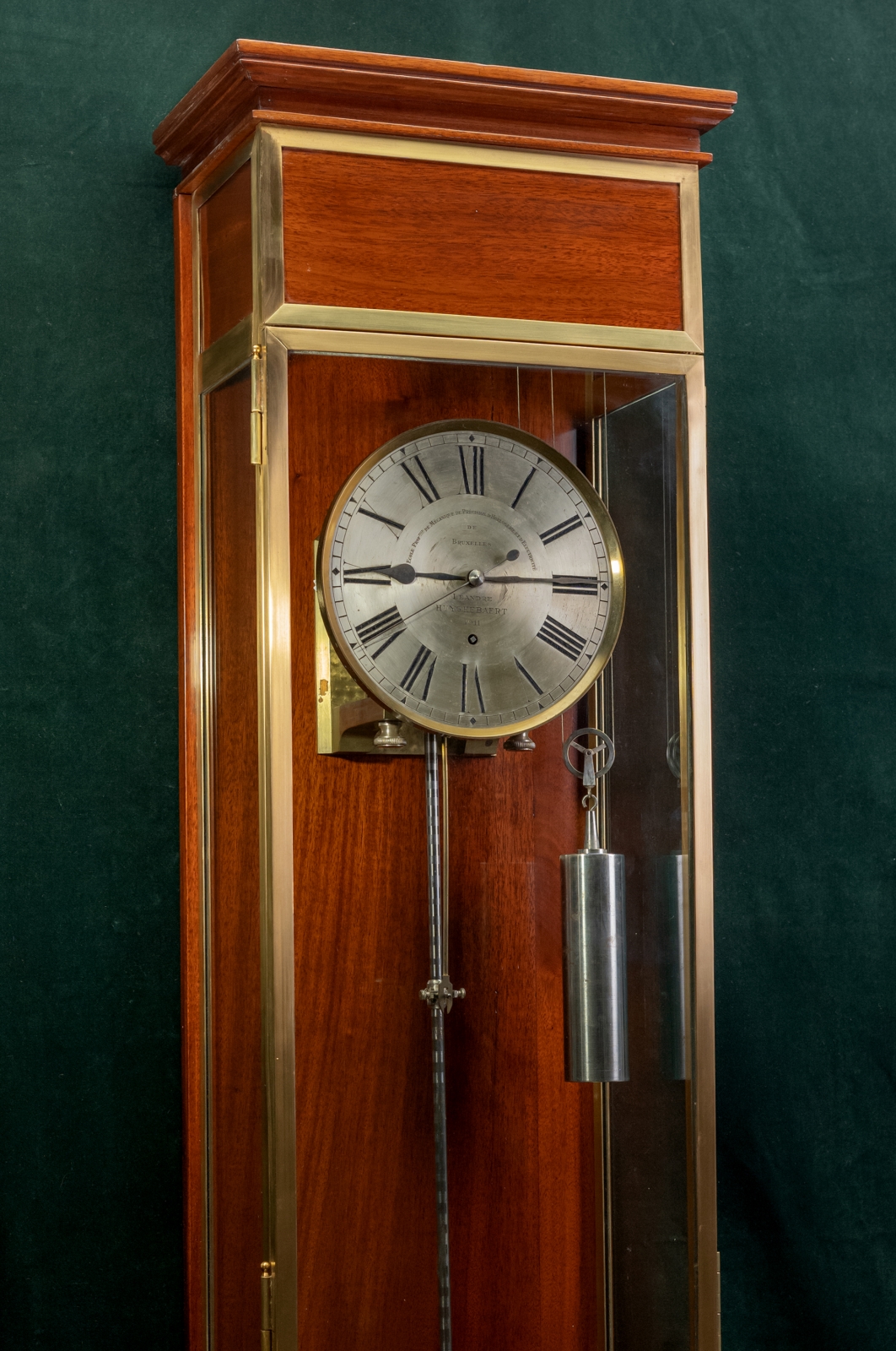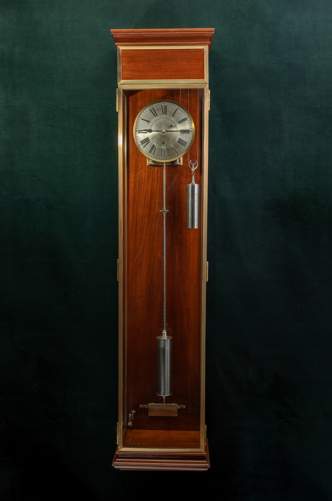 Hangende regulateur van sapeli mahonie met messing biezen. De nog origineel verzilverde wijzerplaat gesigneerd Leandre Huygebaert 1911 Ecole Professionnelle de Mécanique de Précision et d´ Electricité de Bruxelles. Meesterwerk van Huygebaert bij het afstuderen van zijn opleiding. Het uurwerk met centrale seconde wijzer loopt twee weken en heeft een lange temperatuur compensatie slinger, waarbij de slingerlens gevuld is met kwik.