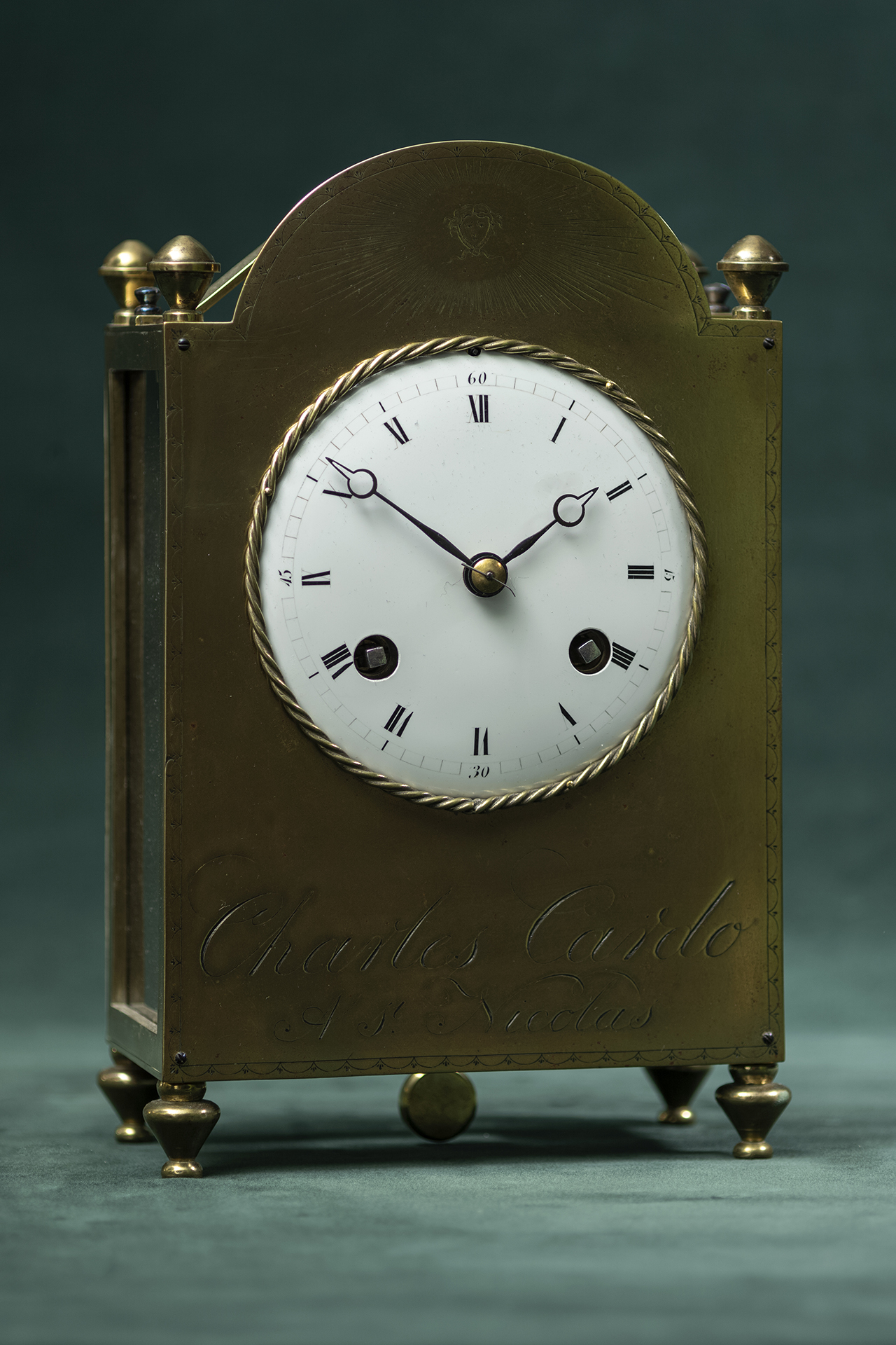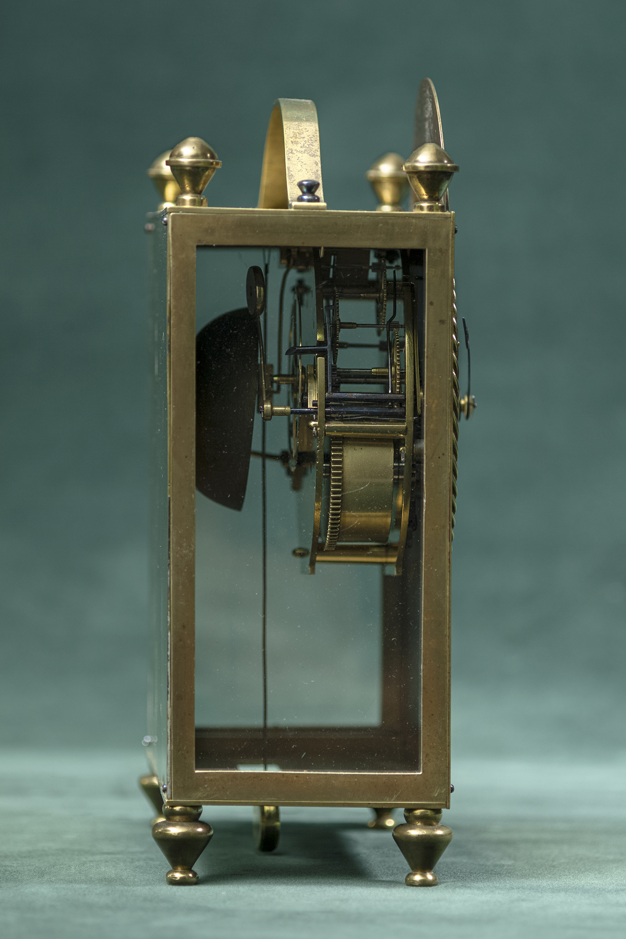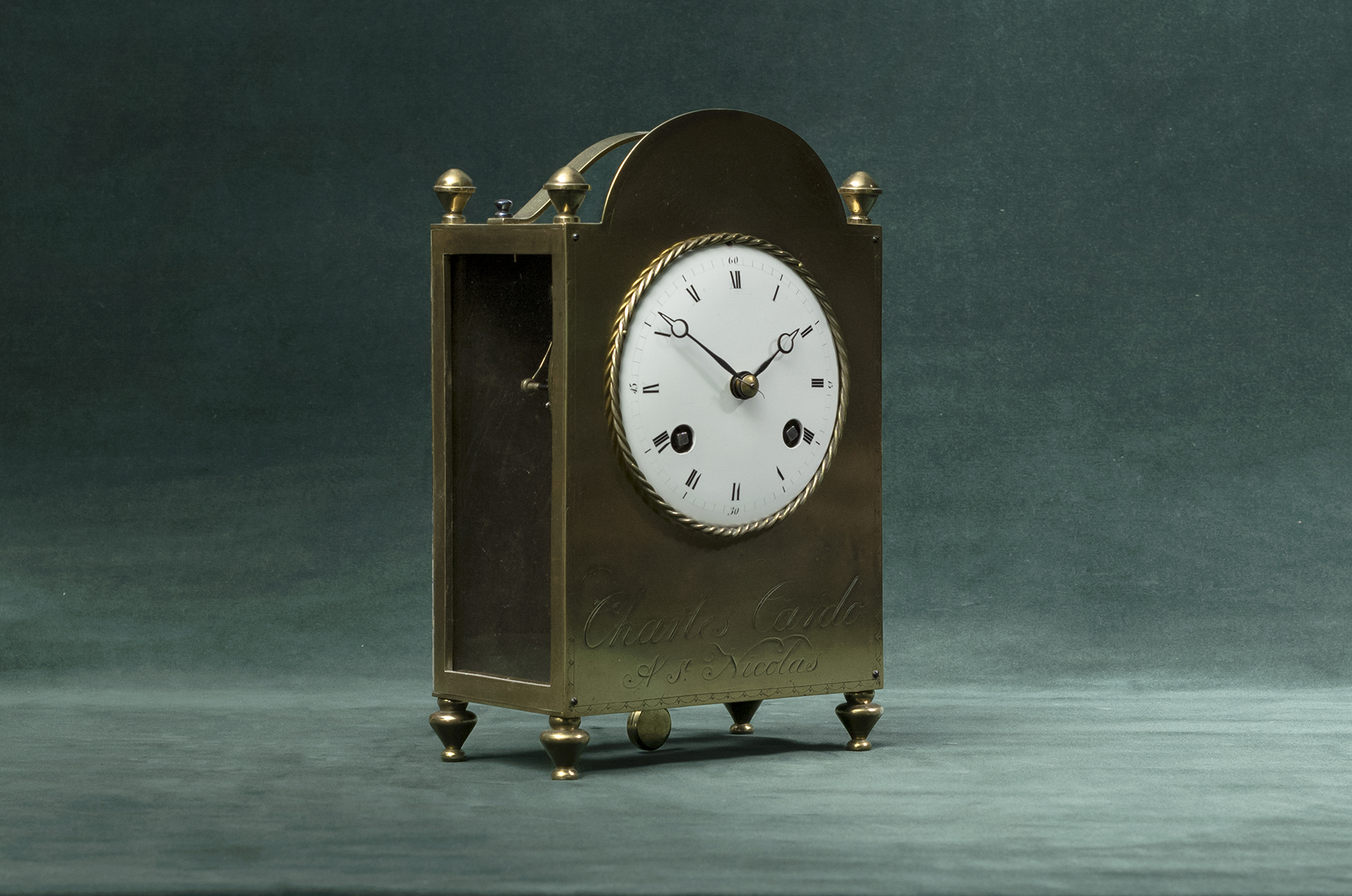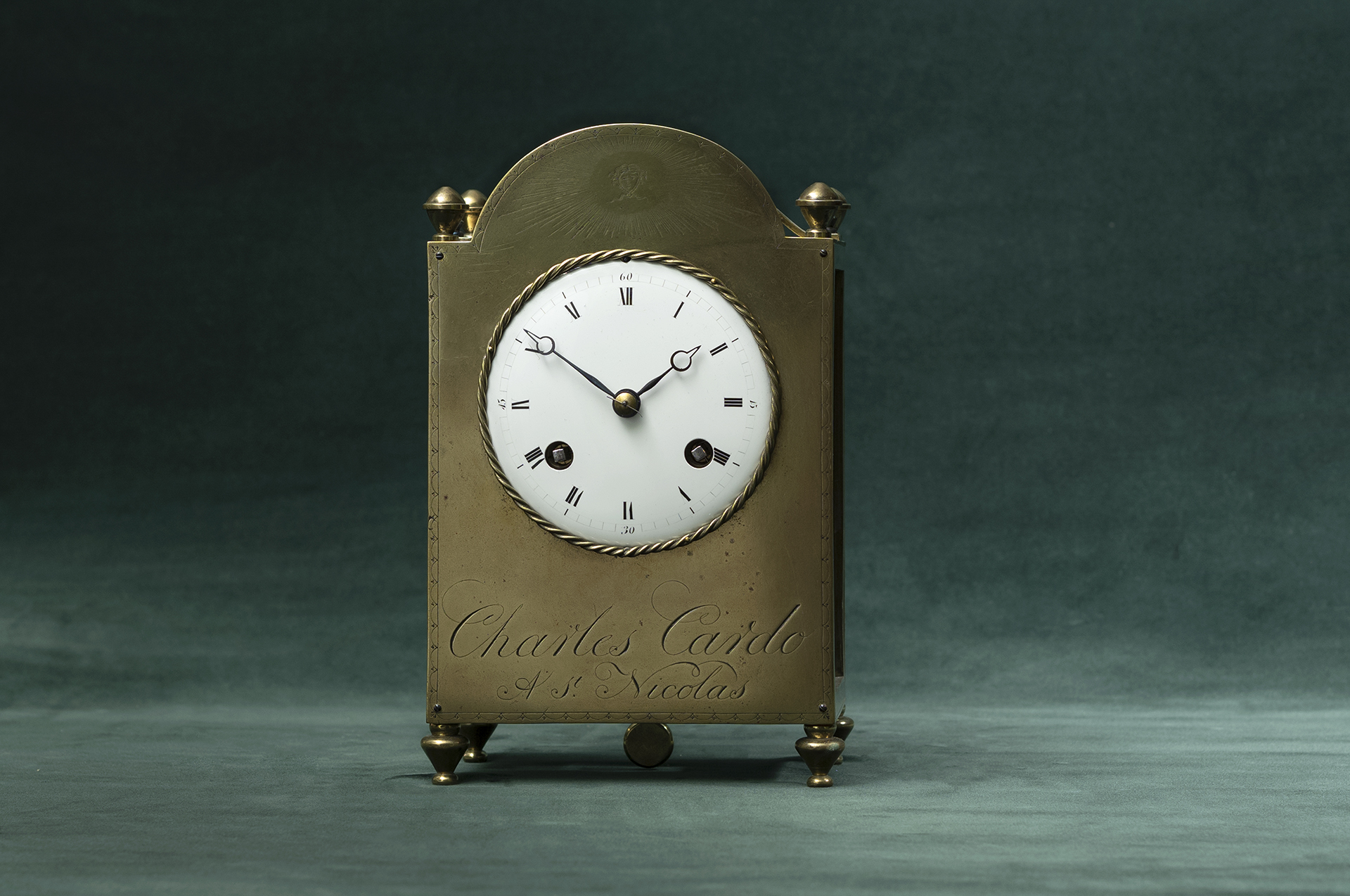 Messing kastje met glas aan de twee zijkanten. Wijzerplaat gesigneerd door de maker en met aan de bovenkant een kinderkopje met de zonnestralen. De geëmailleerde wijzerplaat met Romeinse cijfers heeft twee fraai opgewerkte Breguetwijzers. Het uurwerk is van Belgische makelij en loopt een week. Het heeft een gaandwerk en een slagwerk. Het slagwerk slaat de uren en de halfuren op een bel.