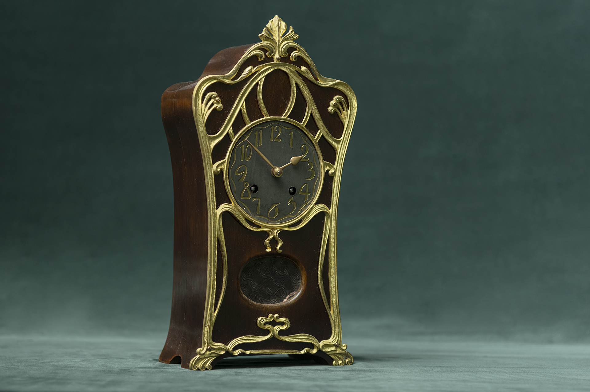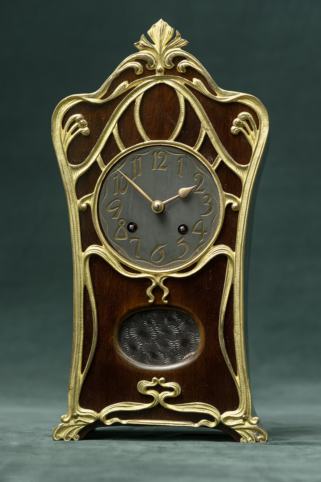 Houten gefineerd kastje, 34 cm hoog,18 cm breed en 10cm diep, met verguld frontornament uit één stuk. De wijzerplaat heeft typische Art Nouveau cijfers op een gematteerde grijze achtergrond.