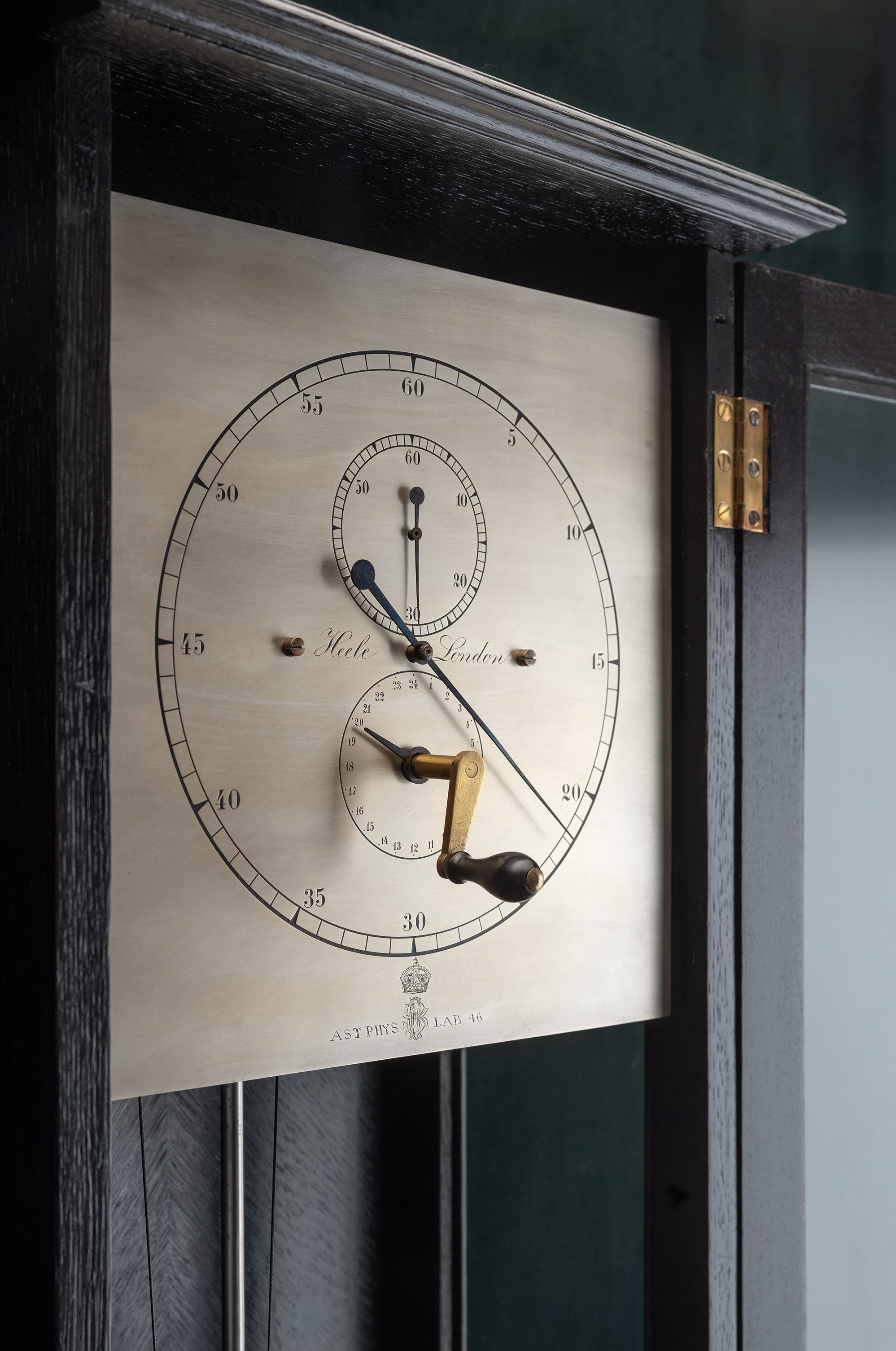 Heele was een Duitse Optische instrumenten bouwer. Hij maakte deze klok voor het Astro physics Laboratorium 46 in london zoals op de wijzerplaat te lezen is. Uurwerk met een zware compensaitie slinger heeft 4 met robijnen gelagerde assen en loopt een week. Het uurwerk staat in een gezwarte eiken kast met glas aan de zijkanten. De wijzerplaat is opgedeeld in drie wijzerplaten, een centrale minuten wijzer, van boven de seconde wijzer en van onder de uur wijzer die in een 24 uren schaal is aangeduid. Het koperen gewicht dat aan de zijkant van de kast loopt zorgt ervoor dat de klok een week loopt. De breedte van de kast 34,5 cm, de hoogte is 129 cm en de diepte is 23,5 cm.
