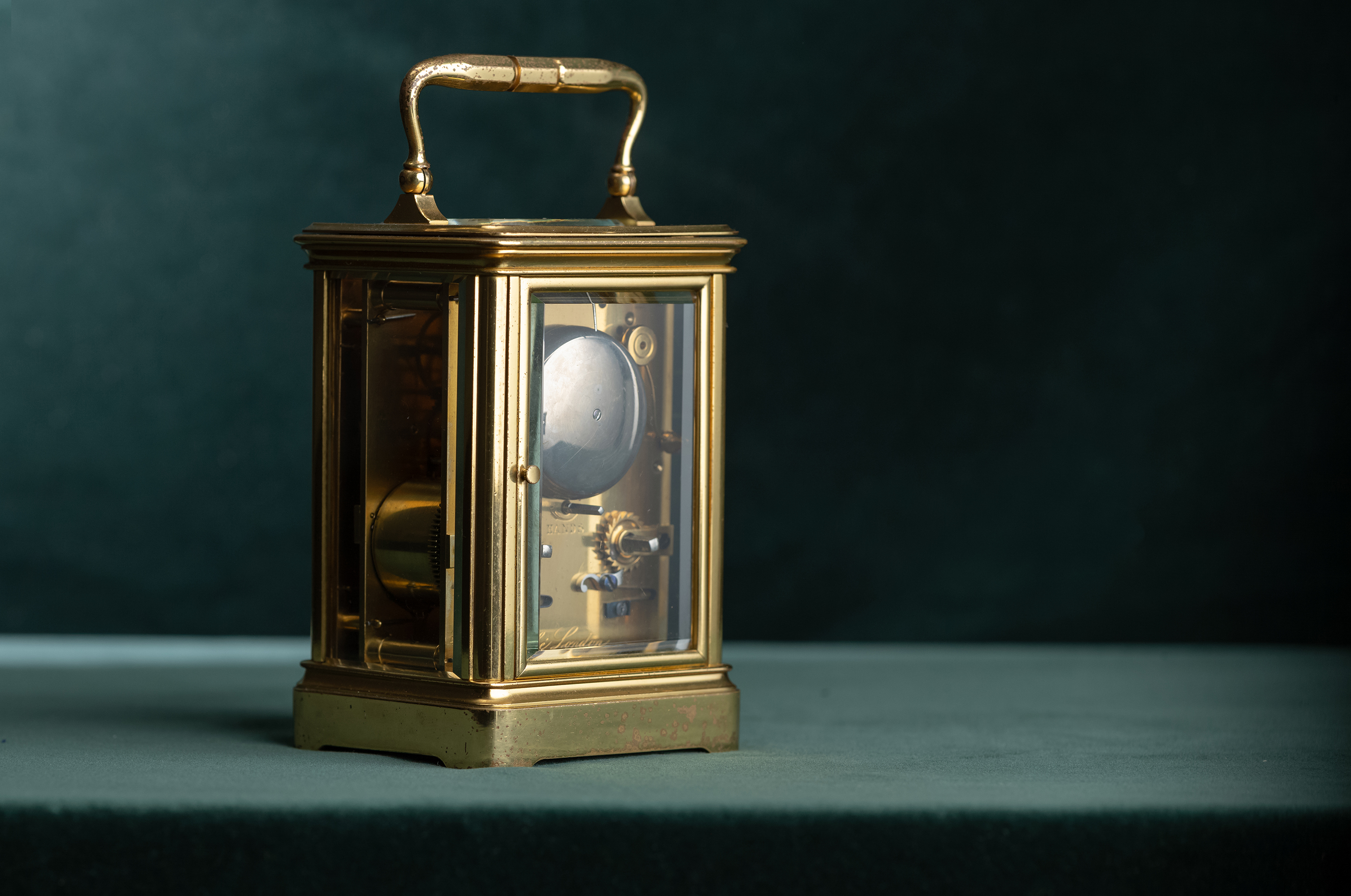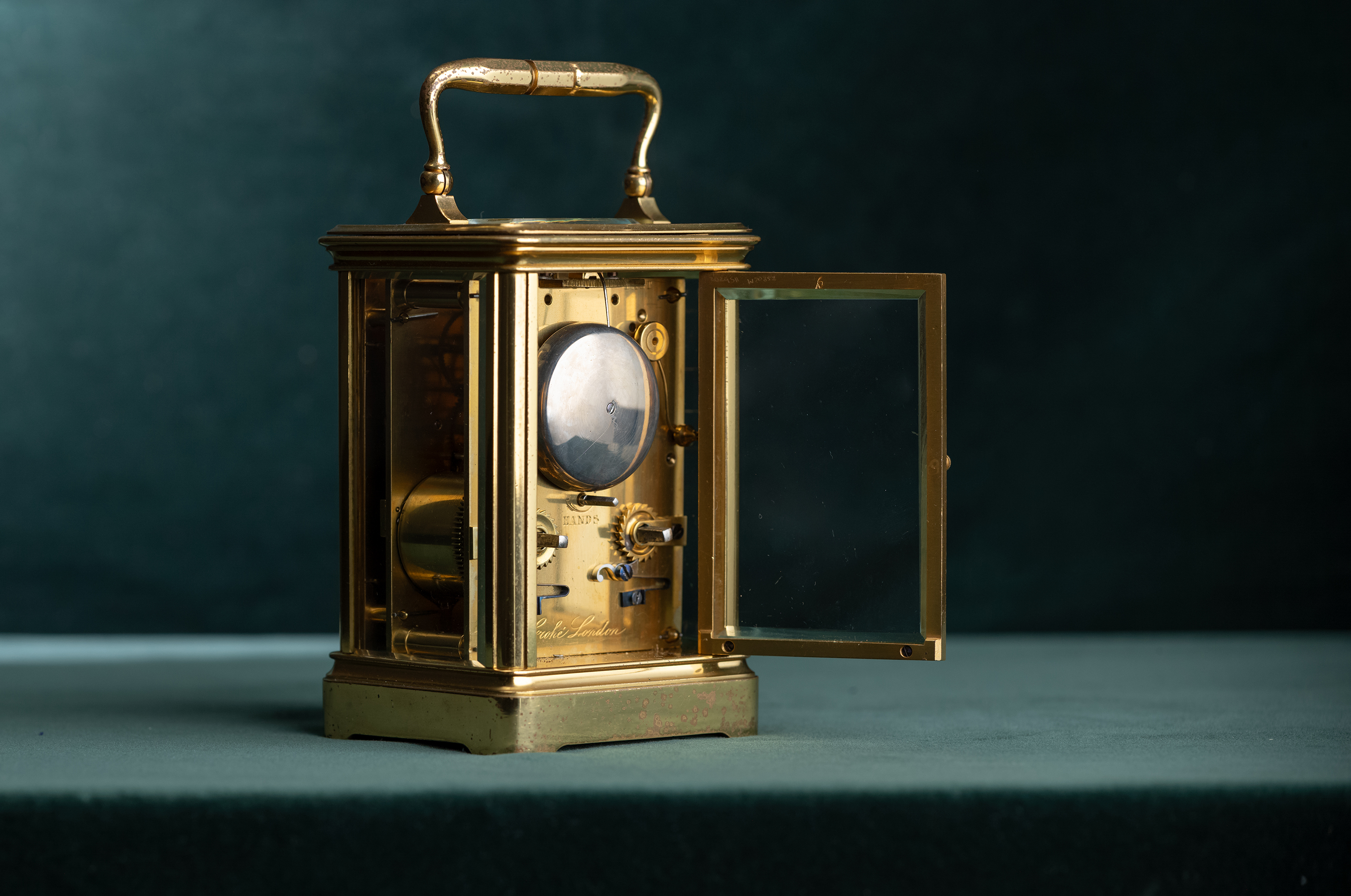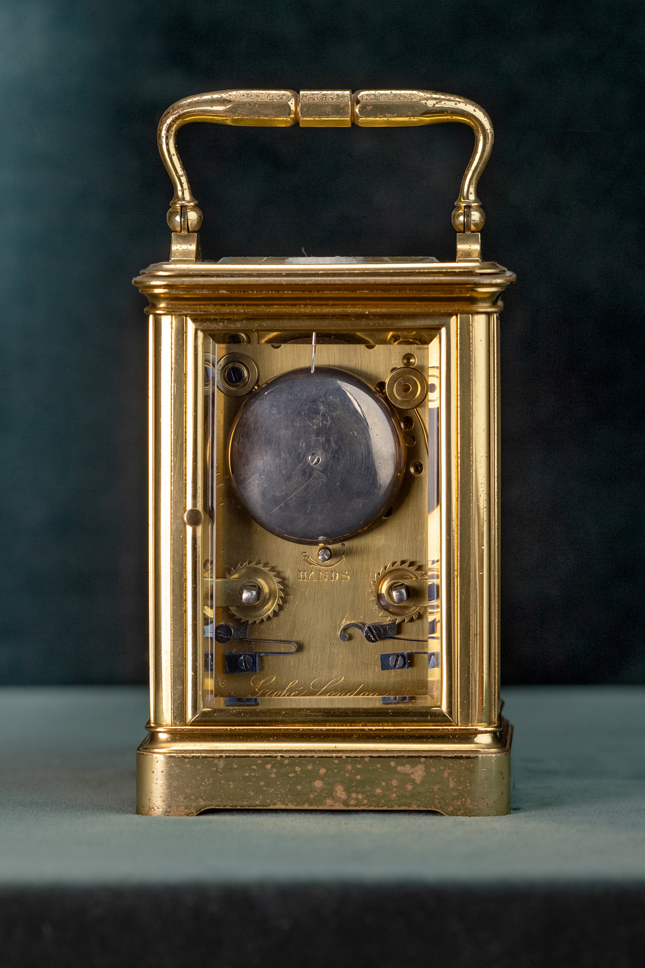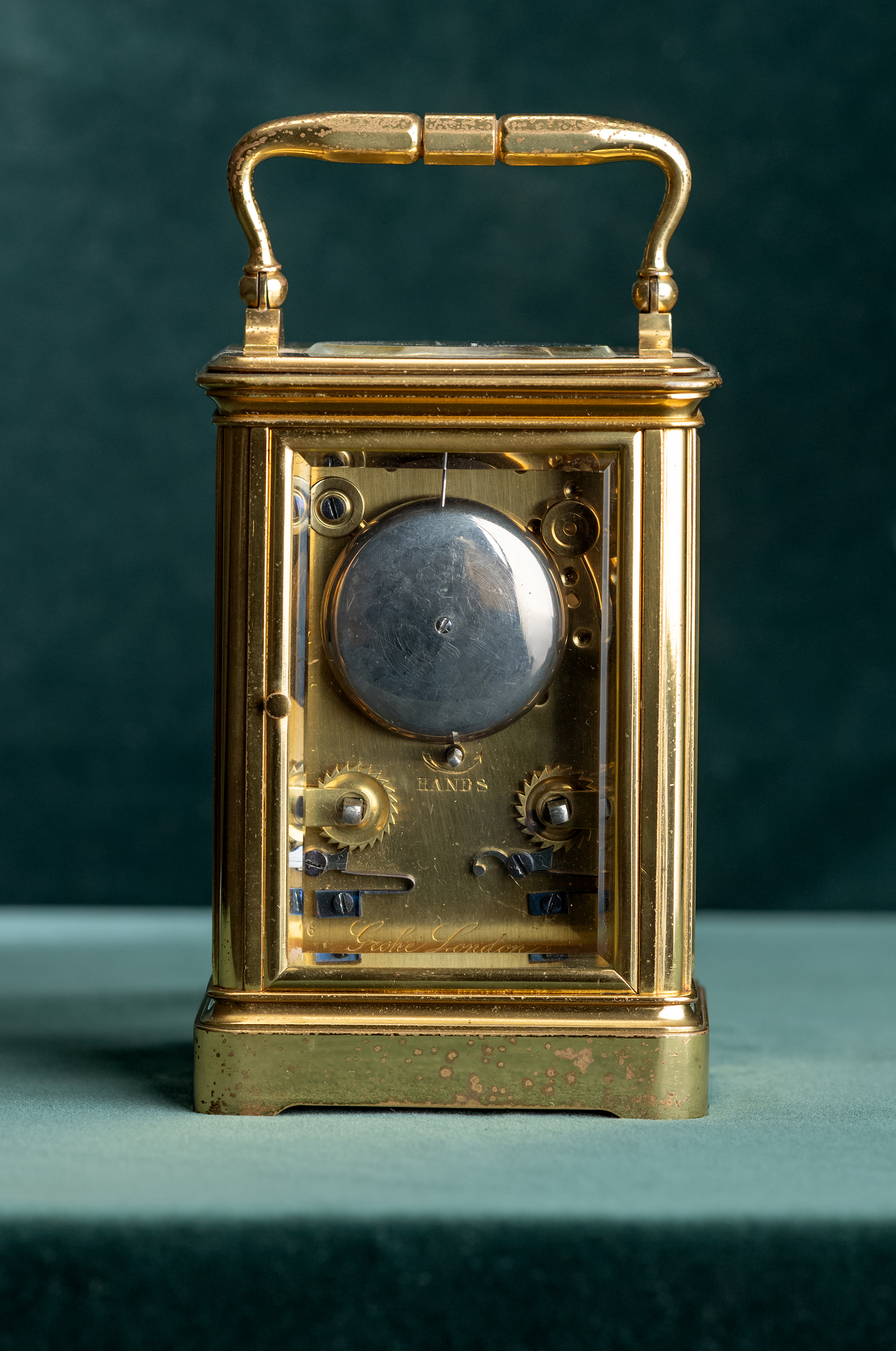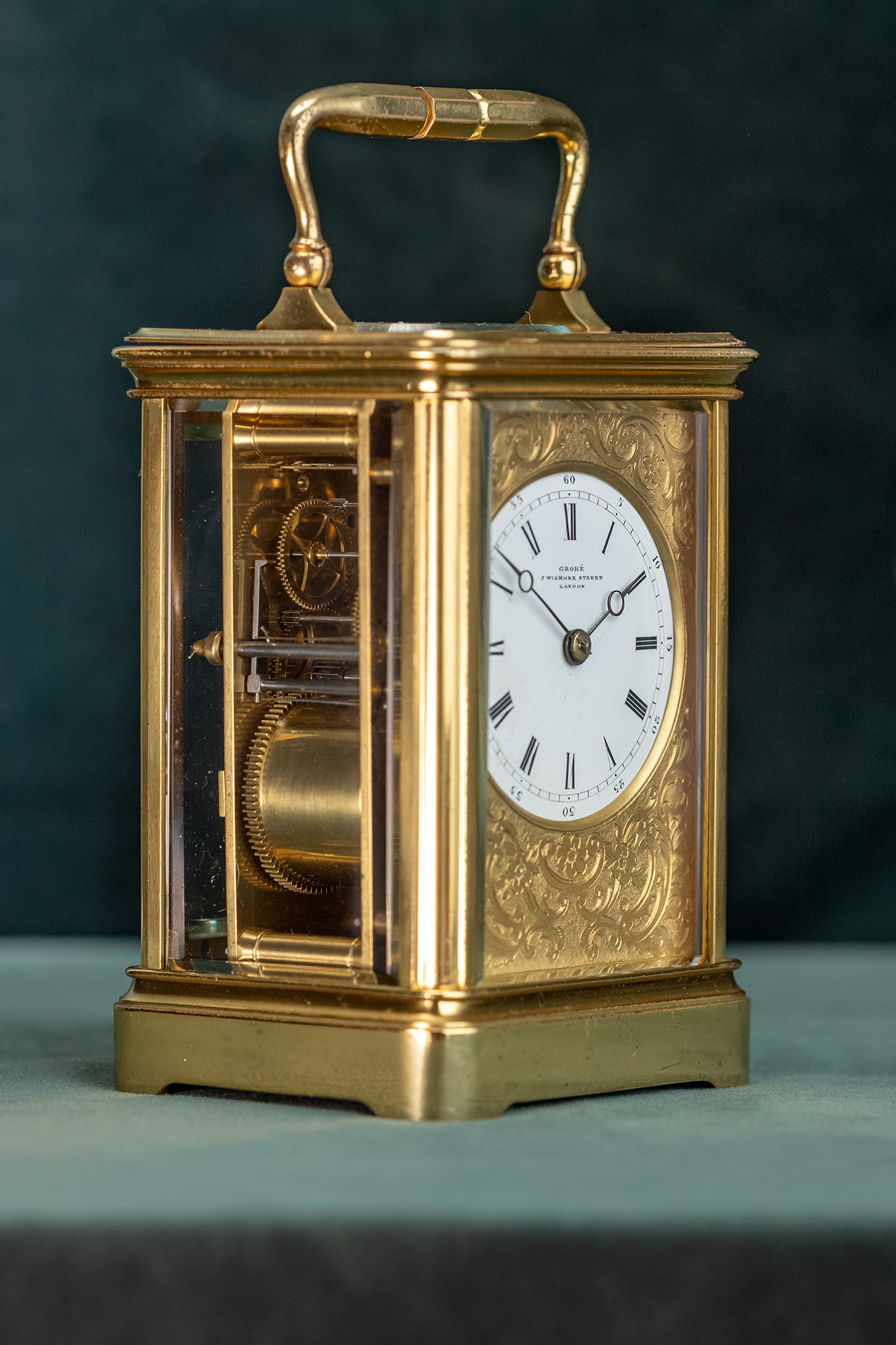 Reisklok gesigneerd Grohe 7 Wigmore street London. Gaandwerk en slagwerk op een belletje. Het klokje heeft een loopduur van een week. Het messing kastje heeft gefaceteerde glazen. Op de emaillen wijzerplaat staan Romeinse cijfers en Breguet wijzers die de tijd aangeven. Daarrond is een zeer fraai gegraveerde front plaat. De hoogte ( met handvat ) is 16 cm, breedte 8,5 cm en diepte 7,5 cm.