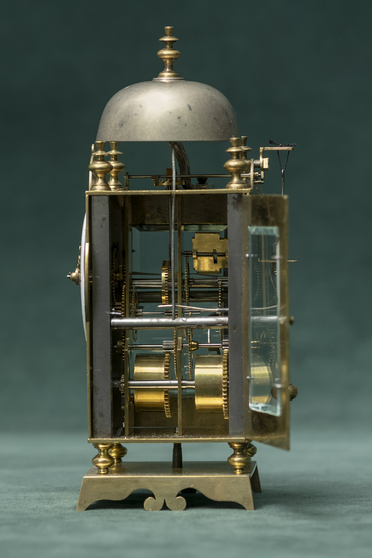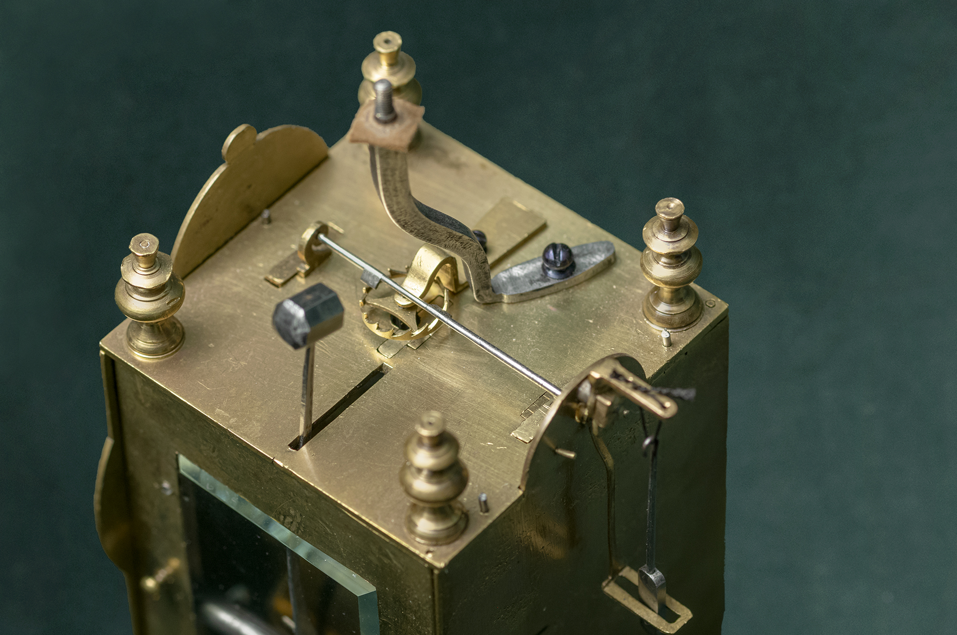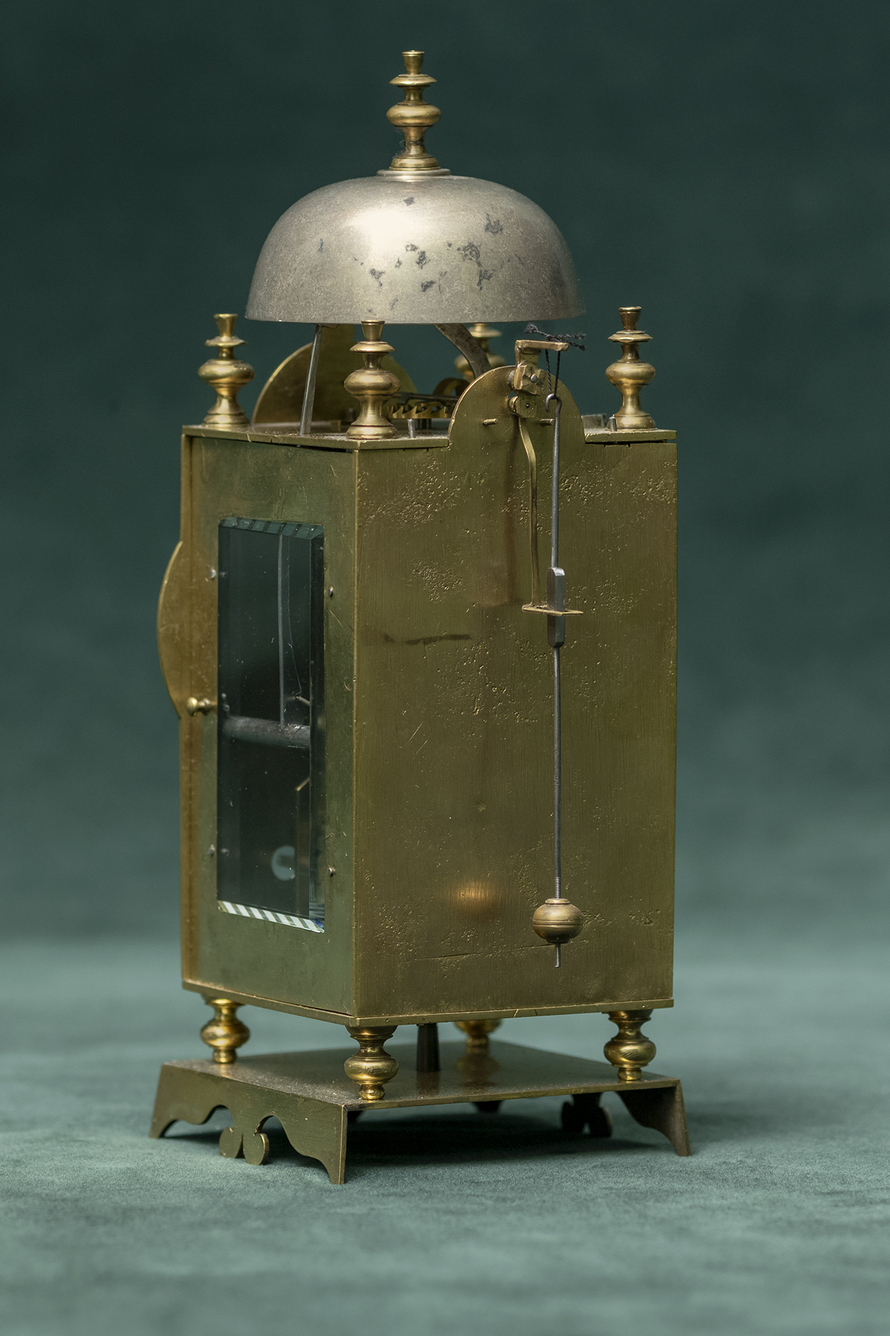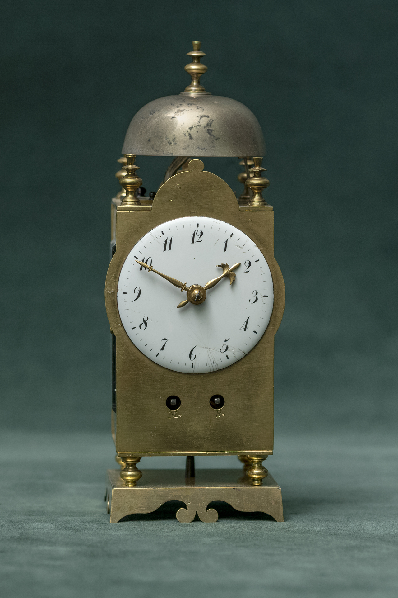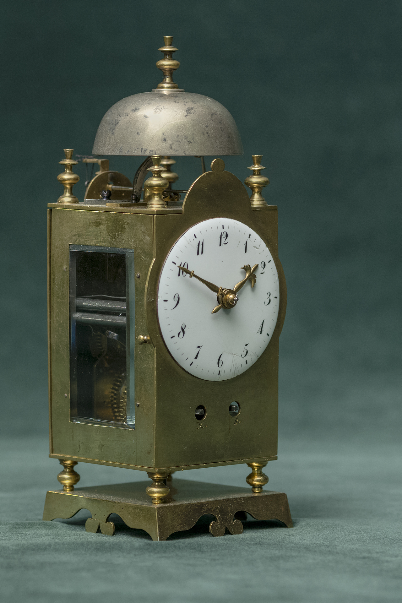 Zeer uitzonderlijk klein klokje met gaand en slagwerk uit de streek van de Jura/ Doubs in het oosten van Frankrijk. Het messing kastje met twee deurtjes met gefaceteerde glazen is 16 cm hoog, 6 cm breed en 6 cm diep. Het klokje heeft een gaandwerk met een loopduur van twee dagen en een slagwerk dat slaat op de uren en halfuren op de bel. Het uurwerkje heeft een voor dit model van klokjes zeer uitzonderlijke spillegang