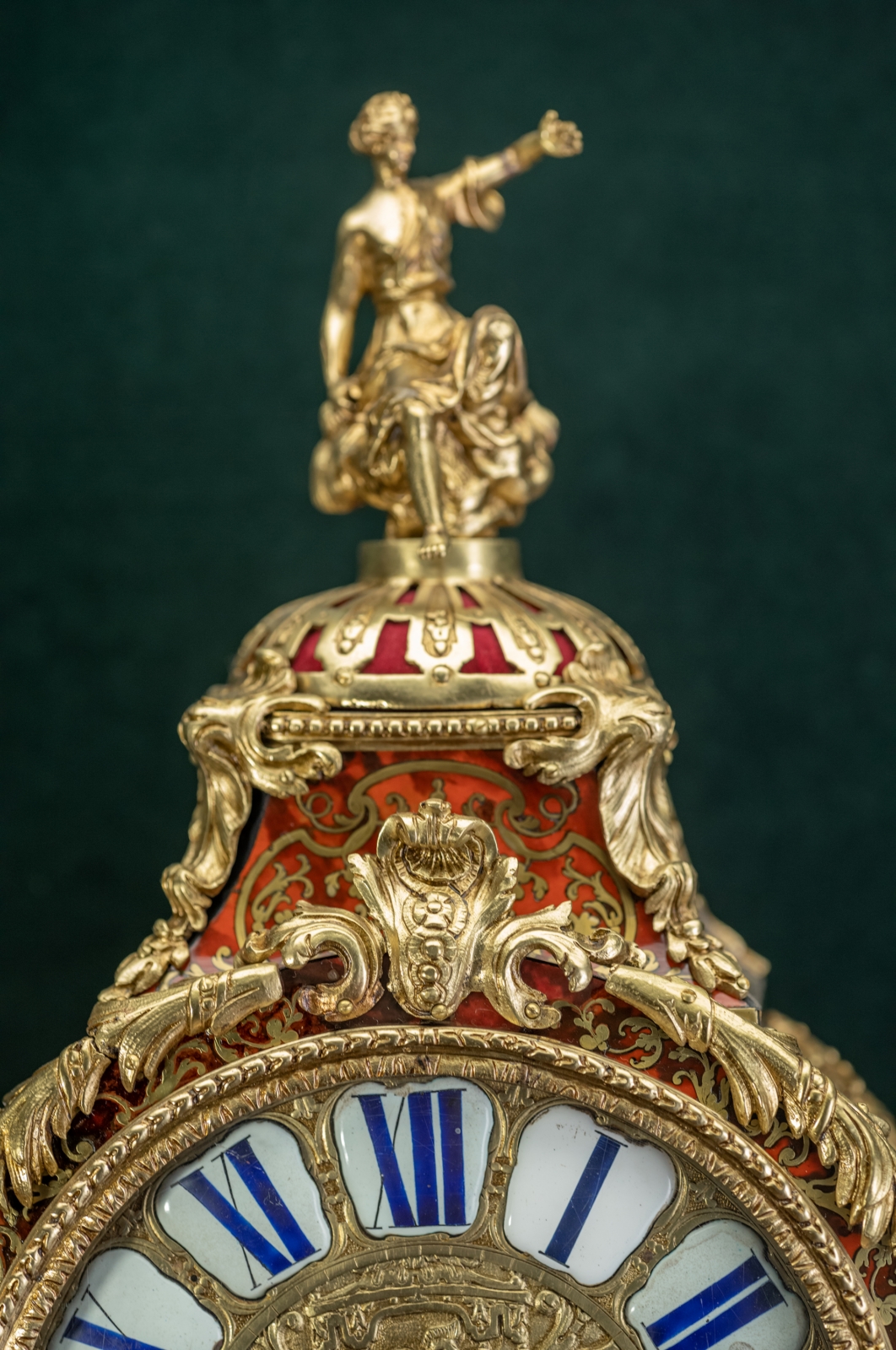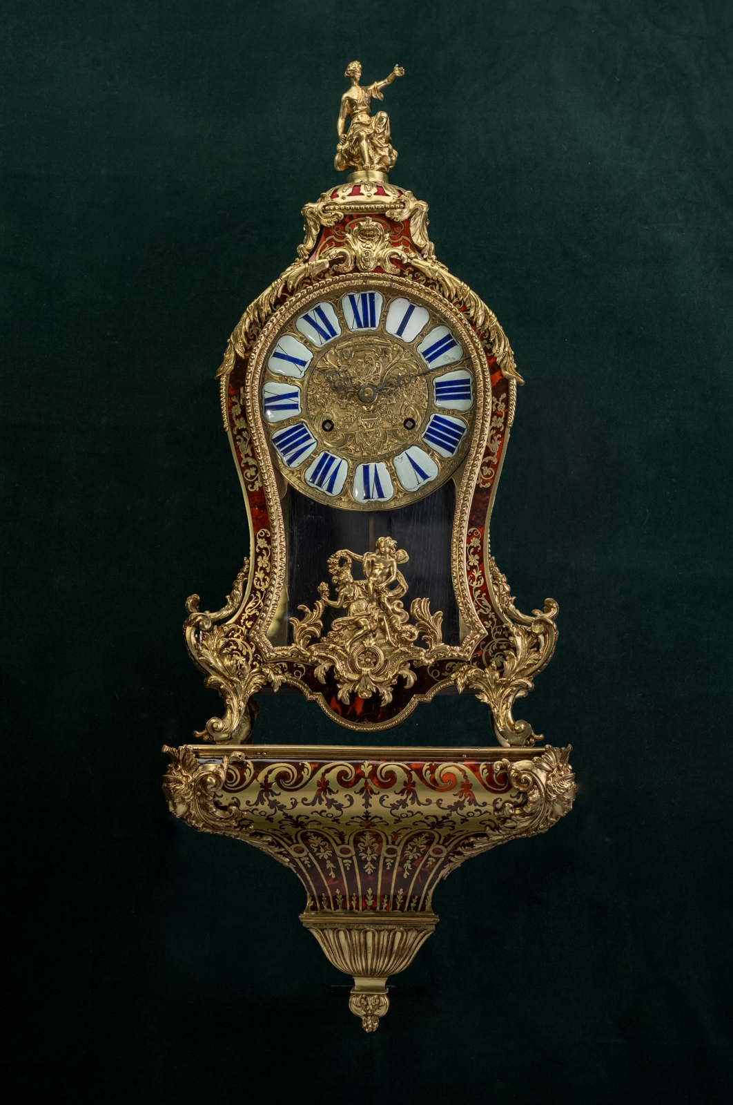 De messing wijzerplaat heeft 12 emaillen cartouches met Romeinse cijfers en ijzeren wijzers. Groot 18e eeuws uurwerk dat een week loopt met een slagwerk dat de hele uren en halve uren slaat op een bel. Totale hoogte van de klok en console is 97 cm en de breedte van de console 39 cm en diepte is 20 cm