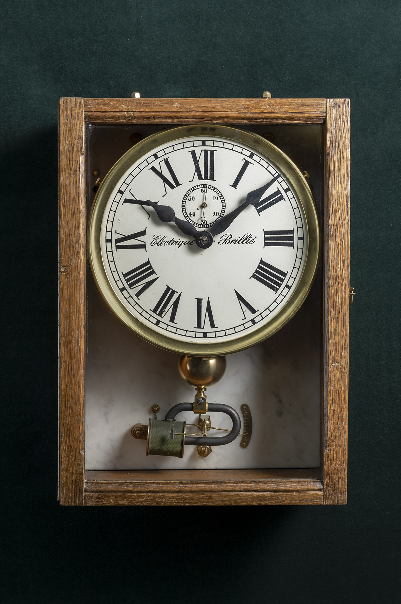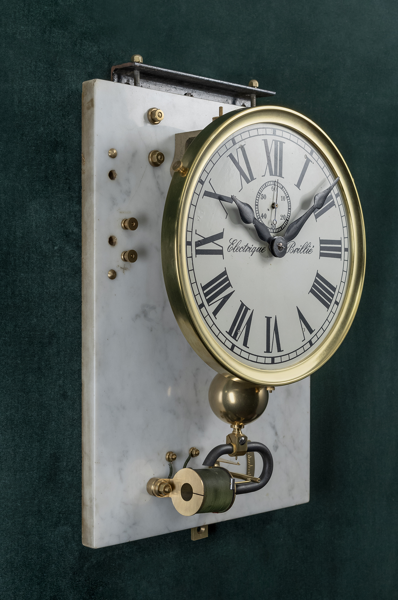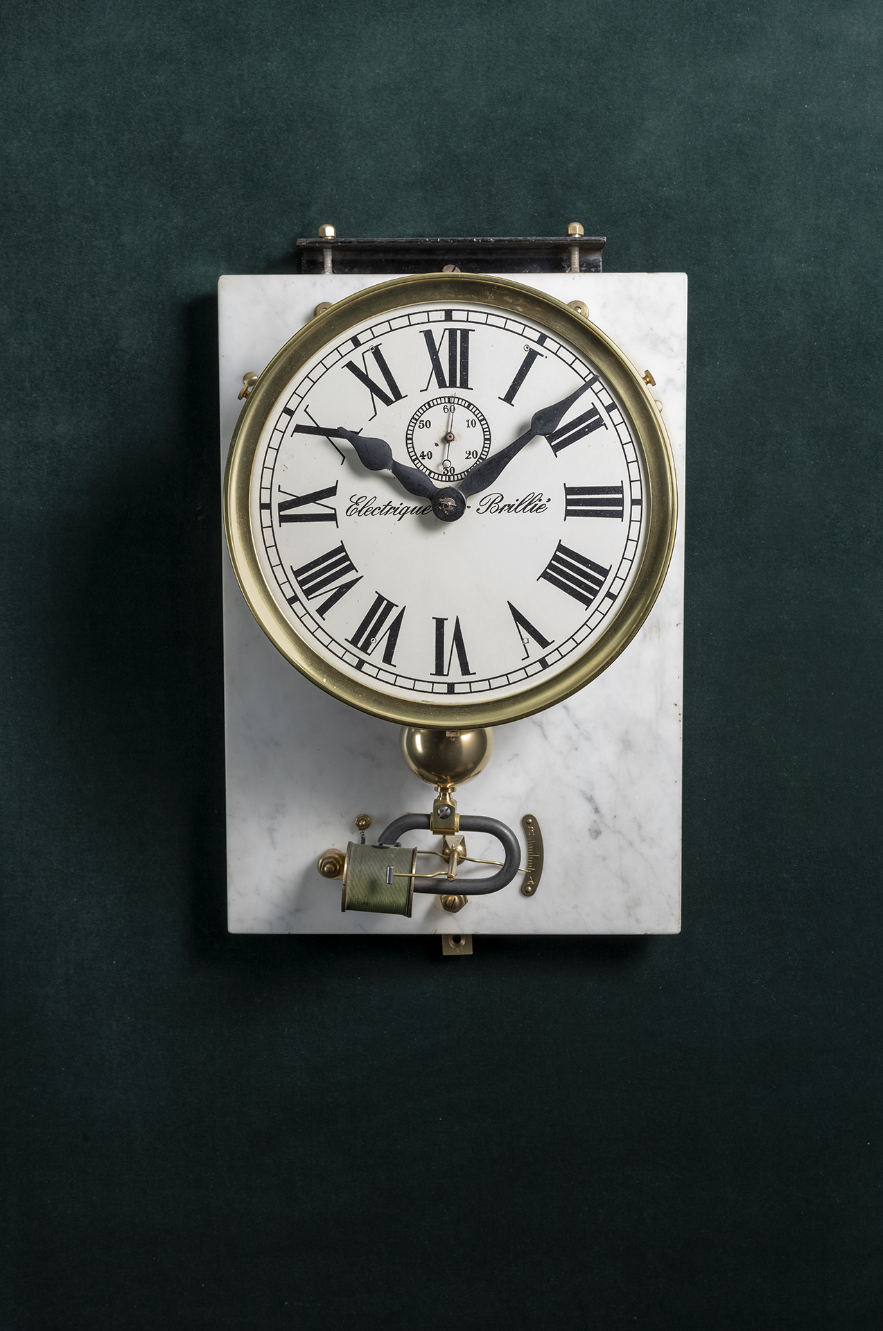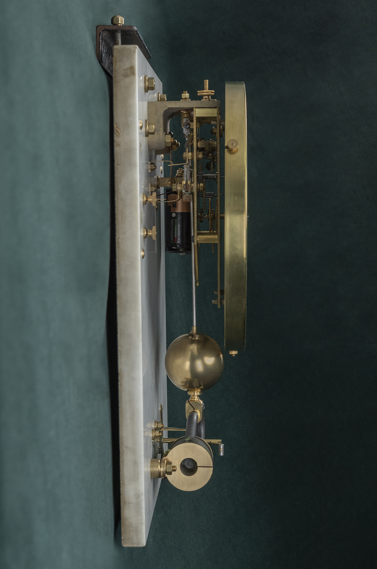 Wandklok met fraaie marmeren achterplaat waar het uurwerk op gemonteerd is. Brille uurwerk dat aangedreven wordt door een kleine moderne batterij. Eikenhouten kap met glasdeur aan de voorkant.