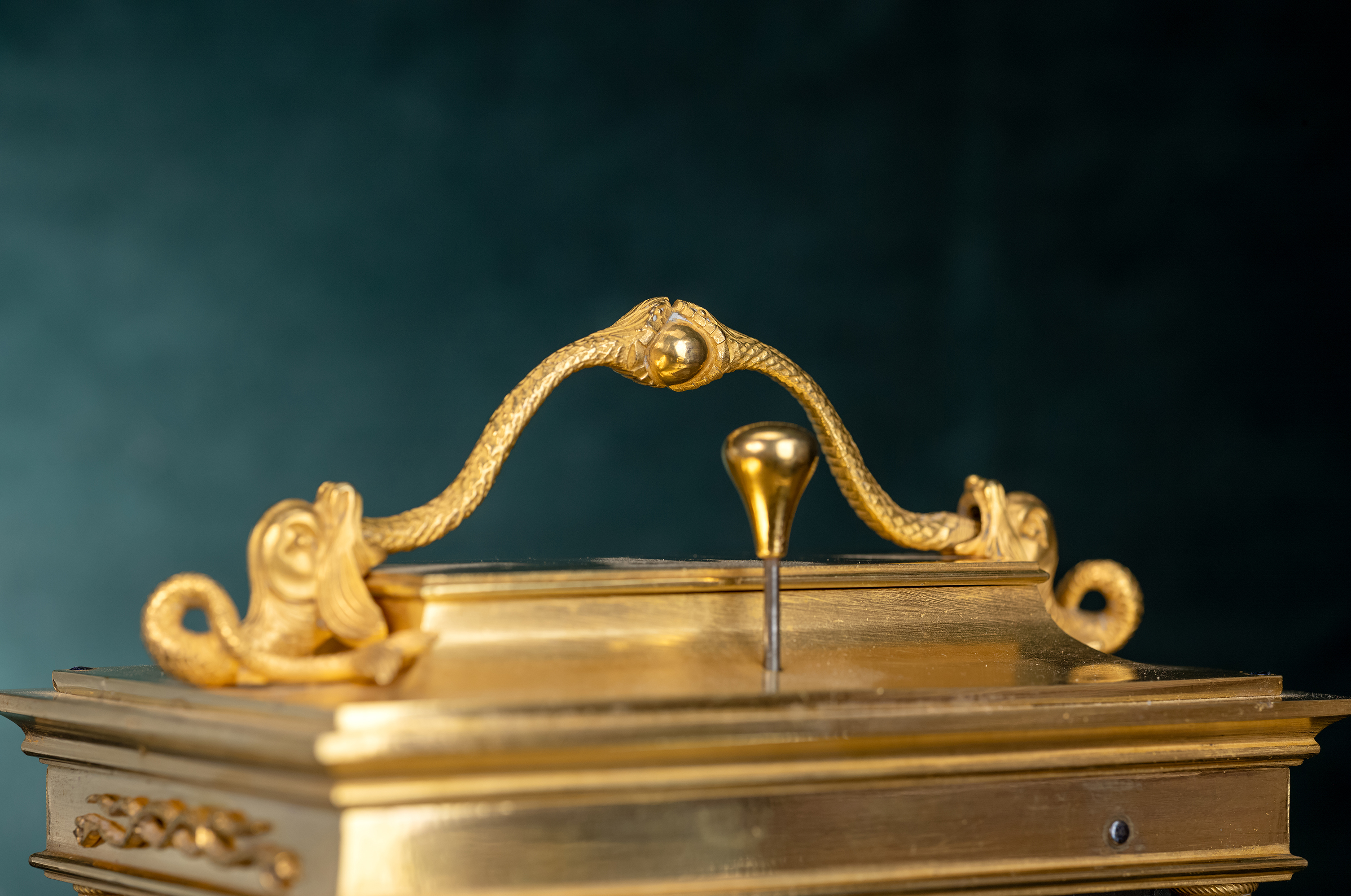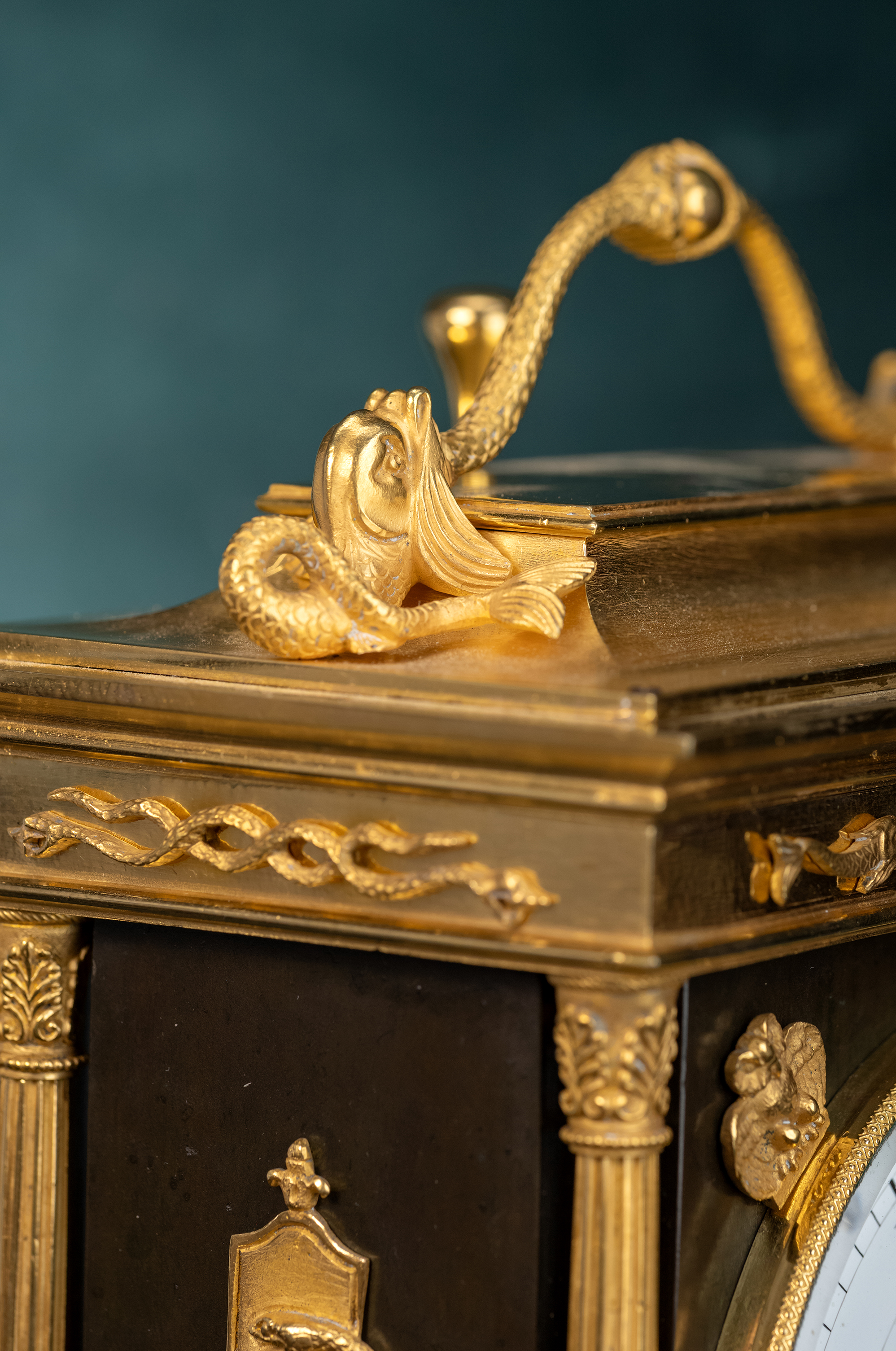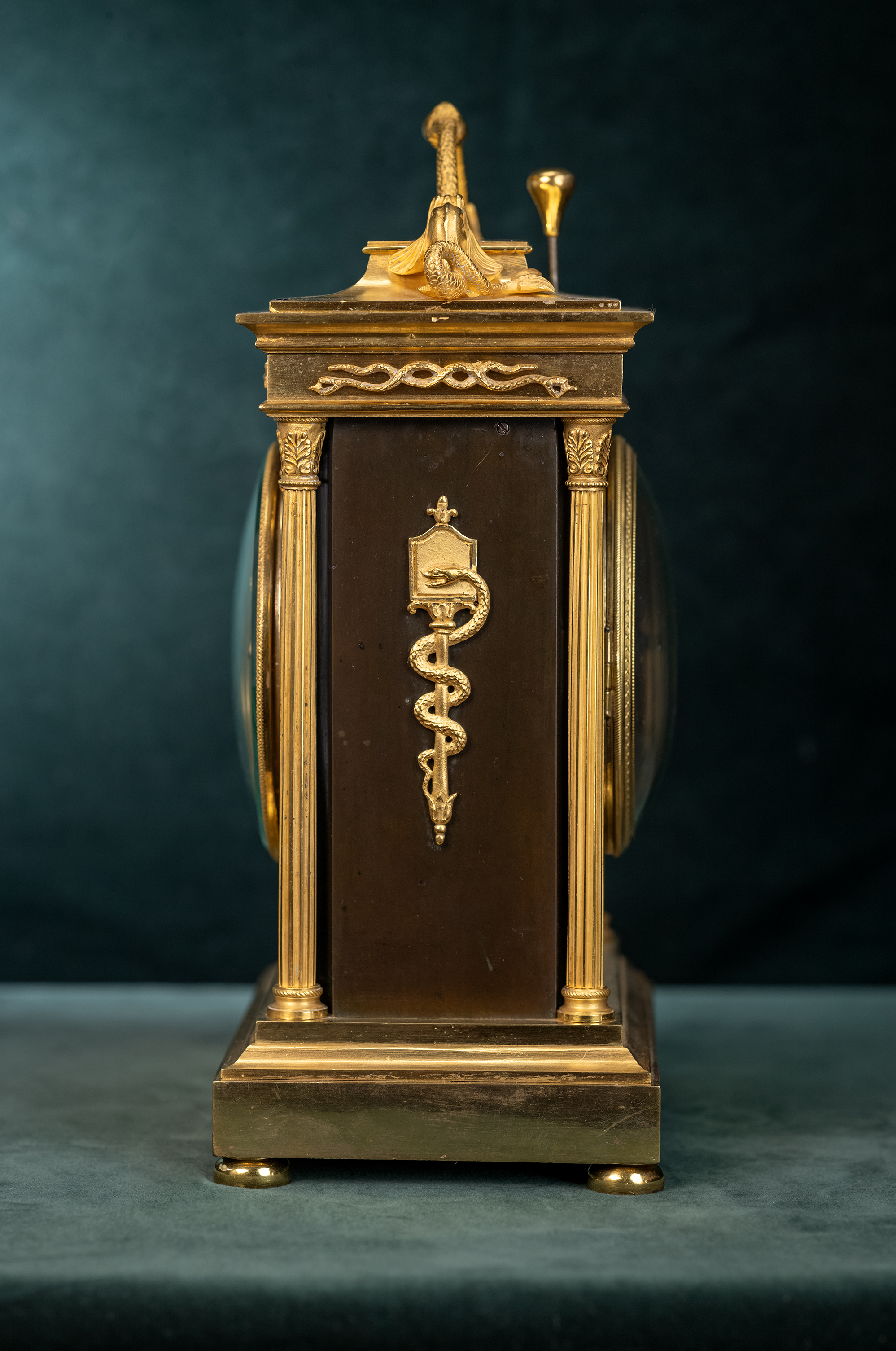 Het ronde messing pendule uurwerk heeft een loopduur van een week. Het heeft een duplex gang systeem met balans als regelorgaan. Het uurwerk heeft een half uur slag op een bronzen bel. Tevens beschikt het klokje over een wekker functie die door een geblauwd stalen wijzer is in te stellen op de wijzerplaat. Ook heeft het klokje nog een uren en kwartieren slagwerk op aanvraag voor de nacht om te weten te komen hoe laat het is. Dit kan door de grote knop bovenop geregeld worden. De messing gegoten kast is grotendeels vuurverguld en gedeeltelijk bruin gebronsd. Op de hoeken van de kast zitten Dorische zuilen met een vergulde onder voet met vier gegoten poten. Onder de emaillen wijzerplaat staan twee griffioenen en boven de wijzerplaat twee uilen. In de fries boven de wijzerplaat staan twee vissen afgebeeld en medusa. Boven op de kast zit een draagbeugel die scharniert in de bek van de twee vissen die bevestigd zijn boven op de kast. De wit emaillen wijzerplaat heeft Romeinse cijfers en een signatuur in goud. De tijd wordt aangegeven door twee messing vergulde wijzers. (achter op de wijzerplaat zit een etiket van de emailleur Dubison) Hoogte 26,50 cm, breedte 17,30 cm en diepte 11,50 cm.