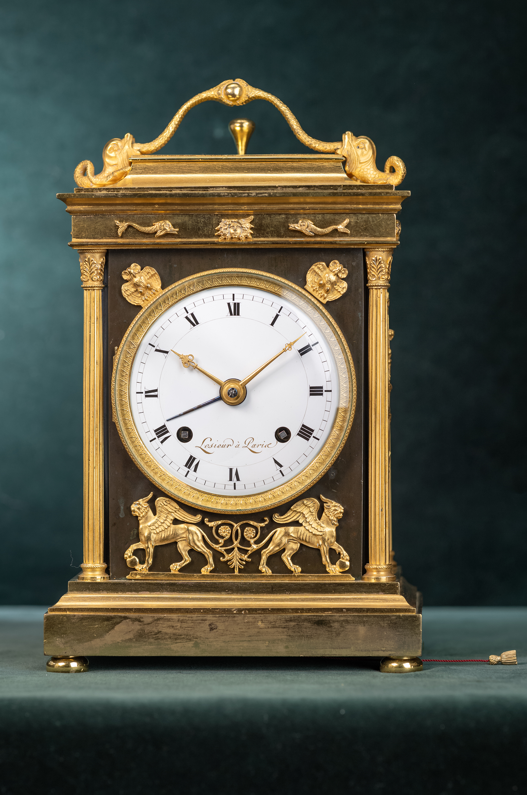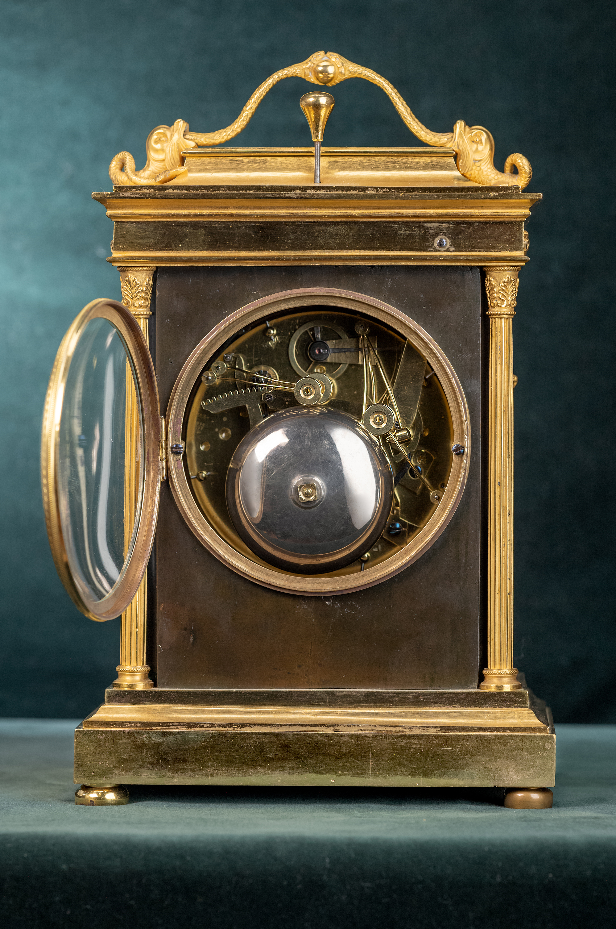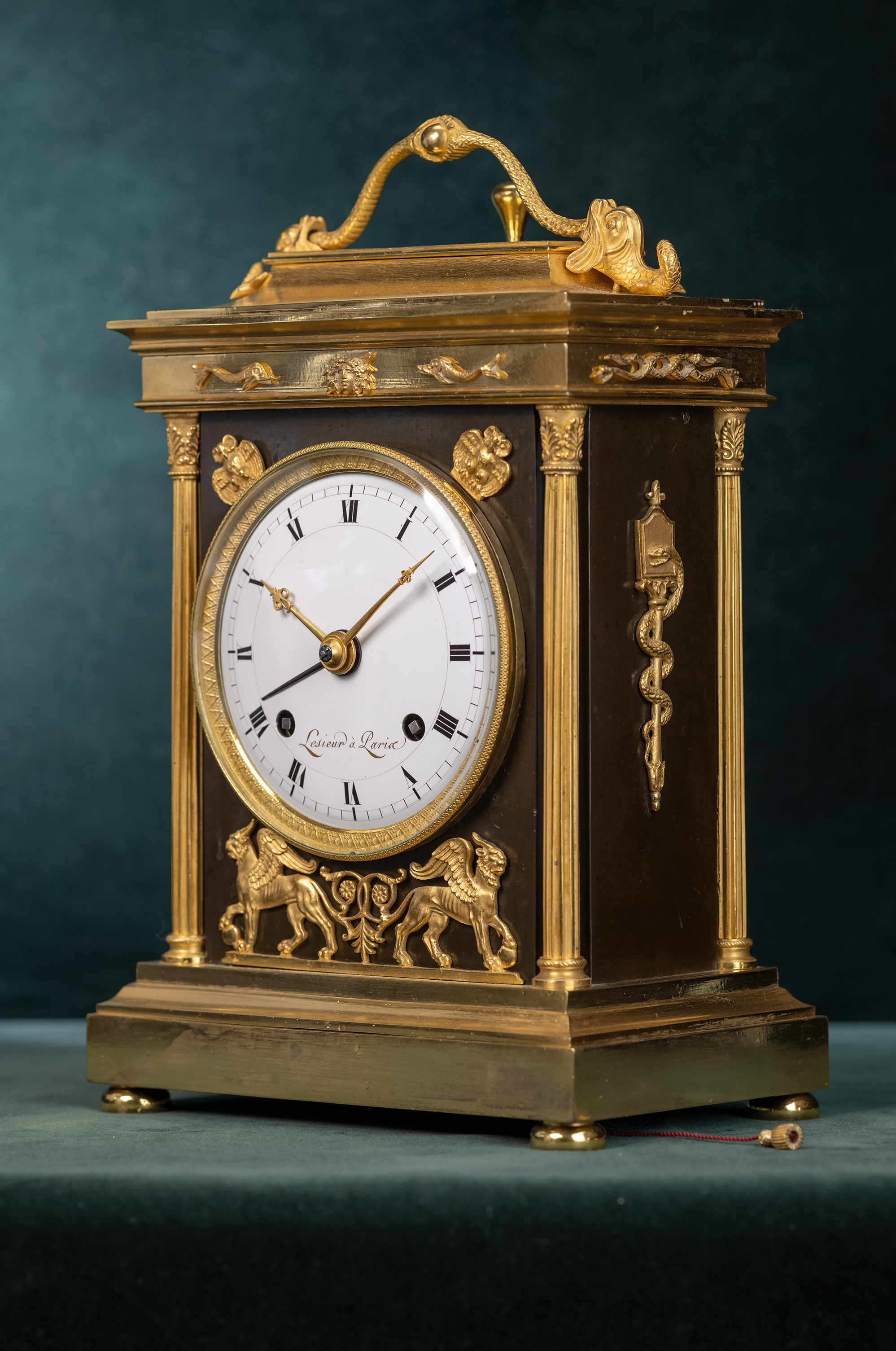 Het ronde messing pendule uurwerk heeft een loopduur van een week. Het heeft een duplex gang systeem met balans als regelorgaan. Het uurwerk heeft een half uur slag op een bronzen bel. Tevens beschikt het klokje over een wekker functie die door een geblauwd stalen wijzer is in te stellen op de wijzerplaat. Ook heeft het klokje nog een uren en kwartieren slagwerk op aanvraag voor de nacht om te weten te komen hoe laat het is. Dit kan door de grote knop bovenop geregeld worden. De messing gegoten kast is grotendeels vuurverguld en gedeeltelijk bruin gebronsd. Op de hoeken van de kast zitten Dorische zuilen met een vergulde onder voet met vier gegoten poten. Onder de emaillen wijzerplaat staan twee griffioenen en boven de wijzerplaat twee uilen. In de fries boven de wijzerplaat staan twee vissen afgebeeld en medusa. Boven op de kast zit een draagbeugel die scharniert in de bek van de twee vissen die bevestigd zijn boven op de kast. De wit emaillen wijzerplaat heeft Romeinse cijfers en een signatuur in goud. De tijd wordt aangegeven door twee messing vergulde wijzers. (achter op de wijzerplaat zit een etiket van de emailleur Dubison) Hoogte 26,50 cm, breedte 17,30 cm en diepte 11,50 cm.