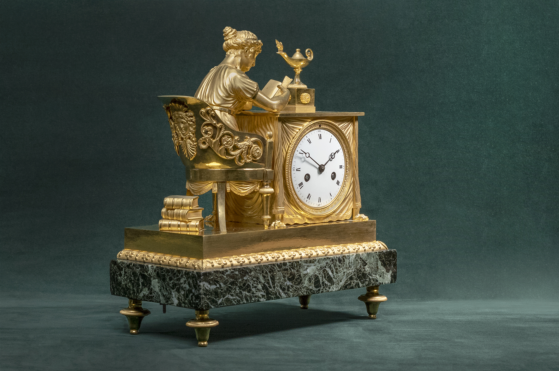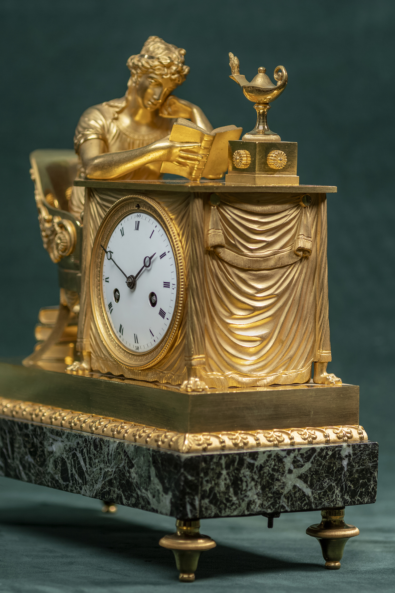 Vuurvergulde pendule naar model van Jean-André Reiche met een groen marmeren voet.