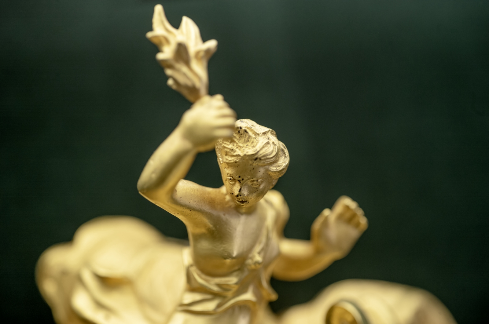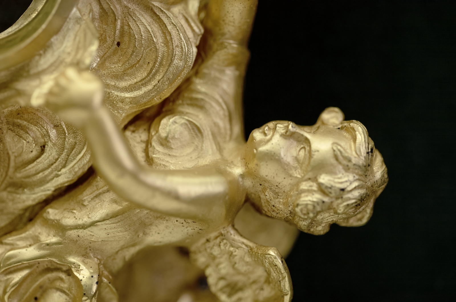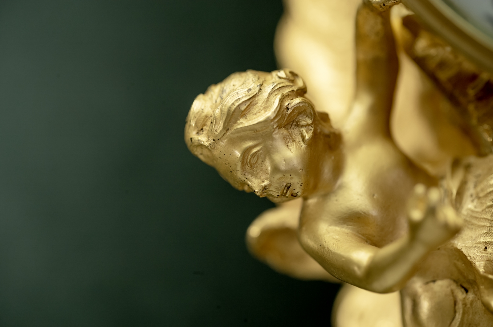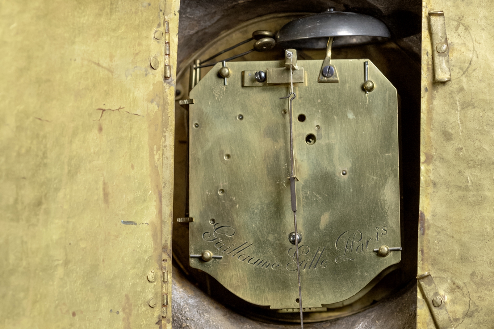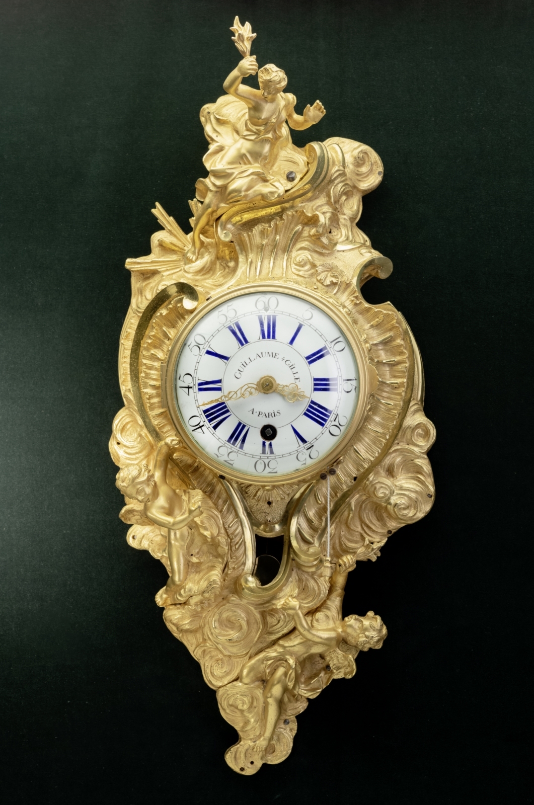 Franse Lodewijk XVI vergulde kartelklok gesigneerd Guillaume Gilles, circa 1785-1790. Het uurwerk heeft ankergang met slinger, is veeraangedreven, 8-daags werk. Slagwerk op bel op aanvraag en grande sonnerie. Emaillen wijzerplaat met blauwe Romeinse cijfers. Het uurwerk is ook op achterzijde gesigneerd. Totale hoogte 55 cm.