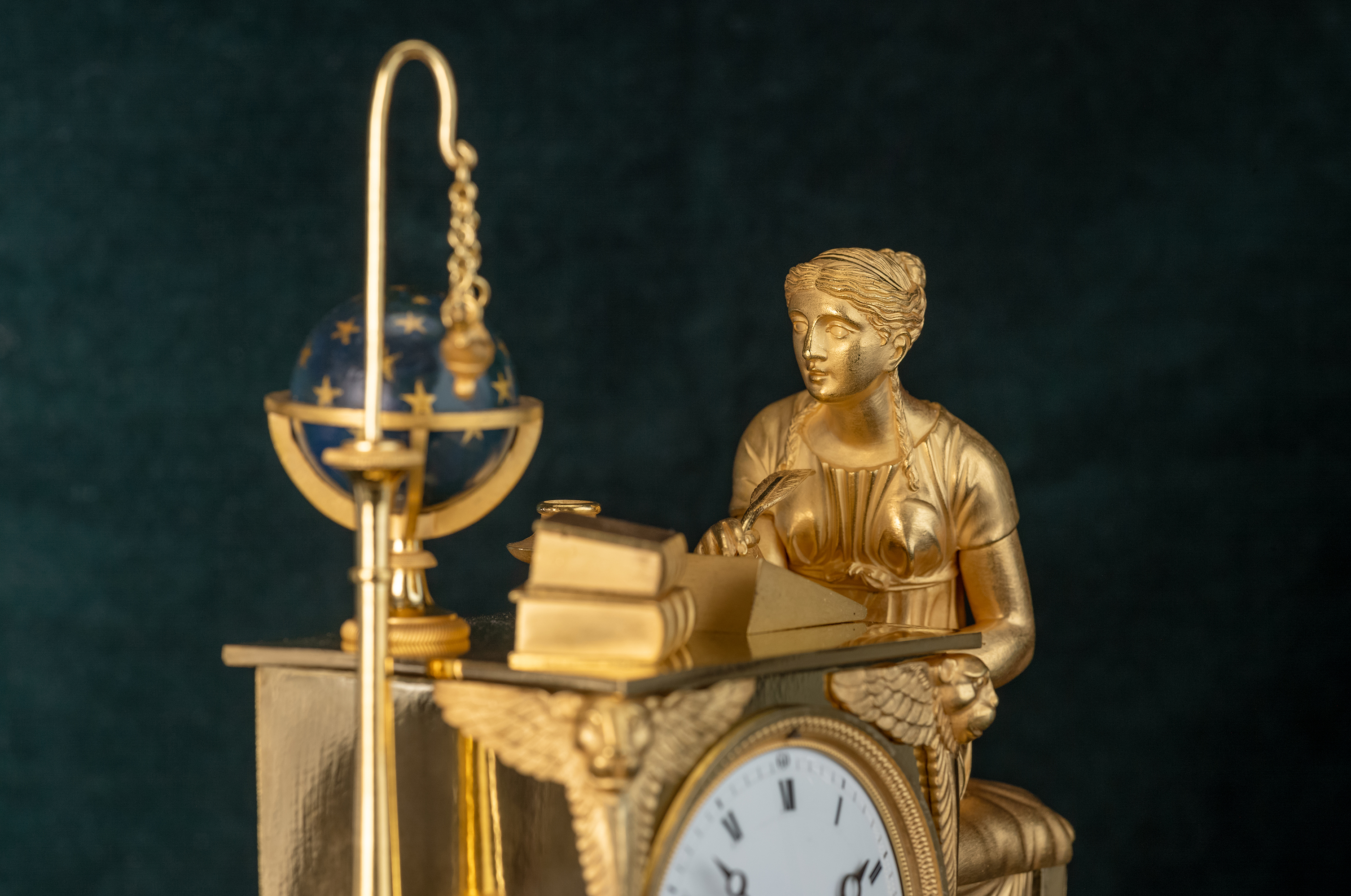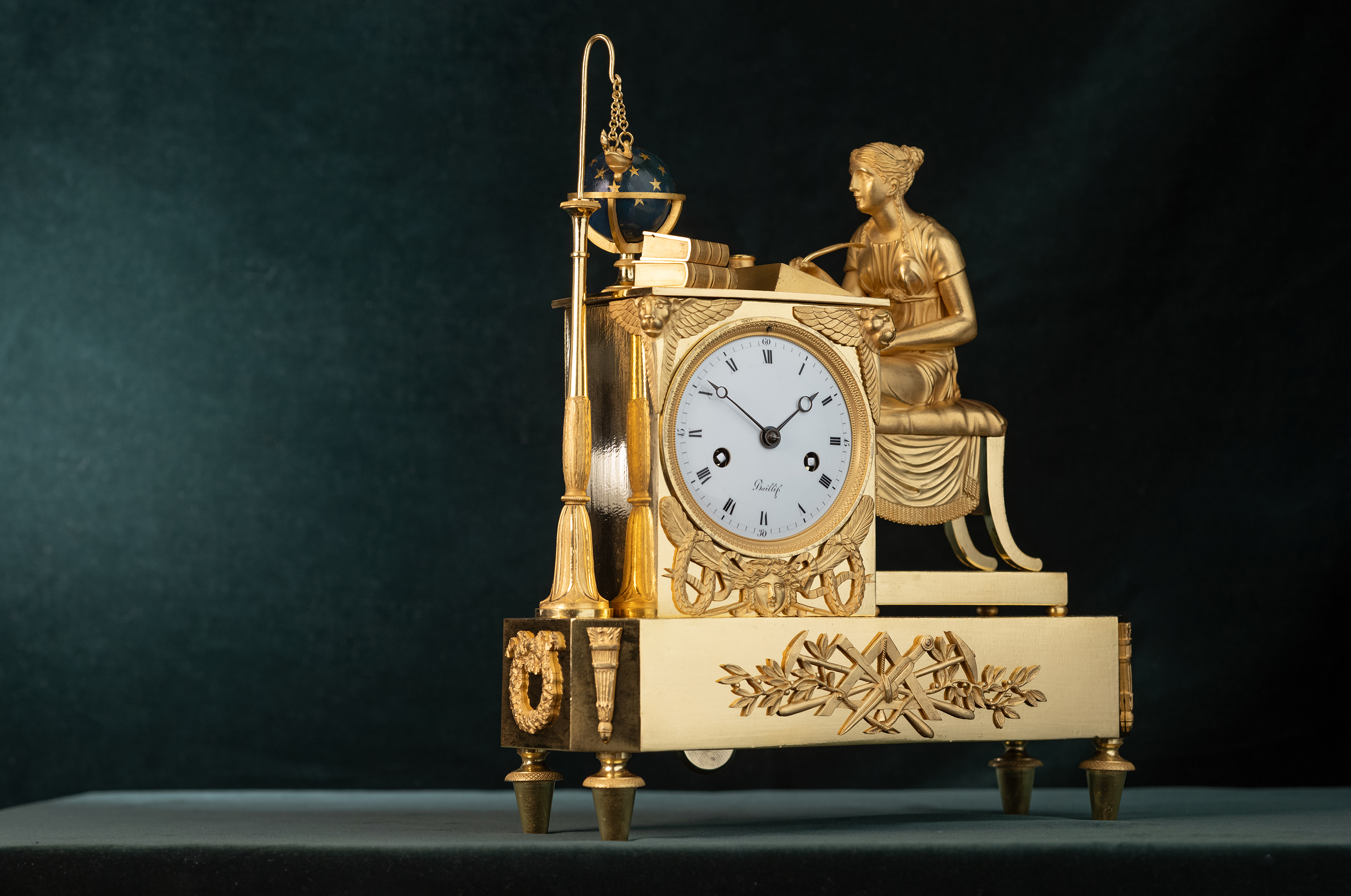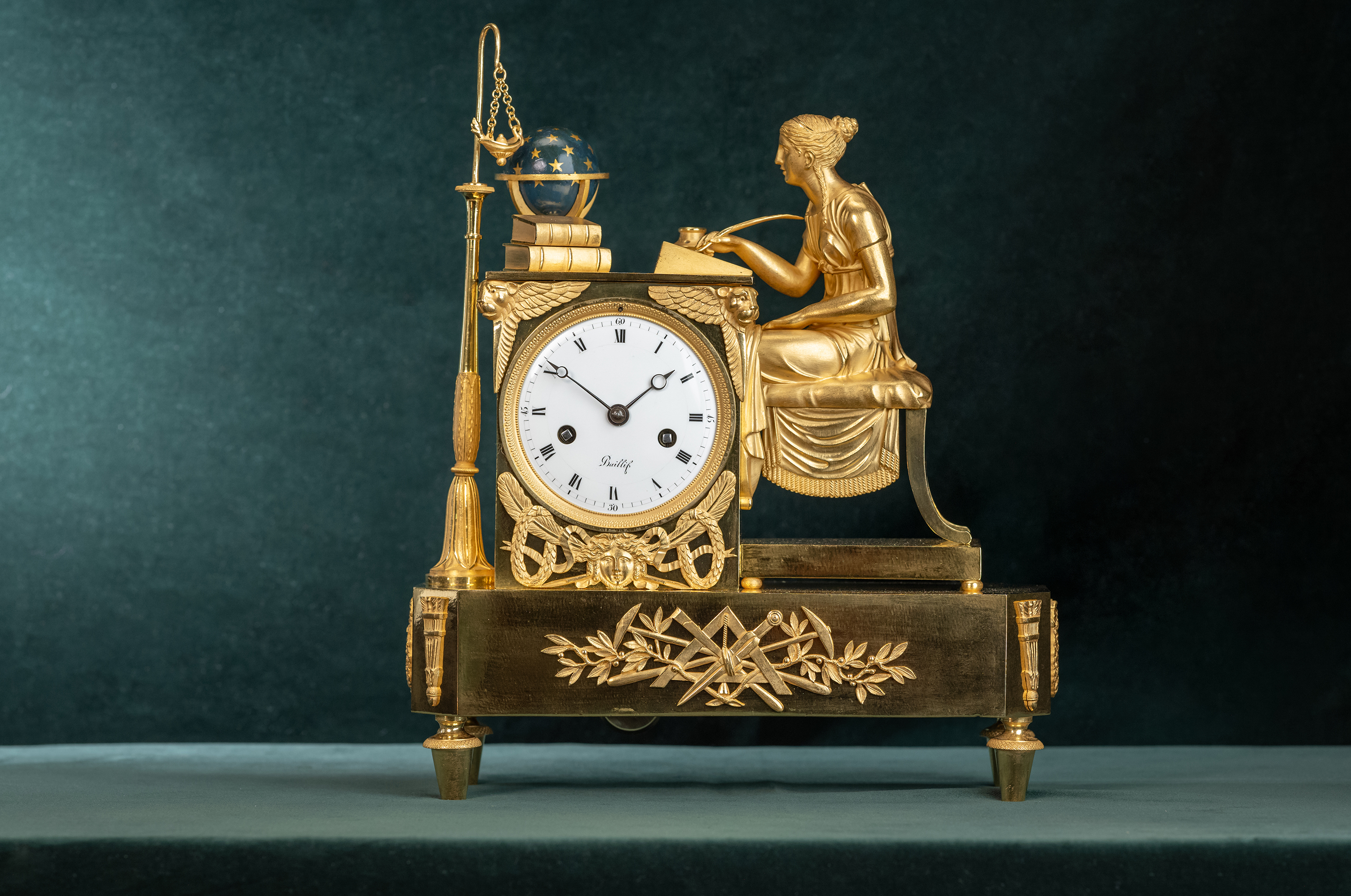 Messing vergulde pendule met lezende dame aan een tafel, uurwerk met gaand en slagwerk. Slagwerk slaat op een fijn belletje de uren en half uren. De klok heeft een loopduur van een week. De emaillen wijzerplaat heeft Romeinse cijfers en geblauwde Breguet wijzers.