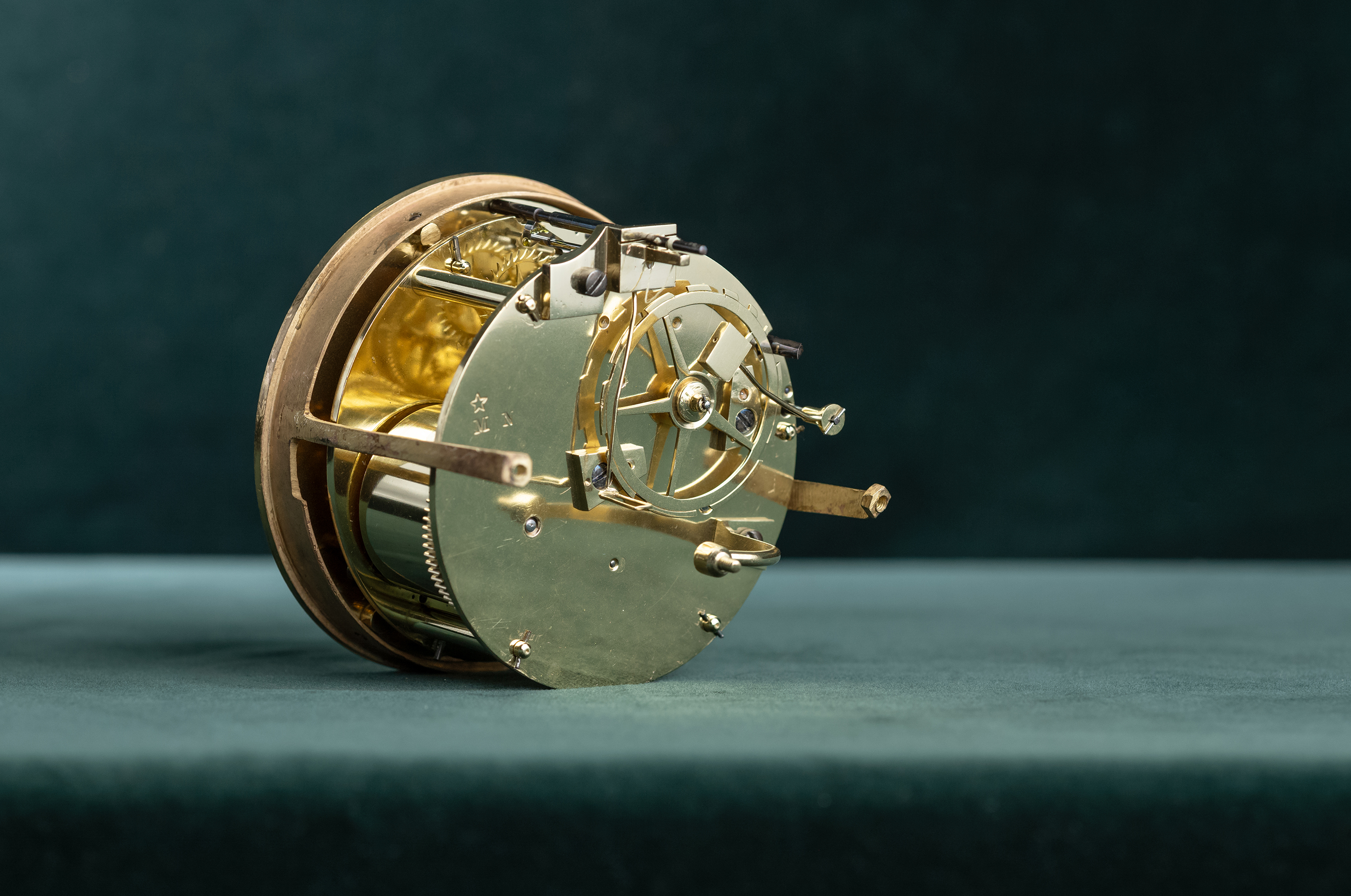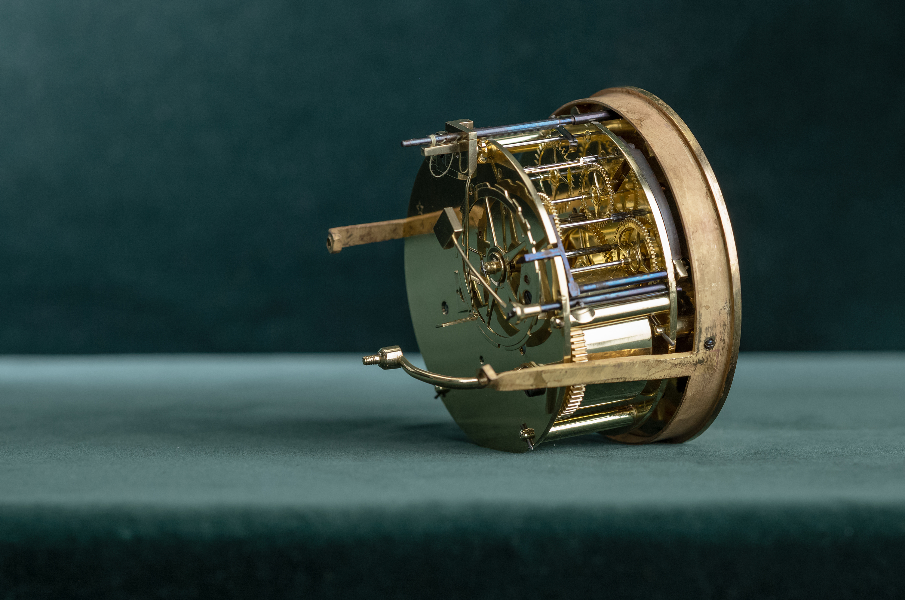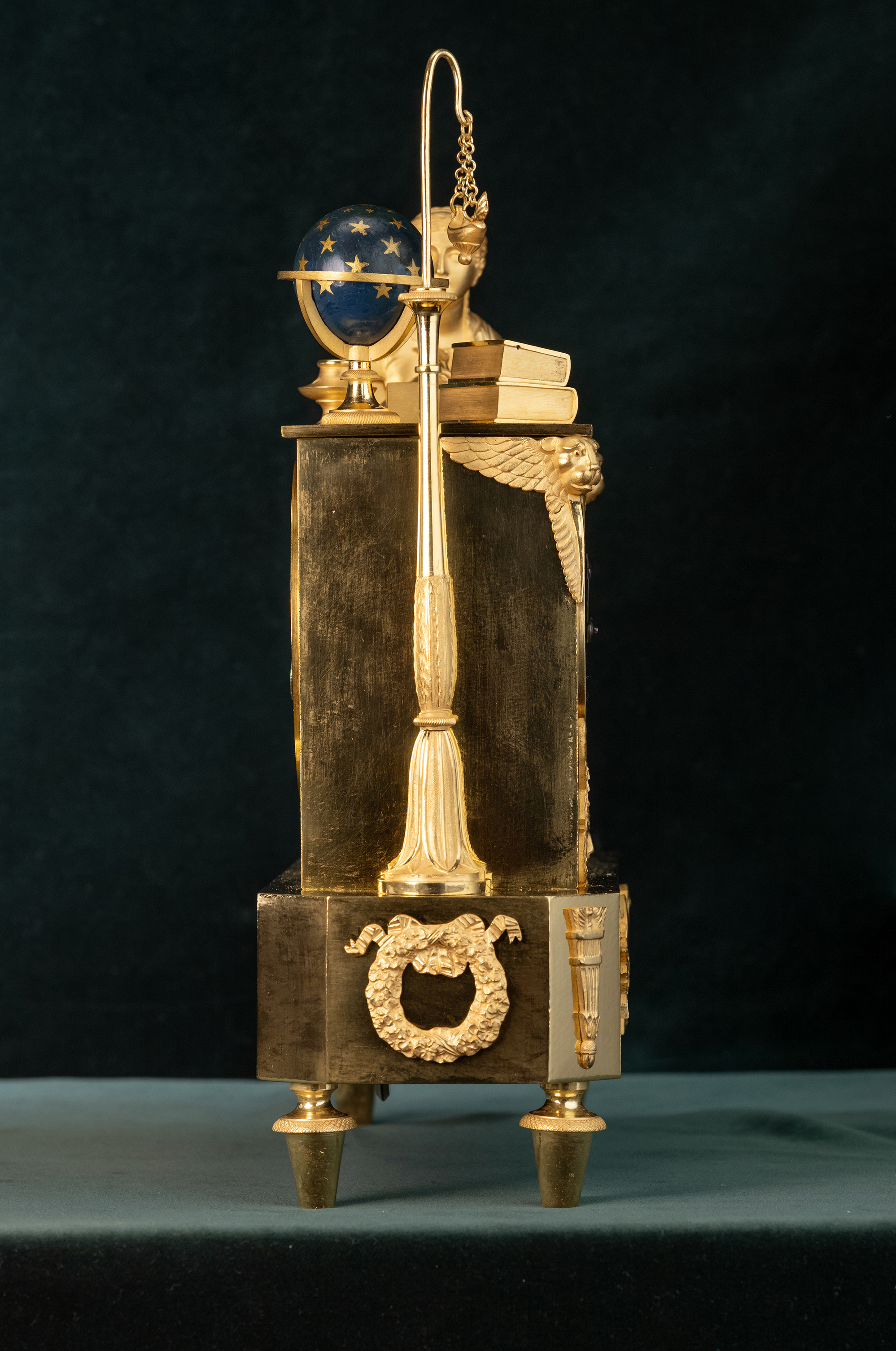 Messing vergulde pendule met lezende dame aan een tafel, uurwerk met gaand en slagwerk. Slagwerk slaat op een fijn belletje de uren en half uren. De klok heeft een loopduur van een week. De emaillen wijzerplaat heeft Romeinse cijfers en geblauwde Breguet wijzers.