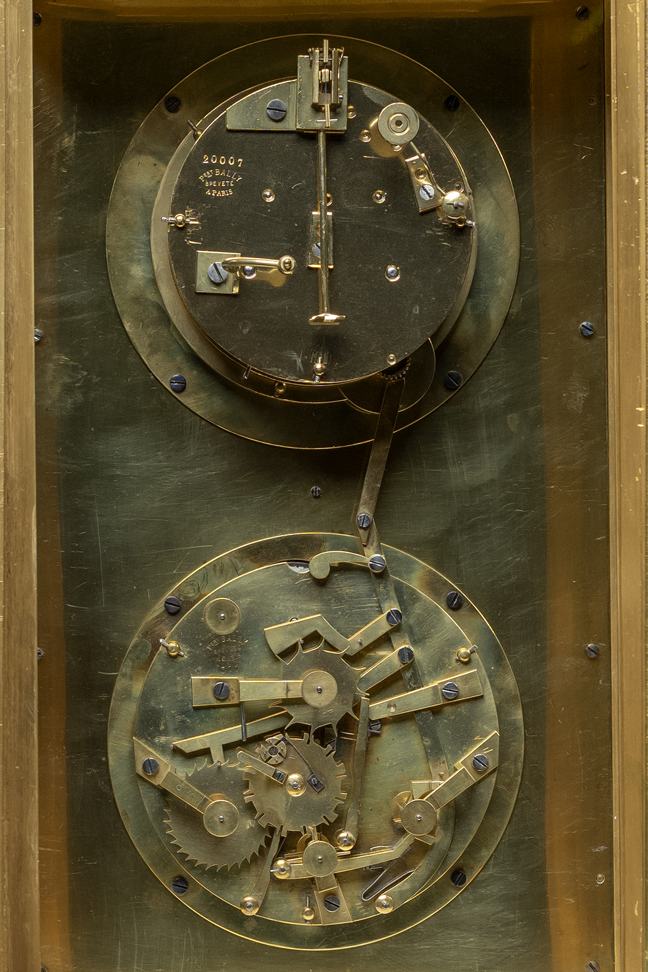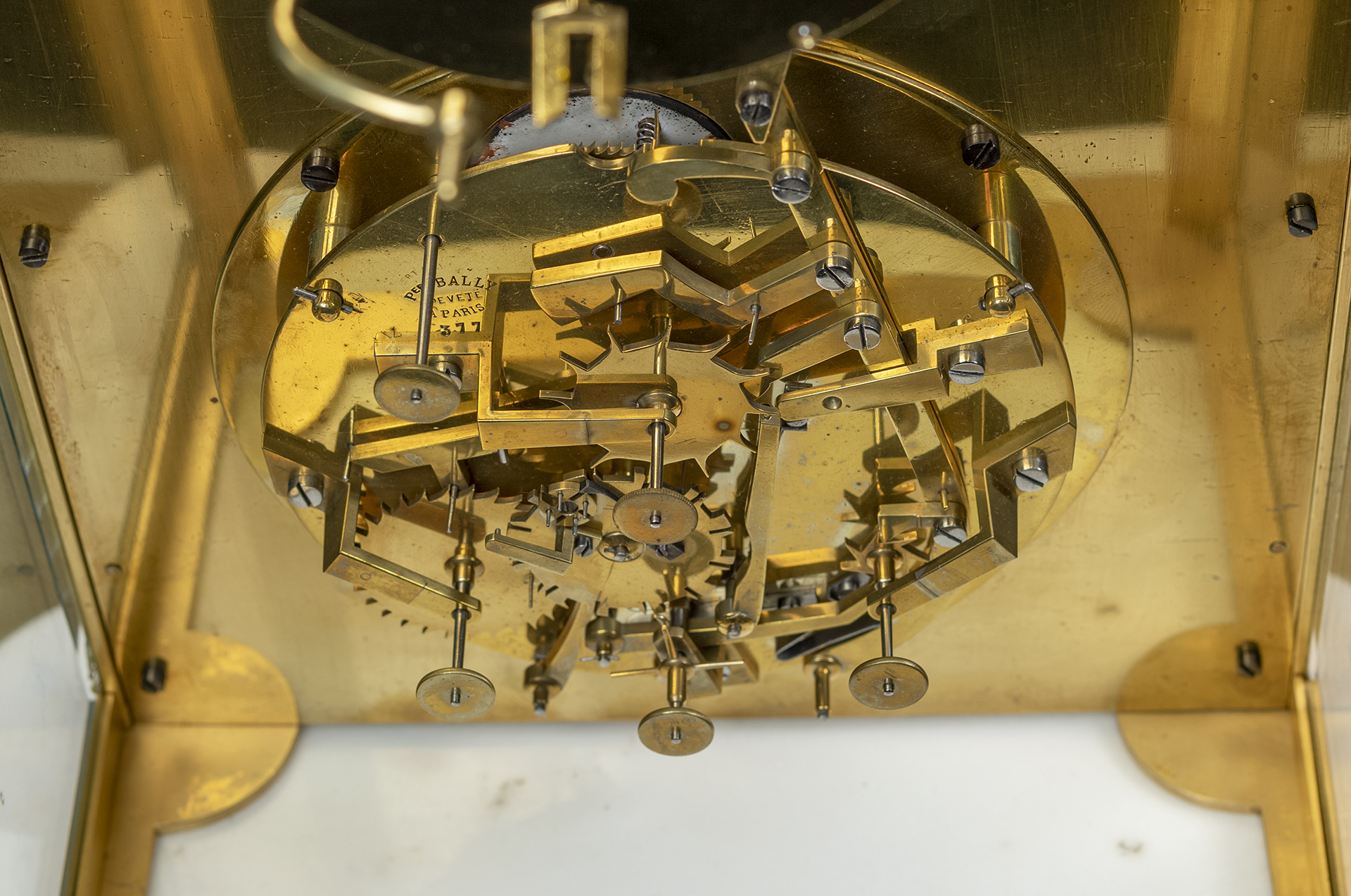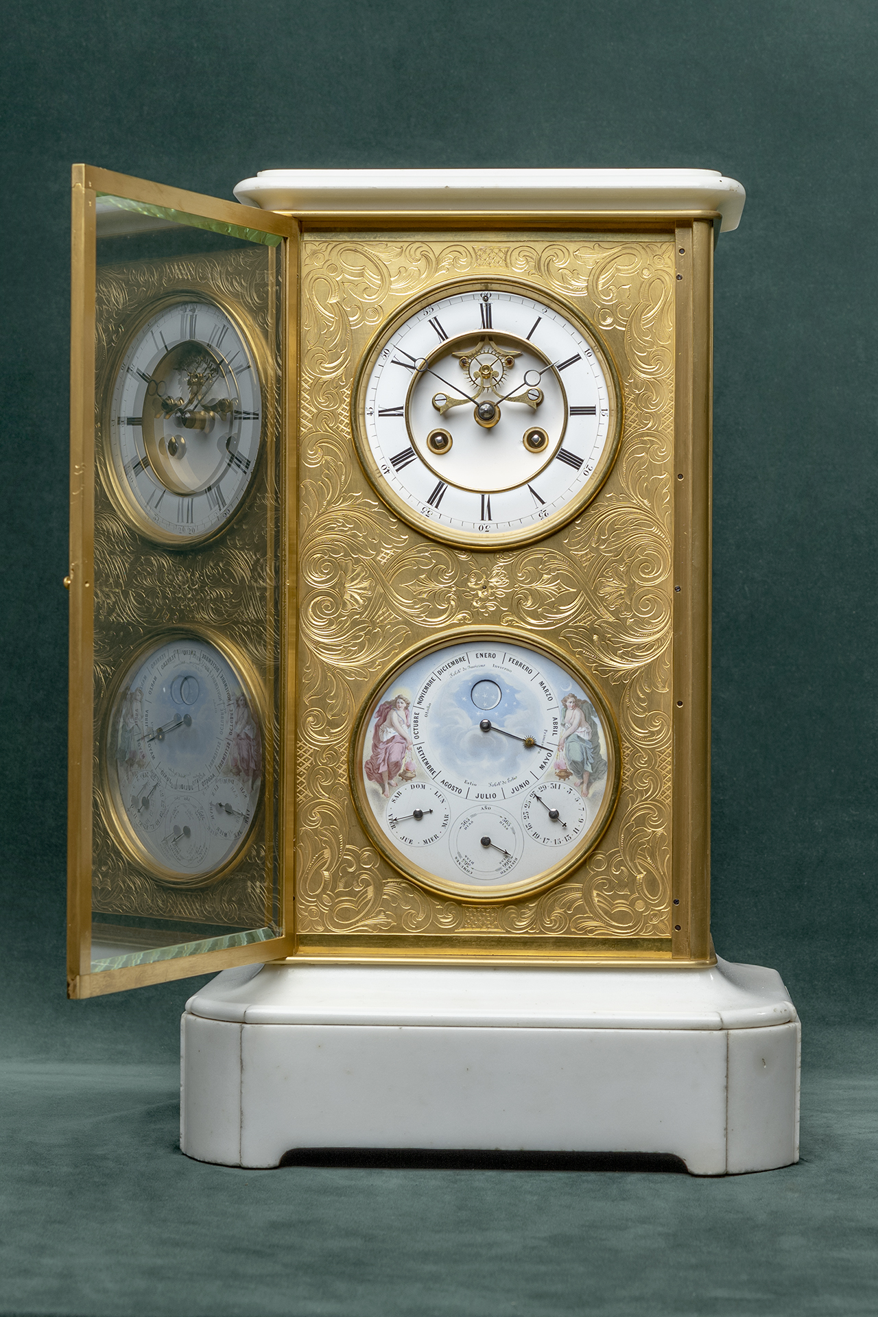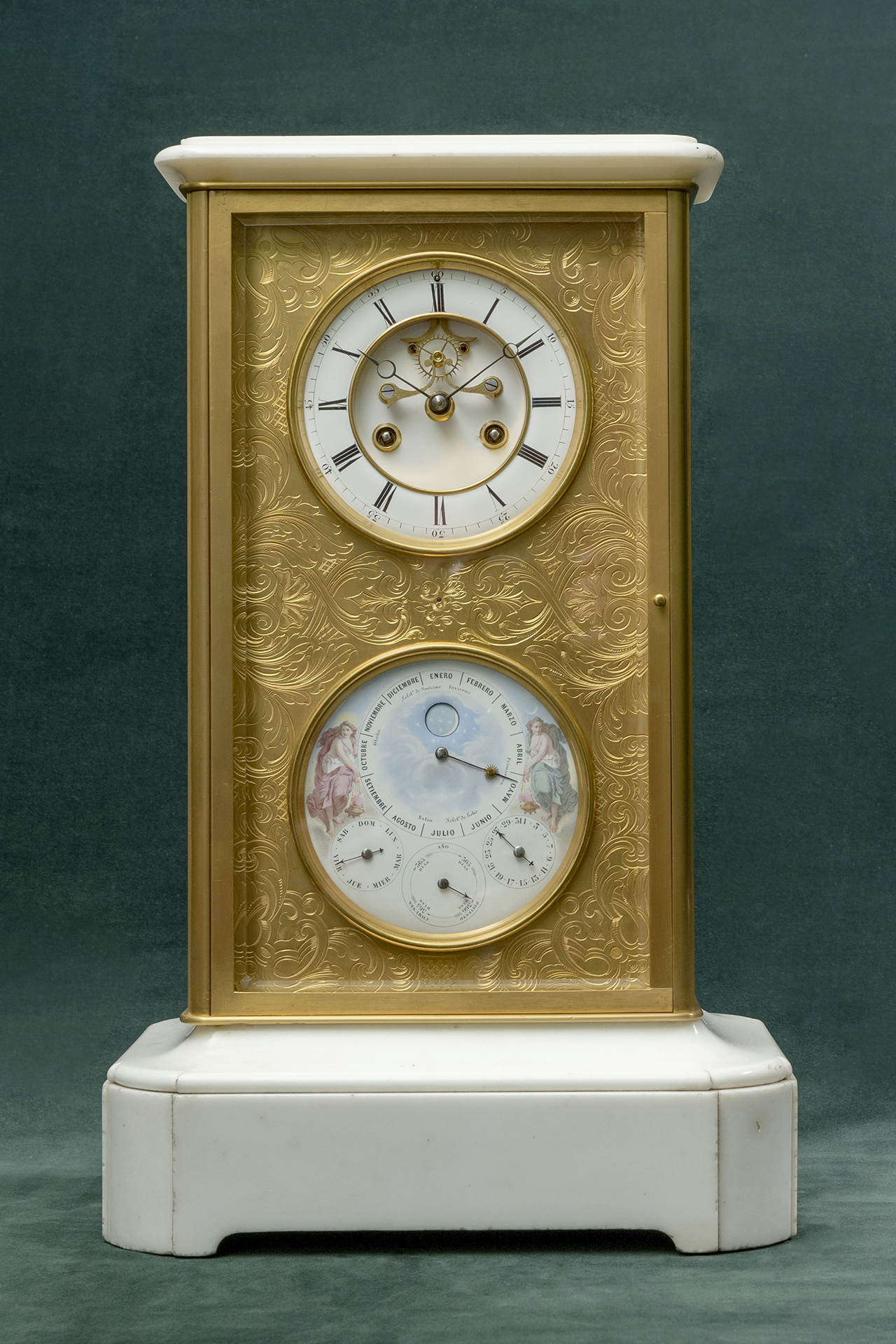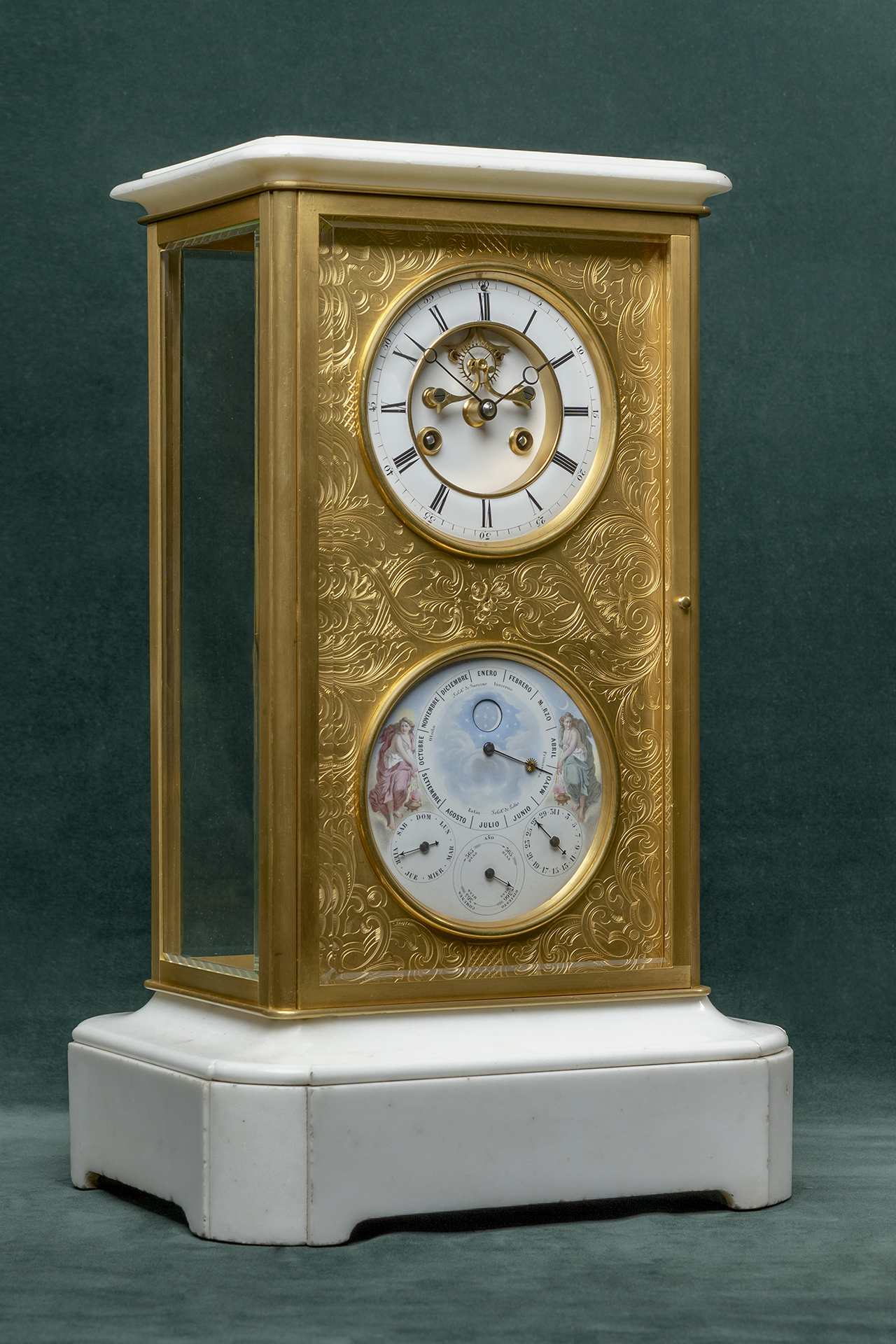 Wit marmeren met vergulde stijlen met gefaceteerd glas, 48 cm hoog, 30 cm breed en 23 cm diep. De fraai gegraveerde voorkant heeft twee wijzerplaten, de bovenste met geëmailleerde ringen met Romeinse cijfers, twee geblauwde wijzers en waar de Brocotgang zichtbaar is. De onderste wijzerplaat geeft de dag, datum, maand, maan en schrikkeljaren aan. Al deze aanduiding zijn in het Spaans weergegeven.