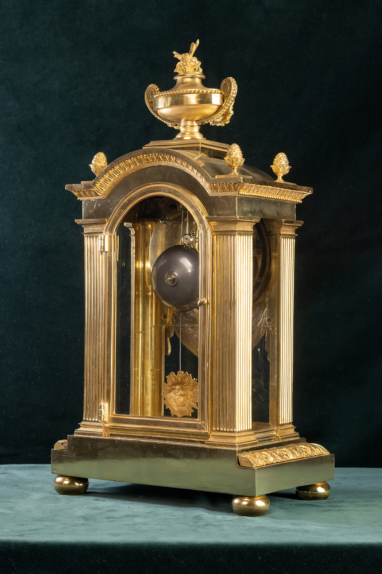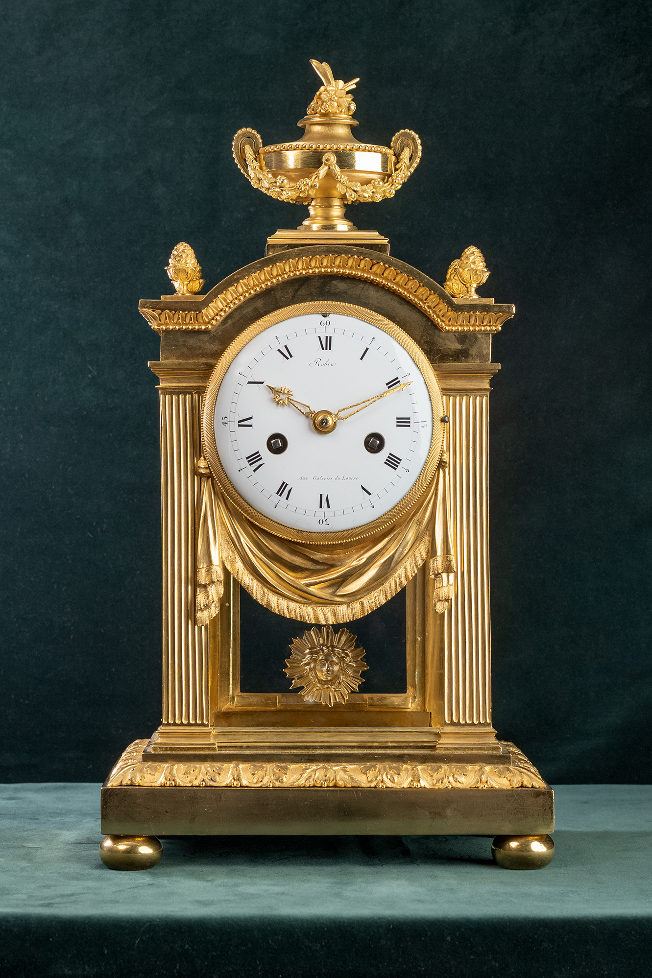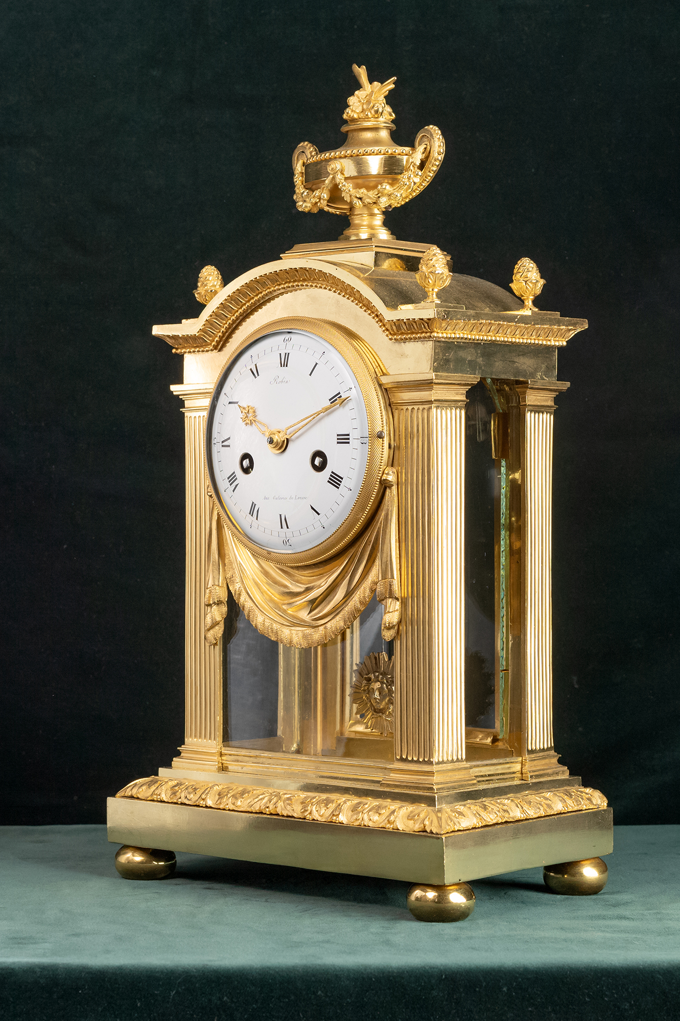 Franse pendule gesigneerd Robin 1742-1799, Hij was Horloger du Roi. Zware messing vergulde kast met glas aan alle zijden. De geëmailleerde wijzerplaat is gesigneerd Robin aux Galeries du Louvre. Het is een vroeg traditioneel Frans uurwerkje dat een week loopt met slagwerk op de uren en half uren op een bel. De messing vergulde wijzers geven de tijd aan.