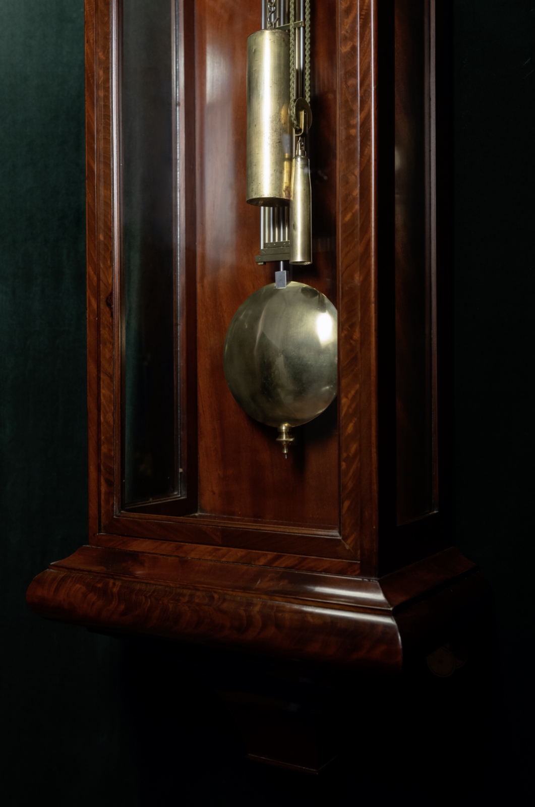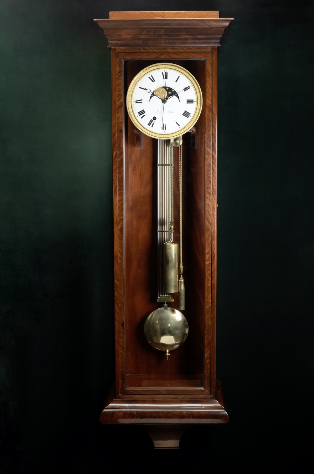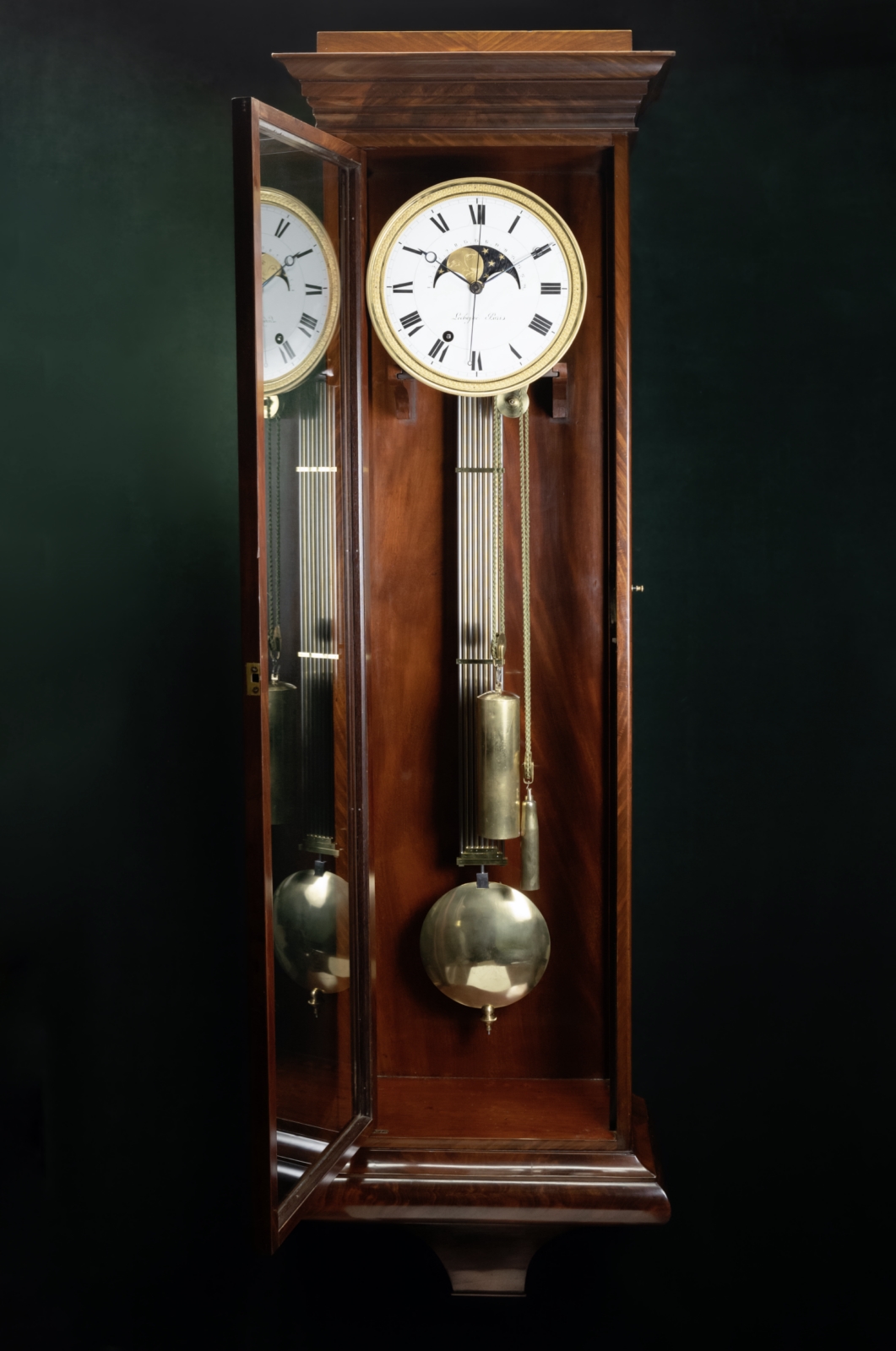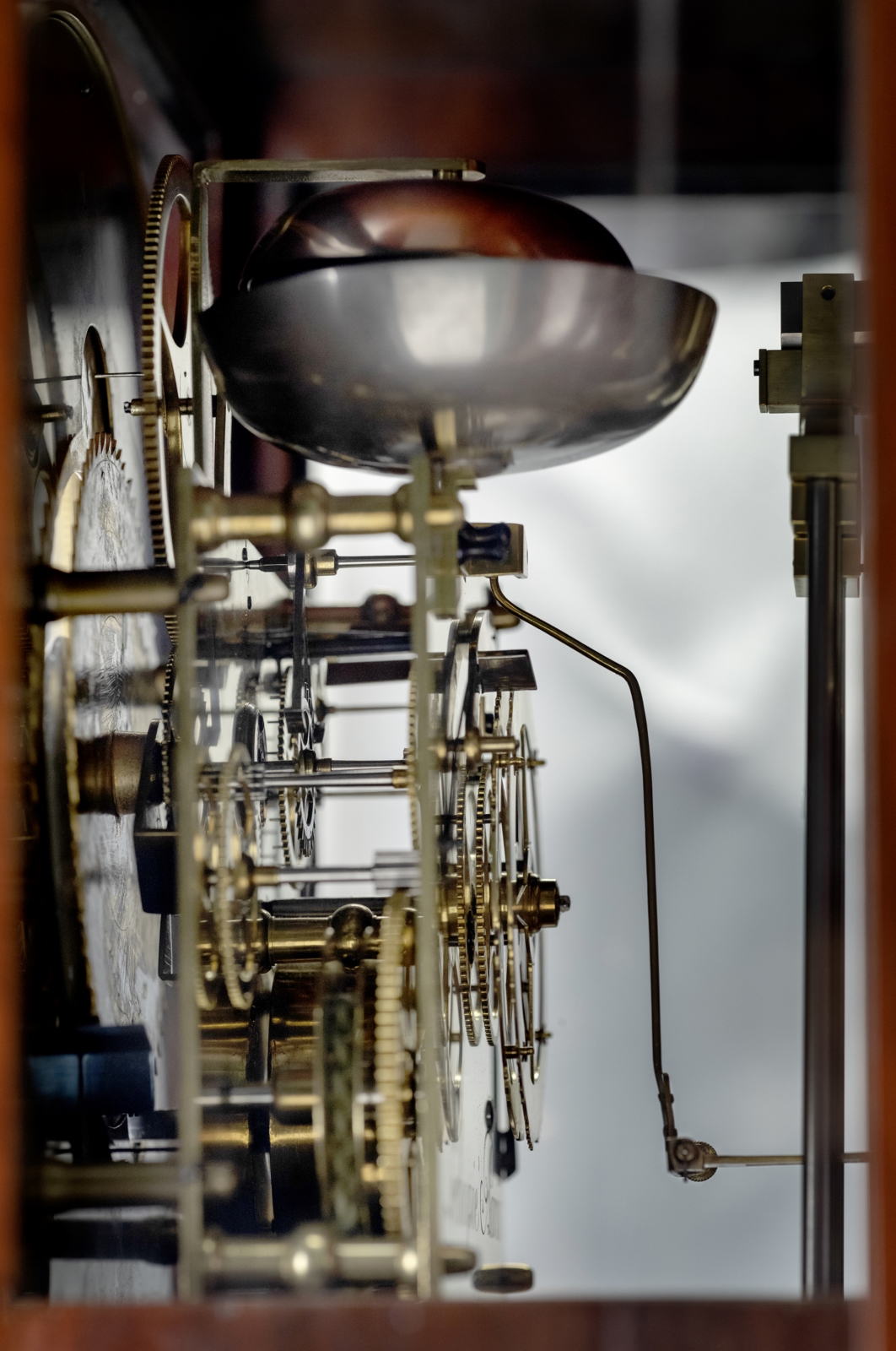 Precisie uurwerk op gewicht aandrijving met Huygens-ophangingskoord , en een kwartierslagwerk op veeraandrijving. Deze slaat op twee bellen.