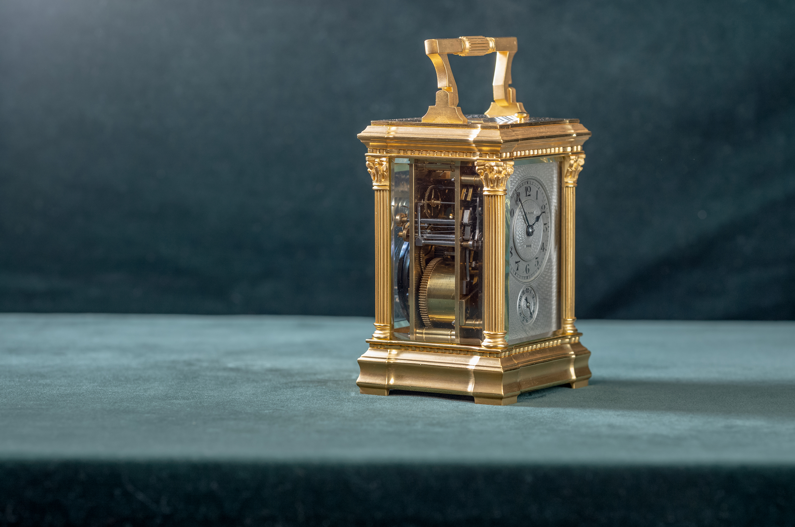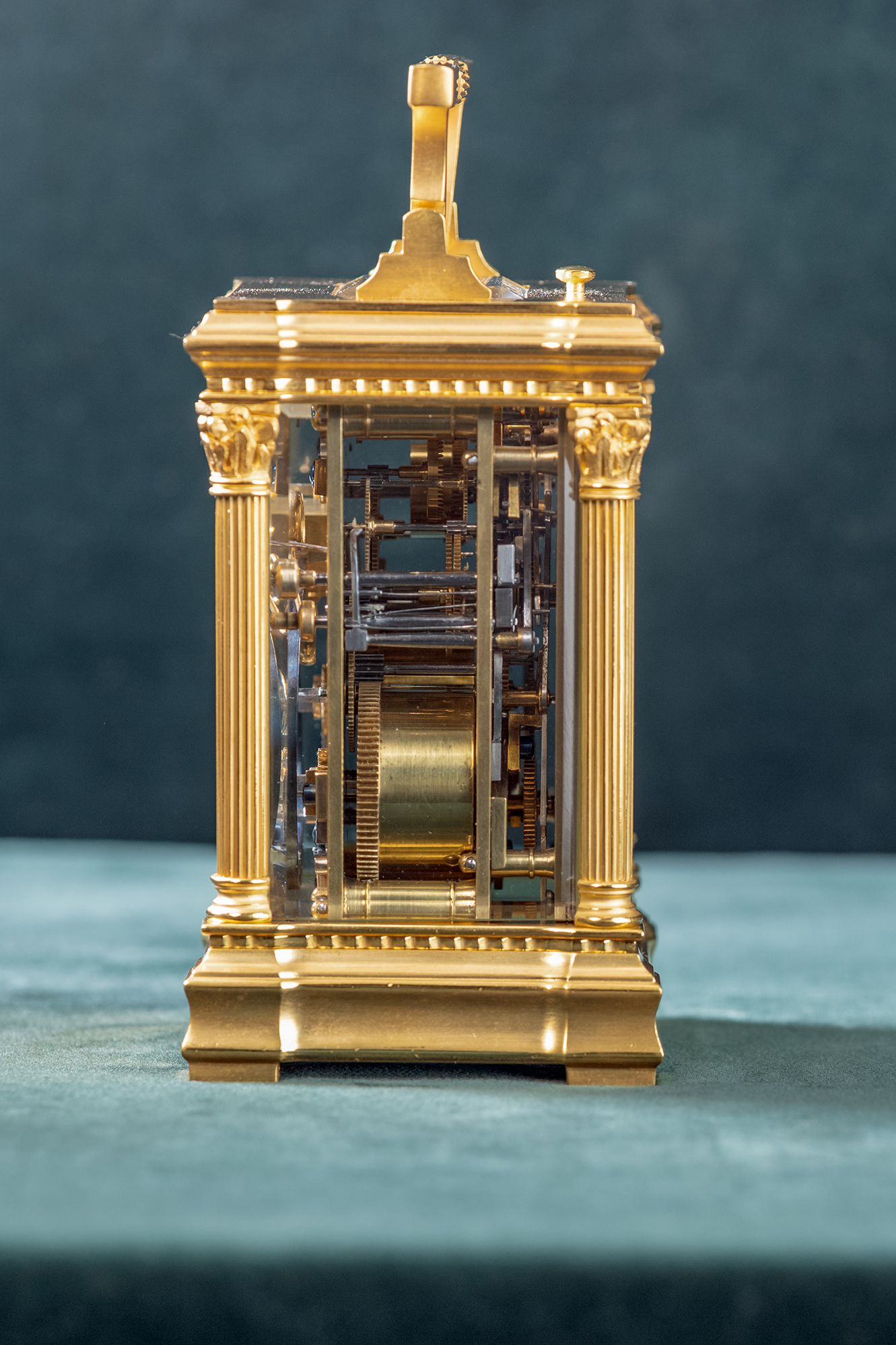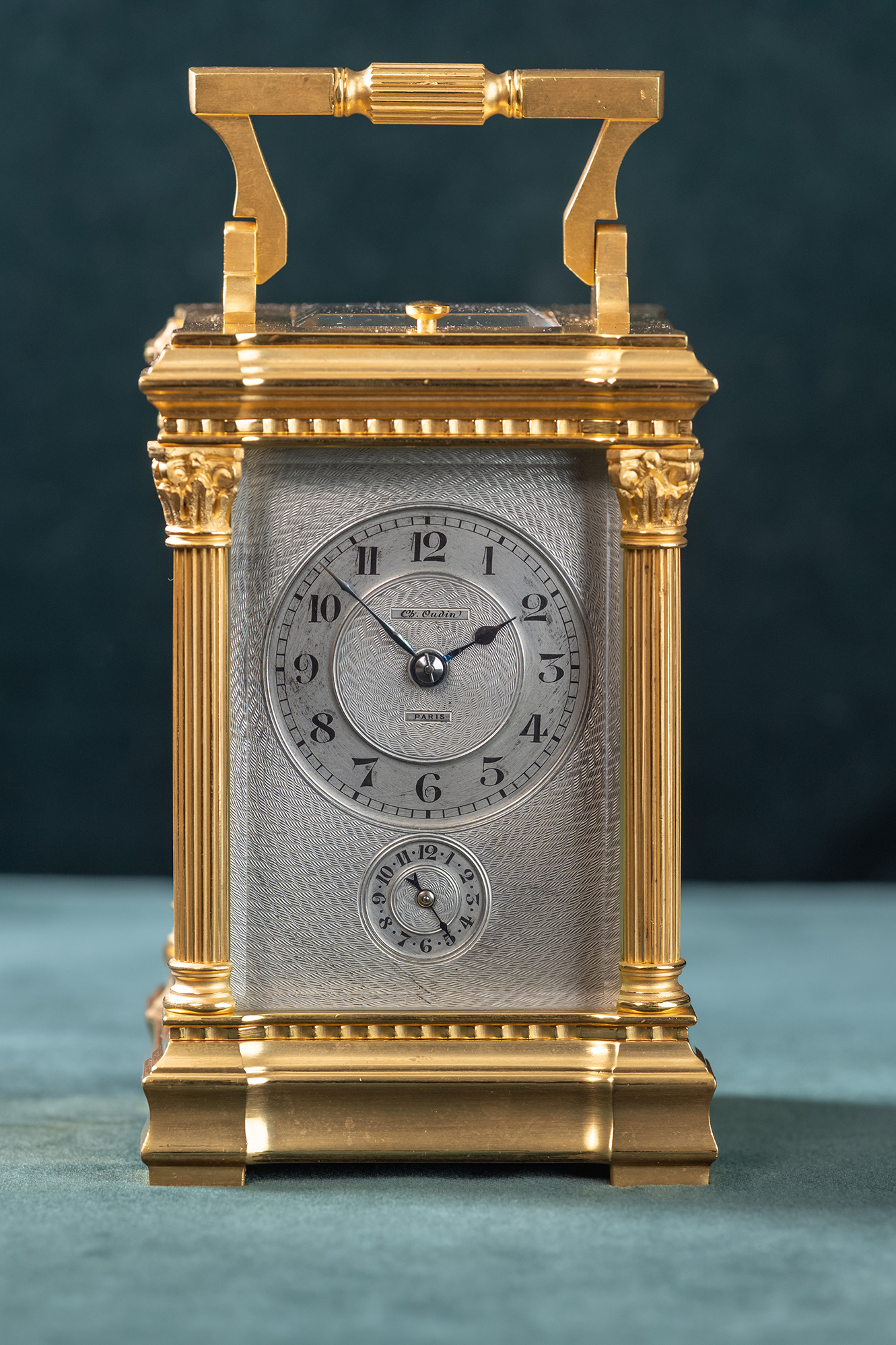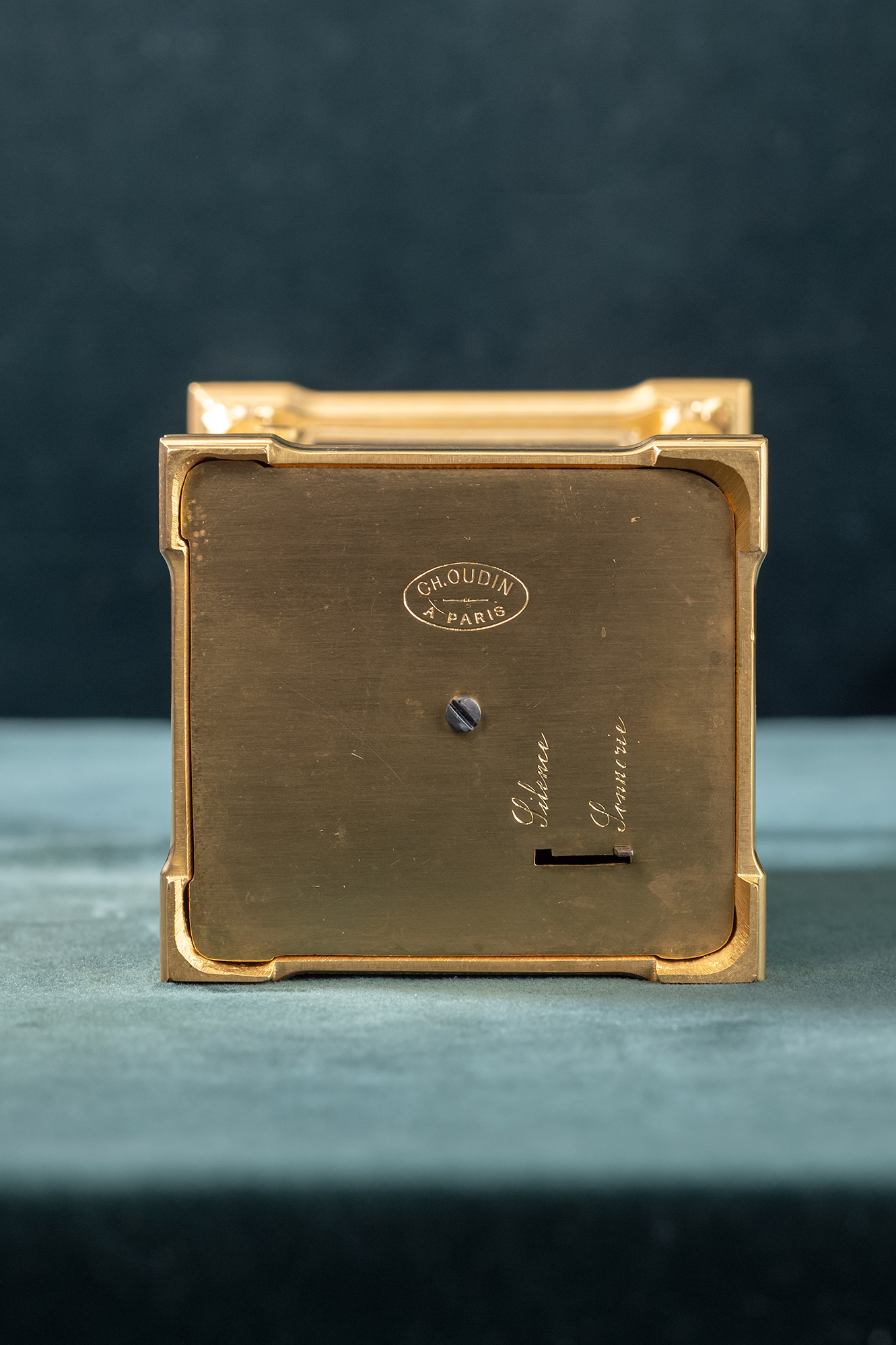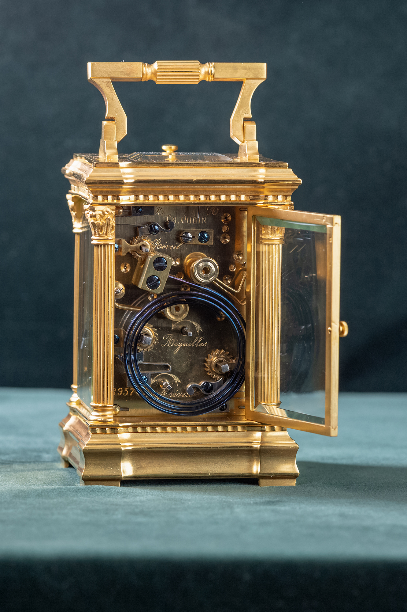Messing vergulde reisklok gesigneerd Charles Oudin a Paris. Oudin was een leerling van Breguet. Het uurwerkje loopt een week en heeft een kwartierslag op twee bellen. Onderin de verzilverde wijzerplaat zit de instelling voor de wekker. De centrale wijzerplaat voor de tijd wordt ligt vergroot door een lens in het gefaceteerde glas. Onder het klokje is de mogelijkheid om het slagwerk aan en uit te zetten.