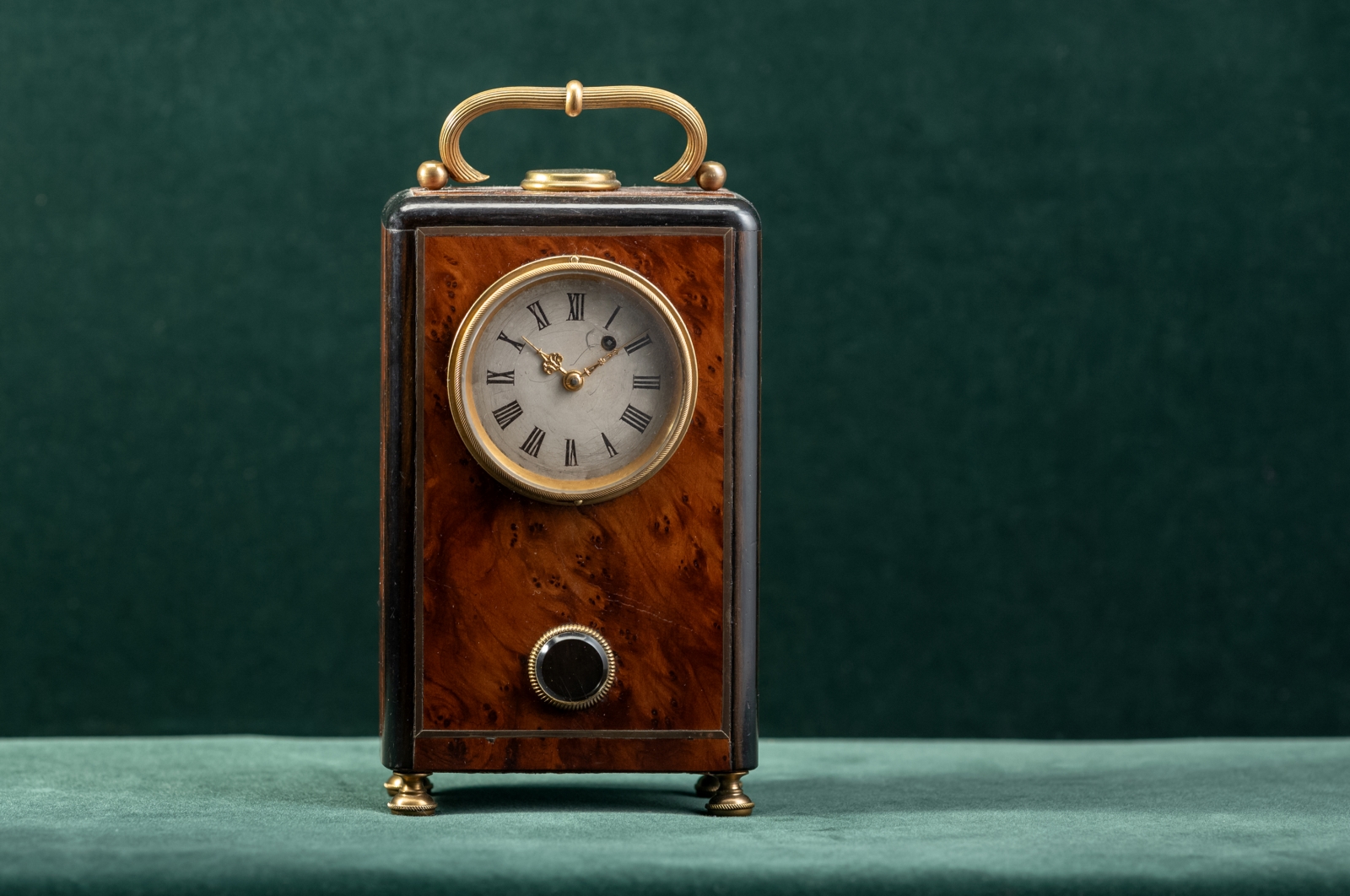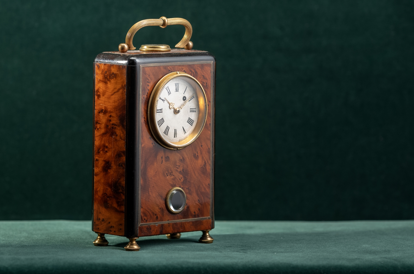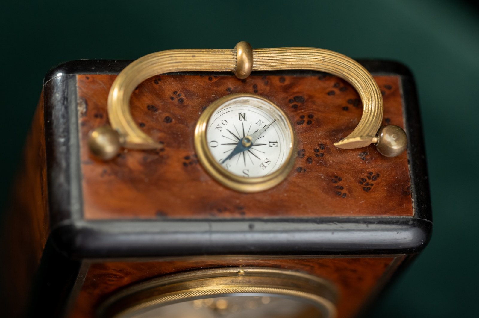 Klein mahoniehout iepenwortel gefineerd kastje met gezwarte hoeken. Een uurwerkje wat gesigneerd is Breguet met een loopduur van een dag. Het verzilverde wijzerplaatje heeft vergulde wijzers. Boven op het kastje is nog een kompas geplaatst. Dit charmante klokje is maar 15 cm hoog.