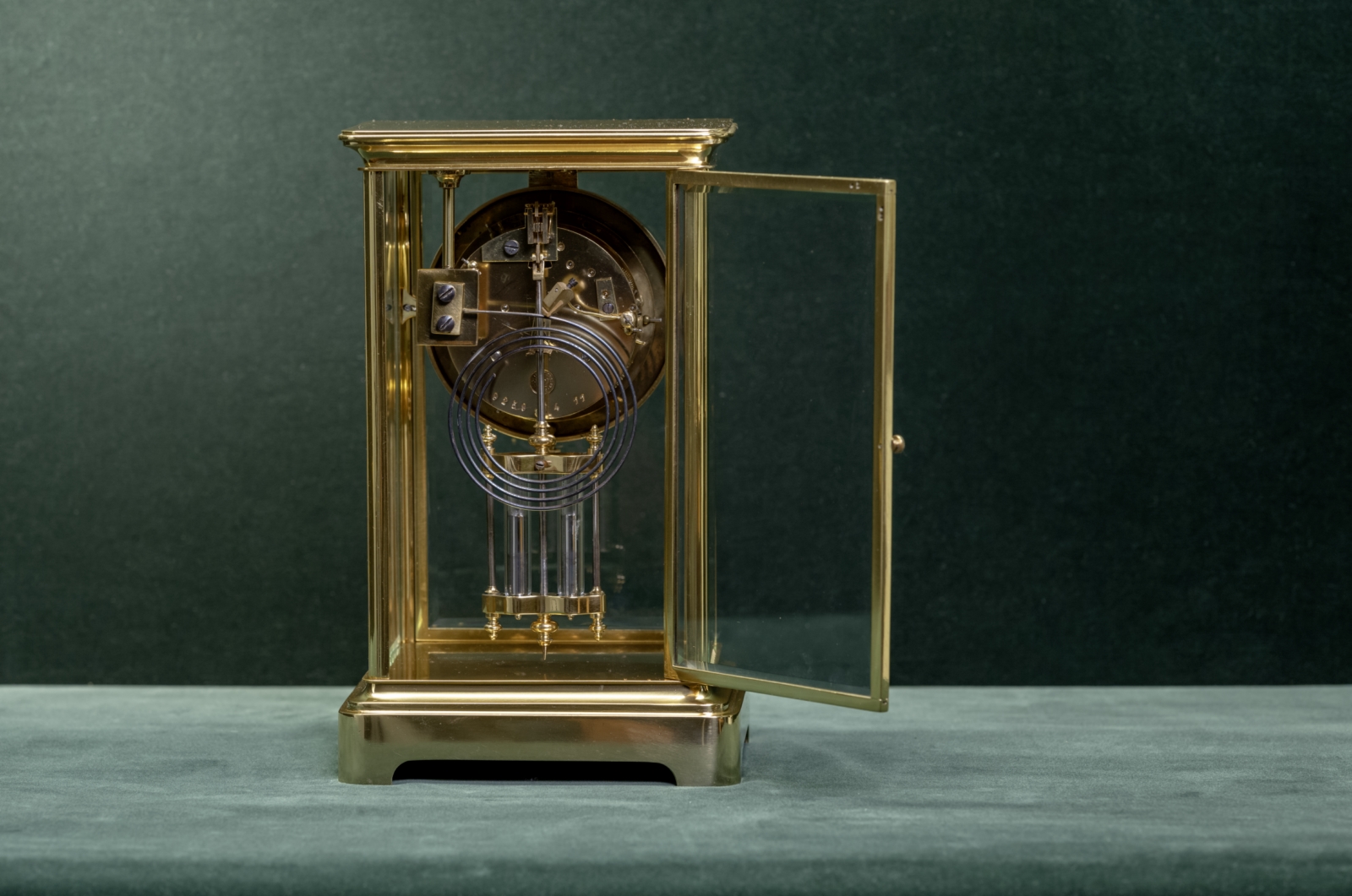 Het messing kastje is gelakt, en heeft aan alle zijden facetglas. Hoogte: 27 cm.