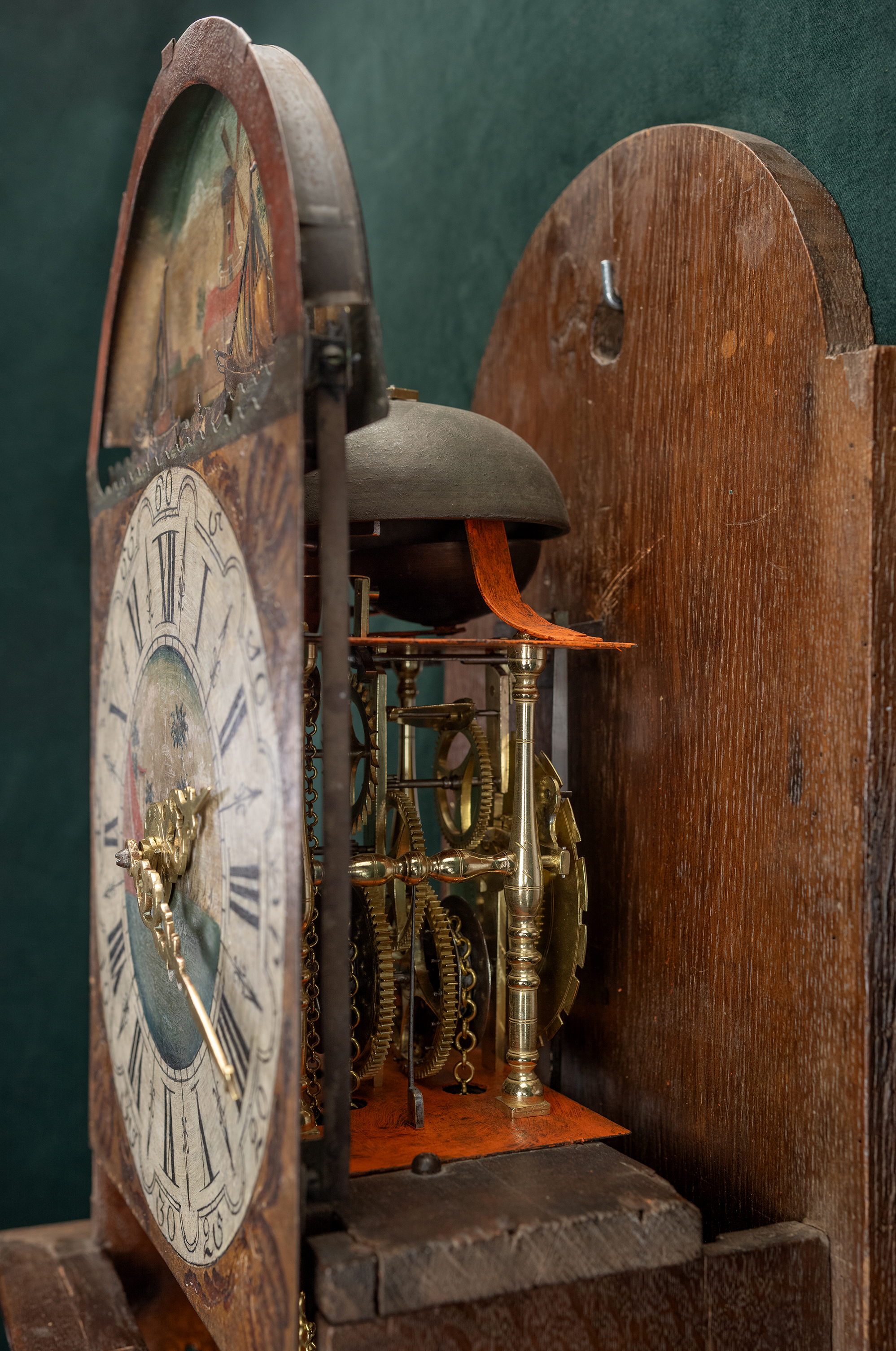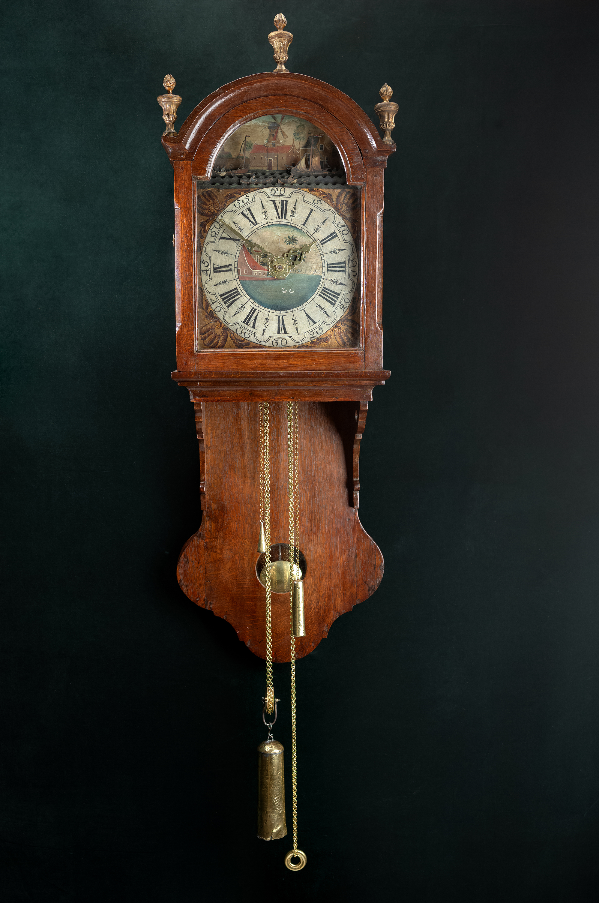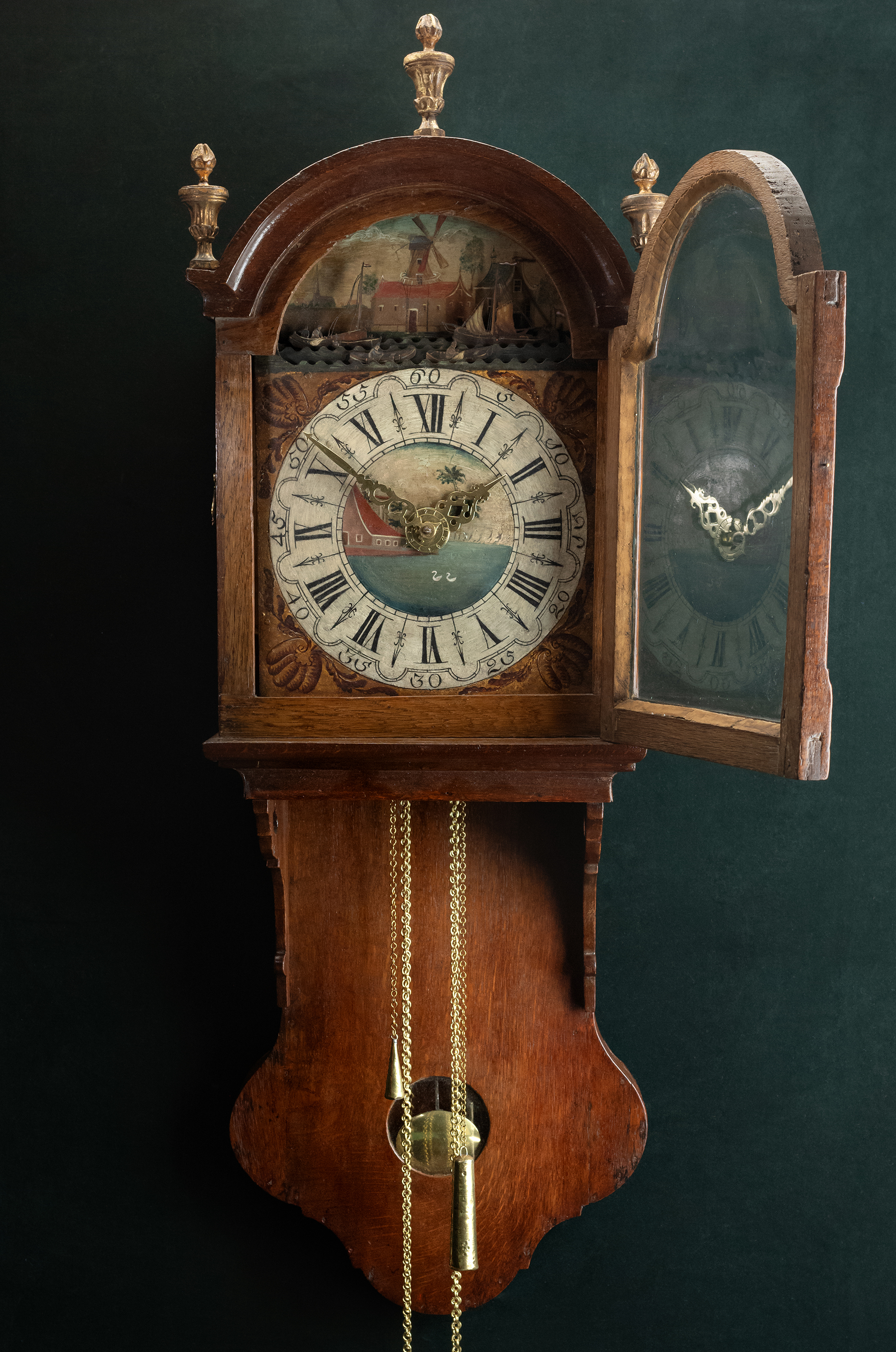 De eiken kast met korte staart is een korte versie van de Friese staartklok, die in de volksmond ook wel dikkop wordt genoemd. De beschilderde ijzeren wijzerplaat is met Romeinse cijfers. De messing wijzers geven de tijd aan. Boven in de wijzerplaat zijn twee bewegende scheepjes, twee kotters en bewegende golven. De geschilderde schelpen flankeren de cijferring. Drie fraaie tollen staan op de kap. Op de schuif zit een rond slingervenster zonder loden ornament wat duidt op een vroege uitvoering van deze kortstaart. De breedte van de kast is 38 cm, de hoogte is 110 cm en de diepte 24 cm. Het slagwerk heeft een dubbele slag, op de kwartieren slaat ze één maal en op de uren en halve uren voluit op twee verschillende bellen. Het wekker mechanisme wordt door de twee voorste kleine gewichten aangedreven. Het uurwerk heeft een loopduur van 24 uur.