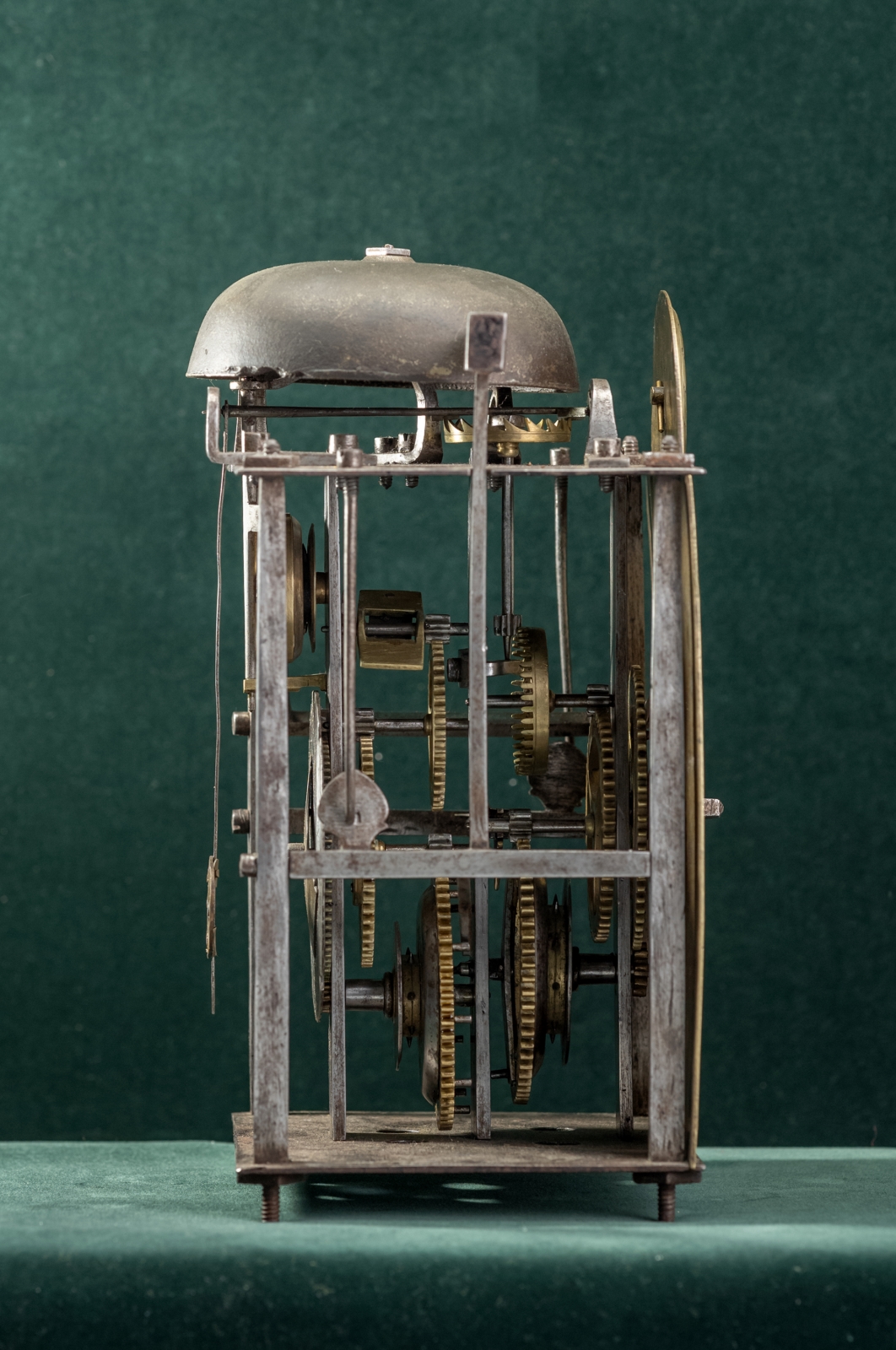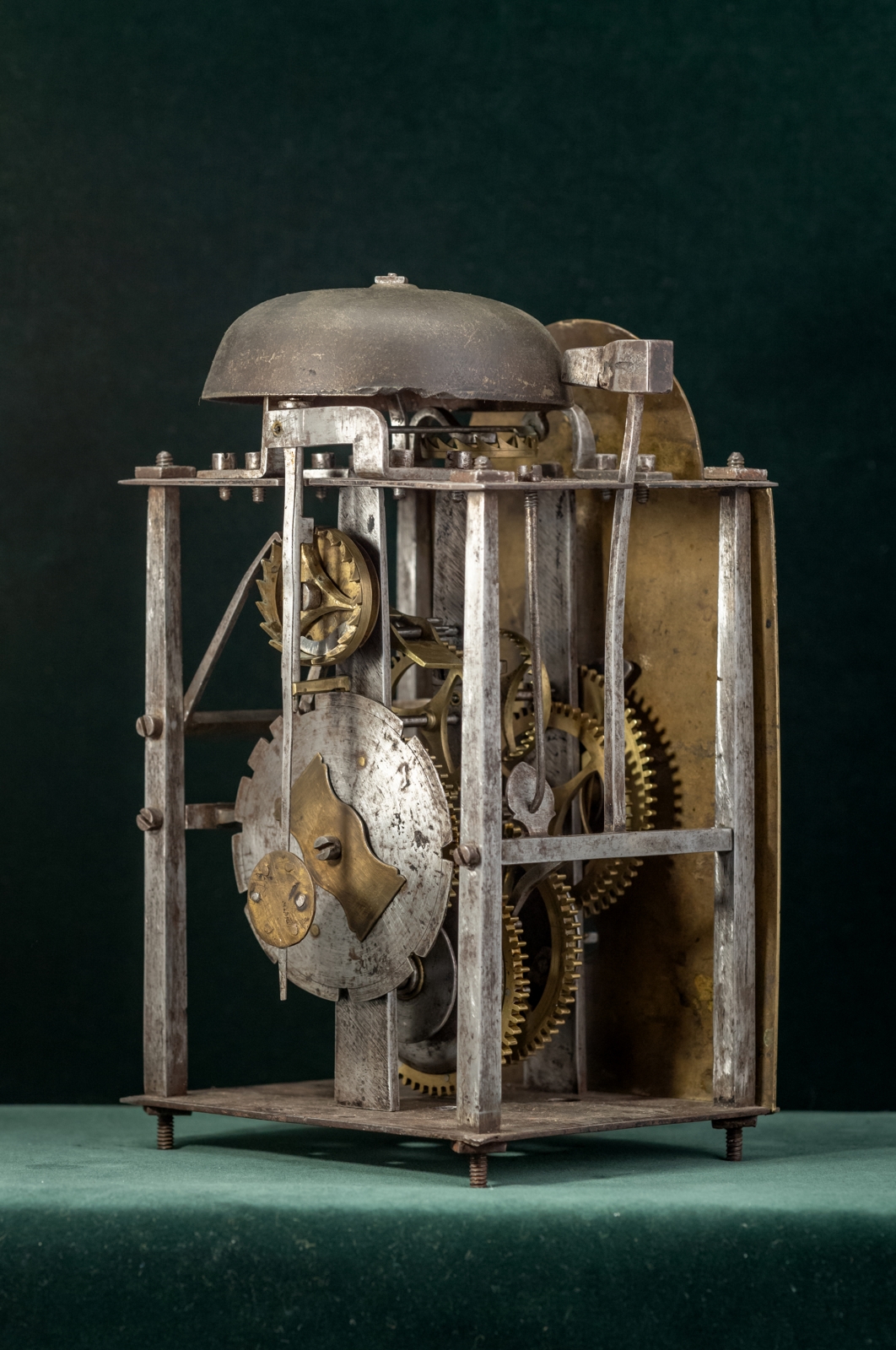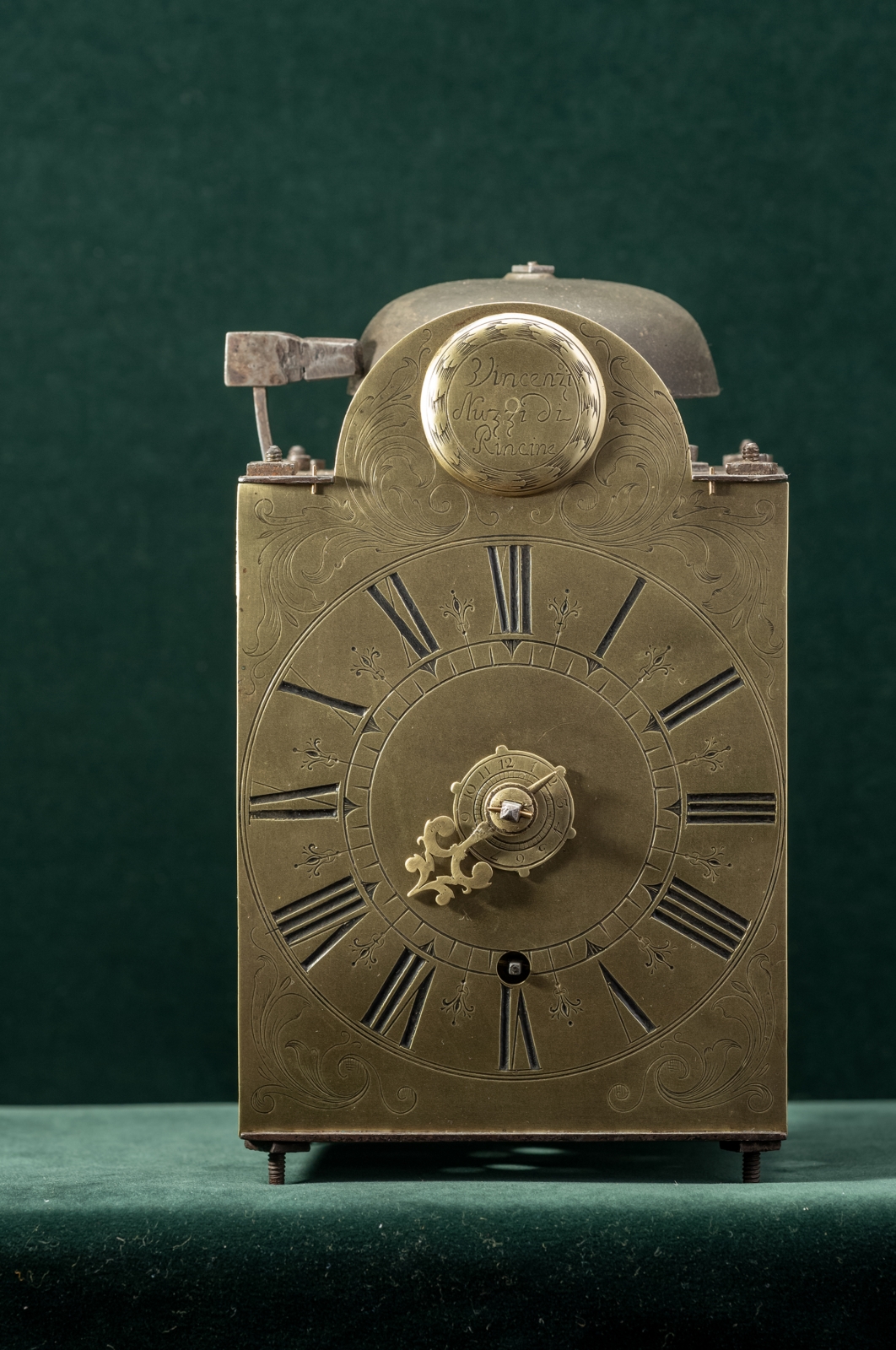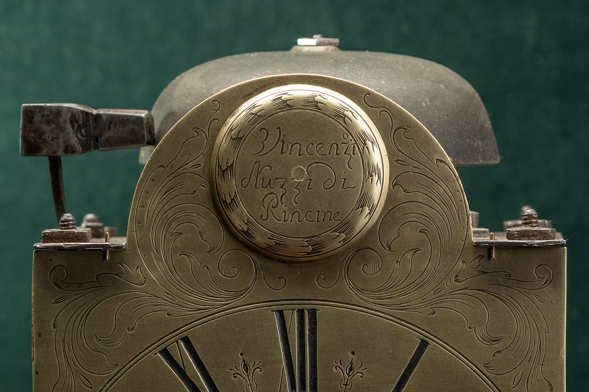 Lantaarnklok gesigneerd Vincenzi Nuzzi Di Rincine ca 1780. Het frame van het uurwerk is van ijzer, er is een gaandwerk, slagwerk en een wekkerwerk. Doormiddel van het vierkant boven de 6 kan het uurwerk gelijk gezet worden met een sleuteltje. Fraai gegraveerde messing wijzerplaat met één wijzer. De Familie Rincine maakte deze typische lantaarnklokken bijna altijd op ongeveer dezelfde manier, soms met 6 uren slagwerk en soms met of zonder wekker, dit hing af van de koper. Ze werden dan ook meestal op bestelling gemaakt. Wijzerplaat is 22 cm hoog en 14,5 cm breed en de diepte is 12 cm.