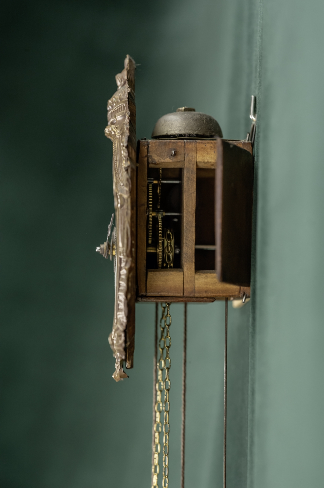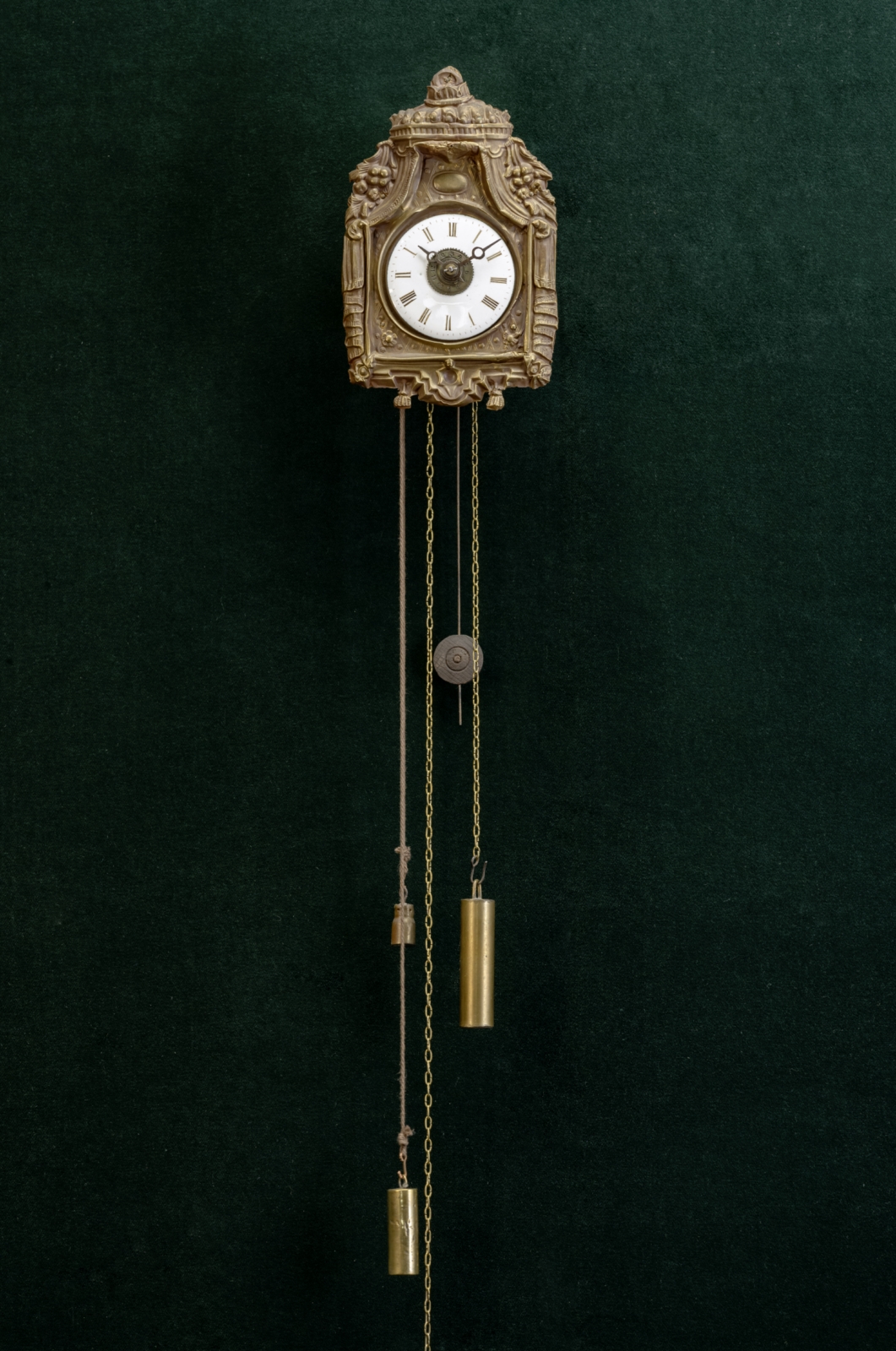 Uurwerk met een gaand en wekkerwerkje, dagelijks op te winden. Een gestanste messing front met emaillen wijzerplaat en stalen Breguet wijzers. Slinger met houten lensje. Totale hoogte 15,5 cm.