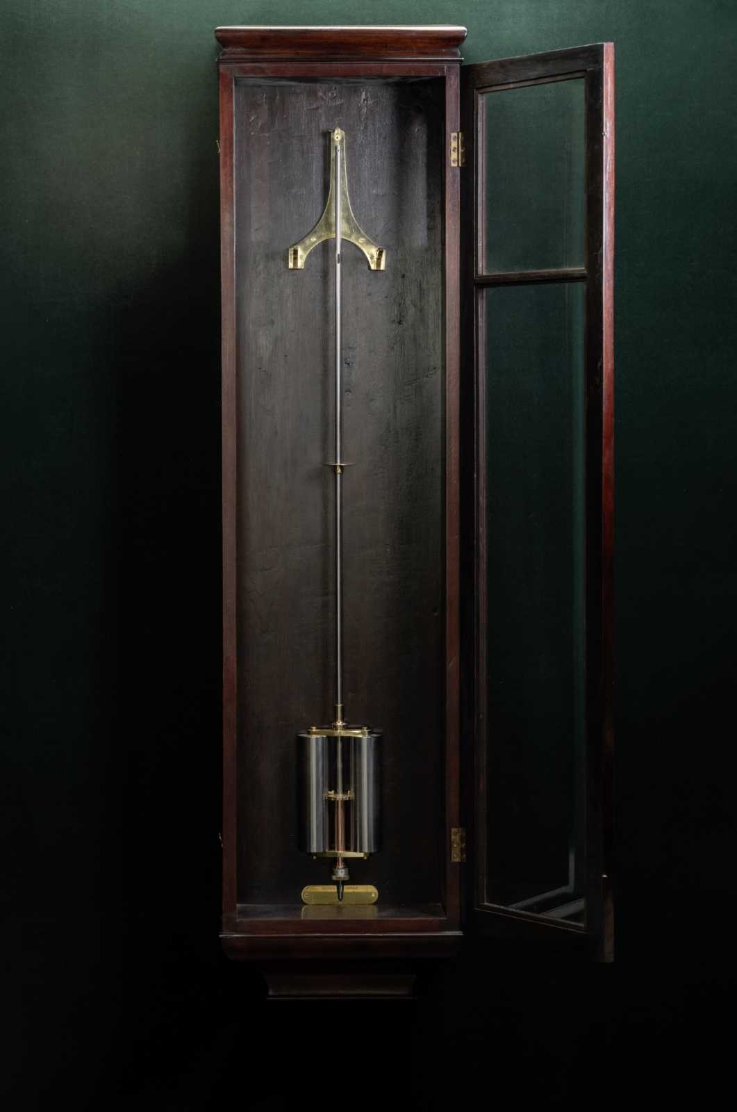 Mahoniehouten kast met deur. Verzilverde wijzerplaat met driedelige indeling, de buitenrand voor de minuten, de onderste voor de uren en de bovenste cijferring voor de seconden. Het opwindvierkant zit in het centrale gedeelte van de uurwijzer. 8-daags uurwerk met compensatieslinger. Het gewicht zakt aan de zijkant van de kast aan een snaar naar beneden. DE hoogte van de kast bedraagt 146 cm.