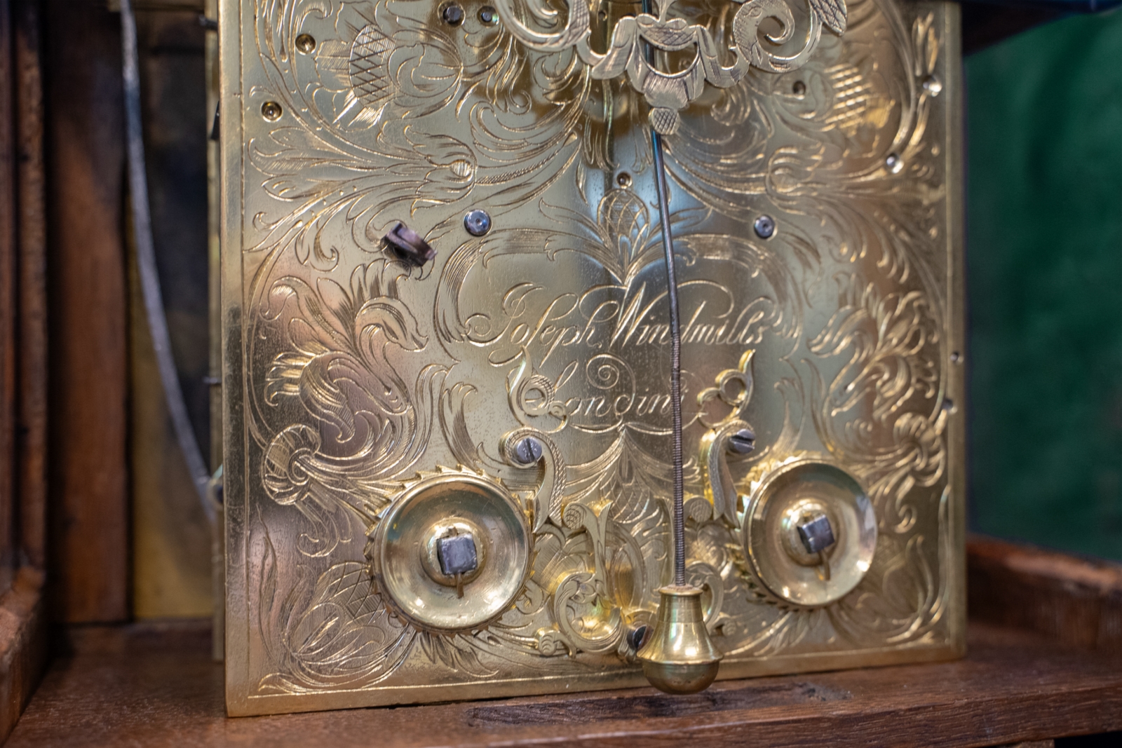 Gegraveerde achter platine waarop ook gesigneerd Joseph Windmills London, uitgewerkte en gegraveerde ankerkloof.