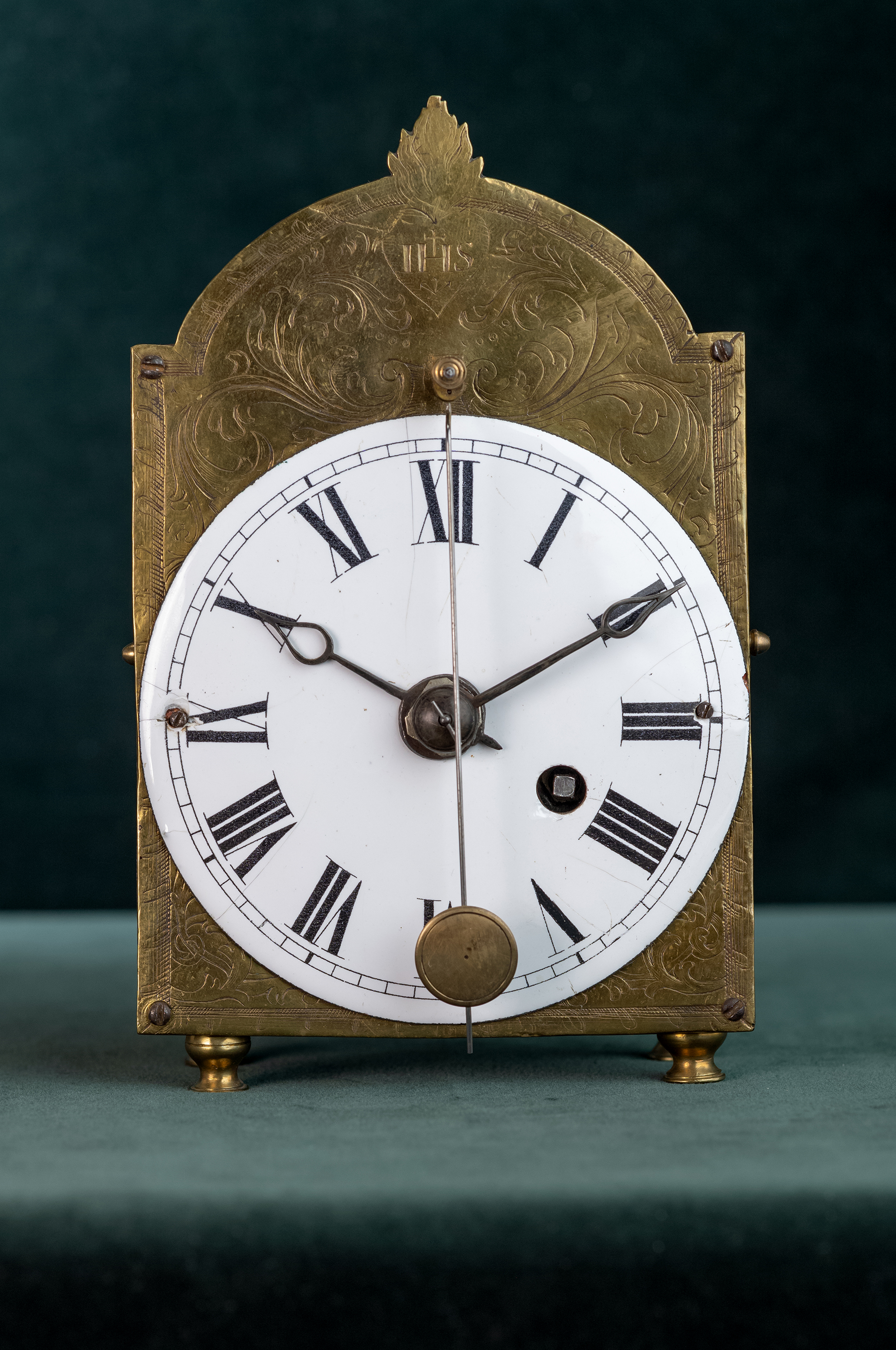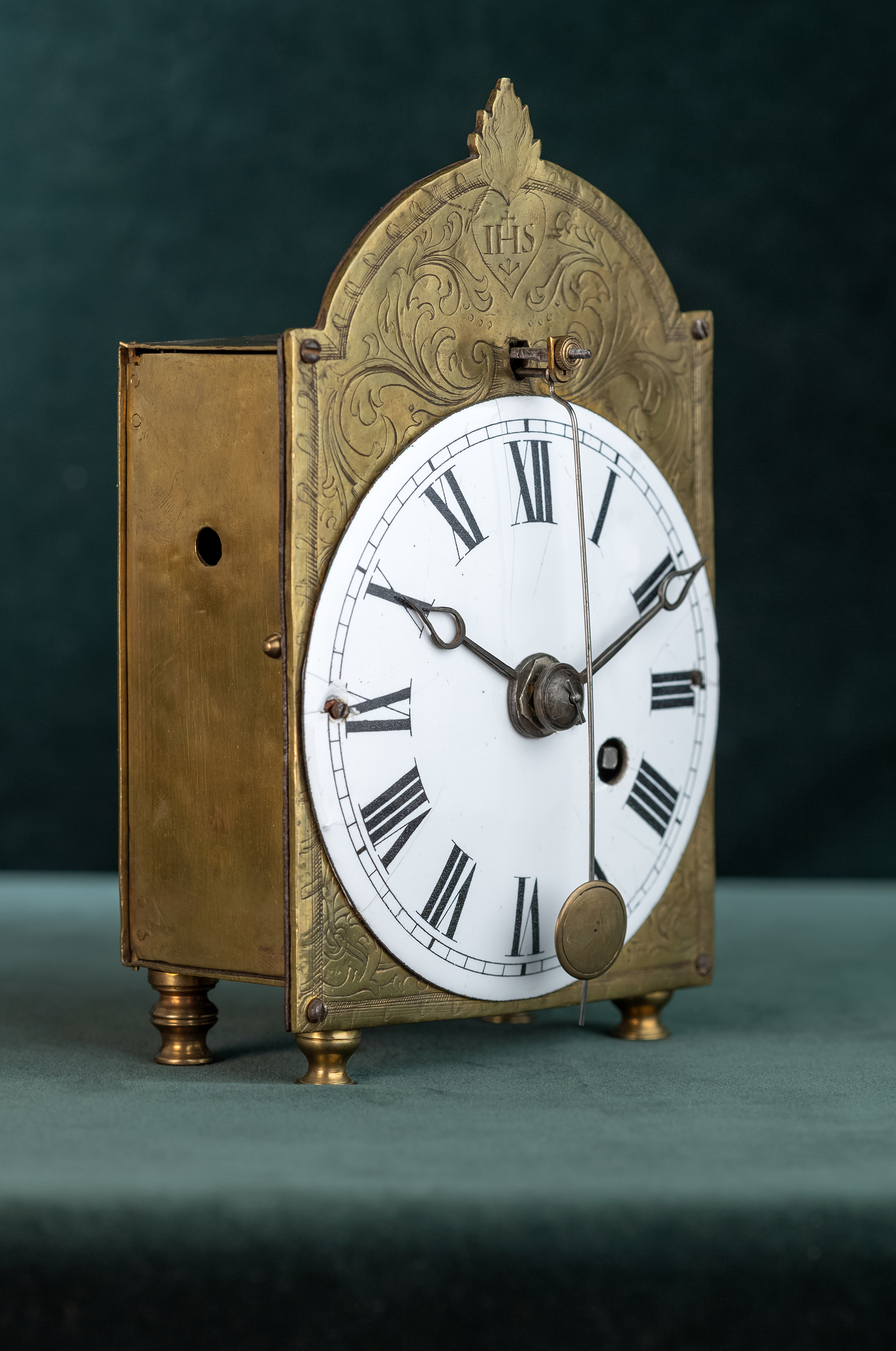 Tafelklokje met slinger aan de voorkant. Gaandwerkje met snek en veertrommel met de loopduur van een dag. Messing behuizing met geëmaillieerde wijzerplaat. IHS is een van de monogrammen voor Jezus Christus. Het bekendste is het Christusmonogram. Op Byzantijnse iconen wordt de naam van Jezus meestal afgekort met IC XC, zijnde de eerste en de laatste letter van de Griekse vorm van Jezus Christus (jota-sigma; chi-sigma). In het Westen wordt IHS de gangbare aanduiding van 'de Heilige Naam van Jezus'. Hoogte 18cm, breed 10,5 cm, diepte 6 cm.