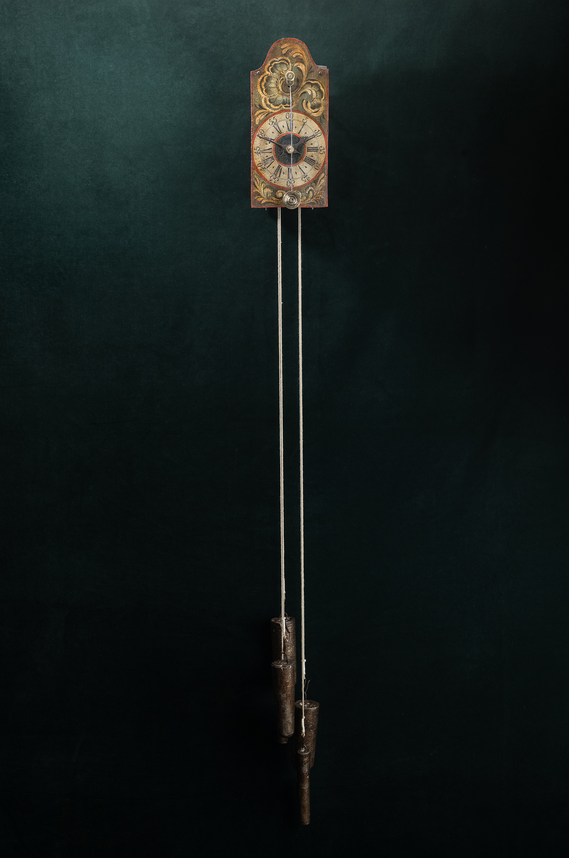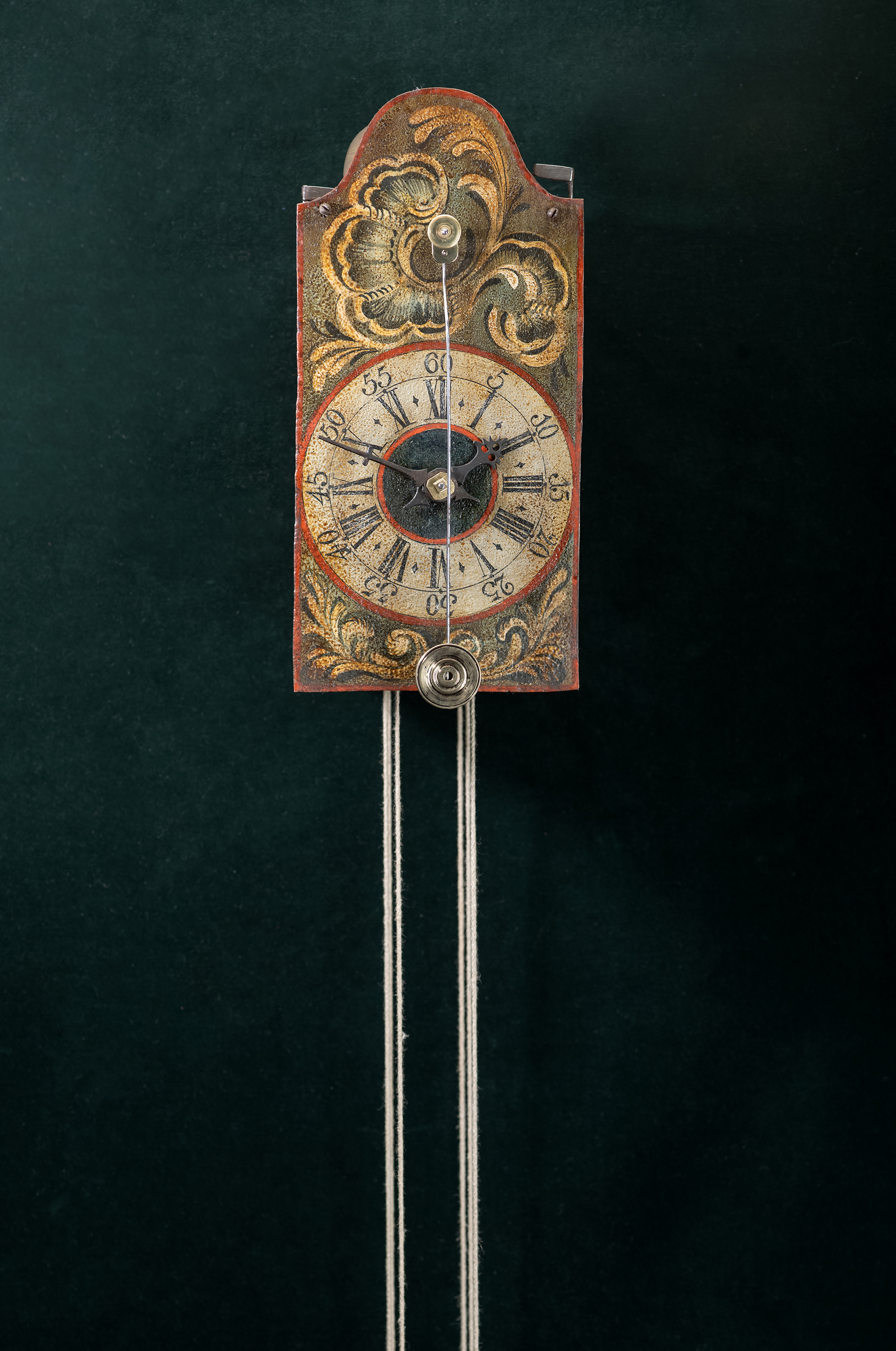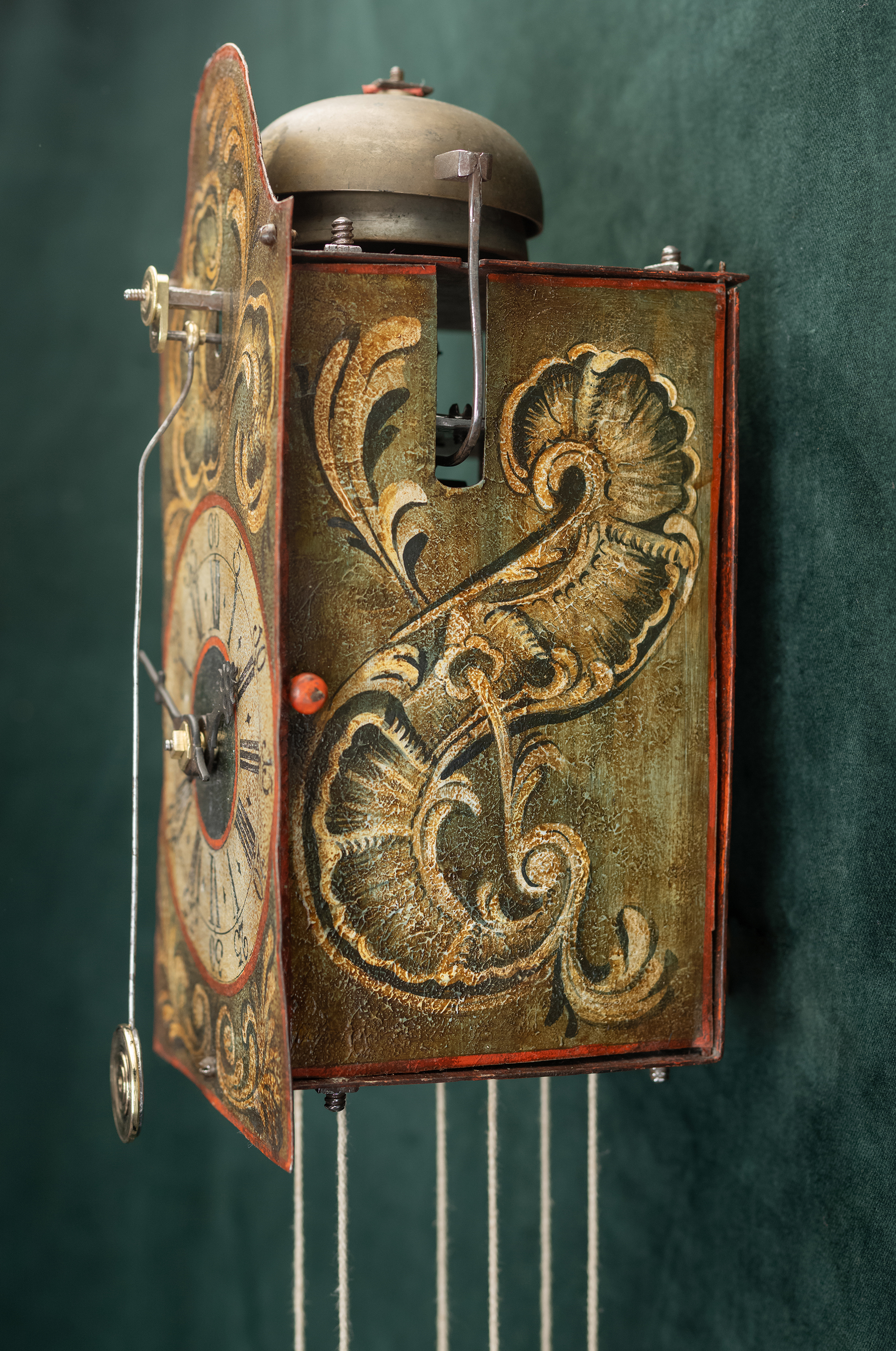 Duitse klok met groen getinte beschilderde wijzerplaat en deuren. Het typische ijzeren uurwerk dat bij deze klok is opgebouwd in drie radarwerken : een gaandwerk, een slagwerk en een kwartierslagwerk. Ze slaat per kwartier een slag op de kleinste bel en op de uren ook nog de uren op de grote bel. De kuchwanzpendel ( slinger ) aan de voorkant maakt ze levendig. De koorden met de loden gewichten drijven de klok aan. De wijzerplaat heeft een breedte van 13 cm en een hoogte van 27 cm. De loopduur van deze klok is 24 uur.
