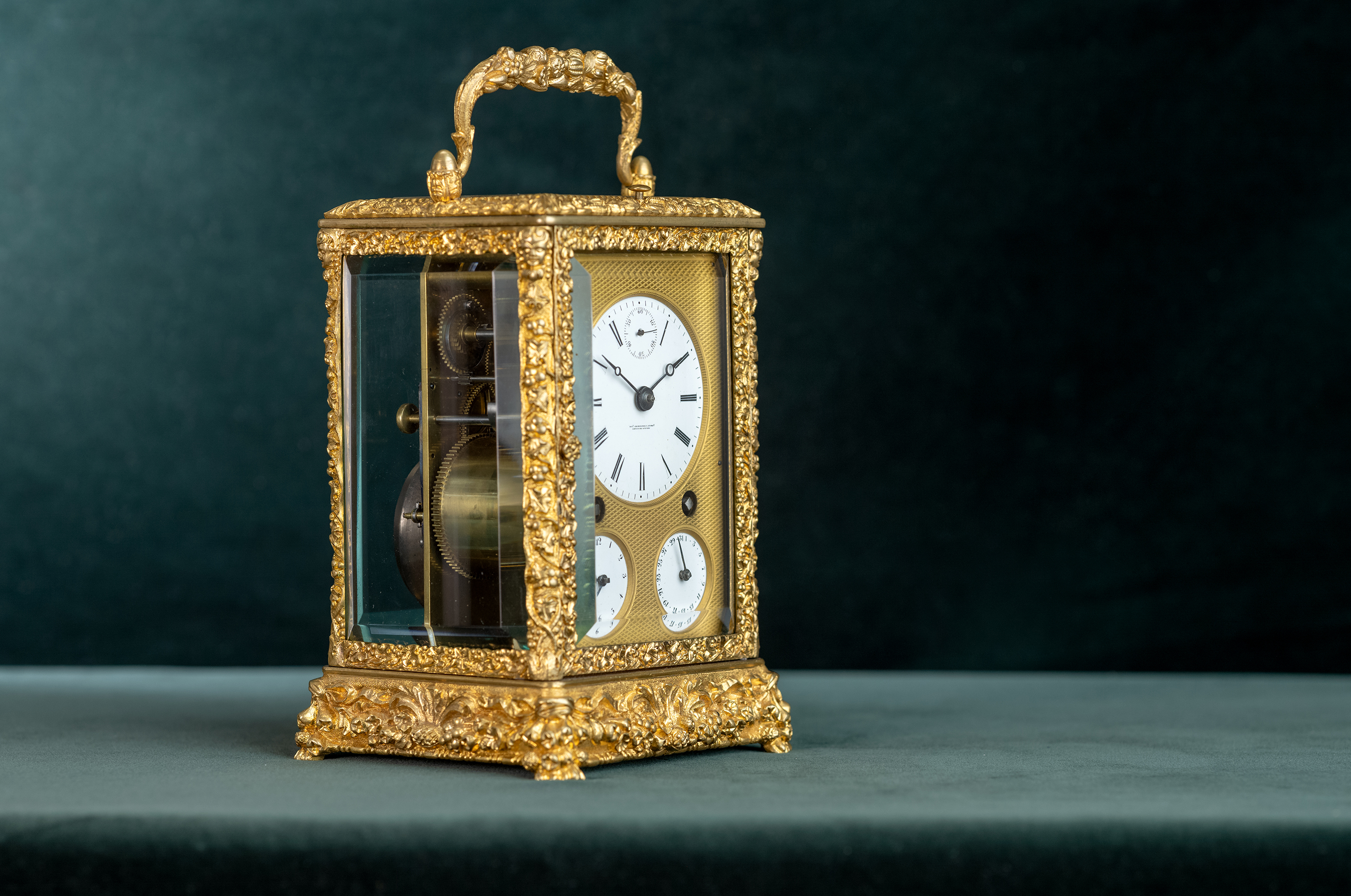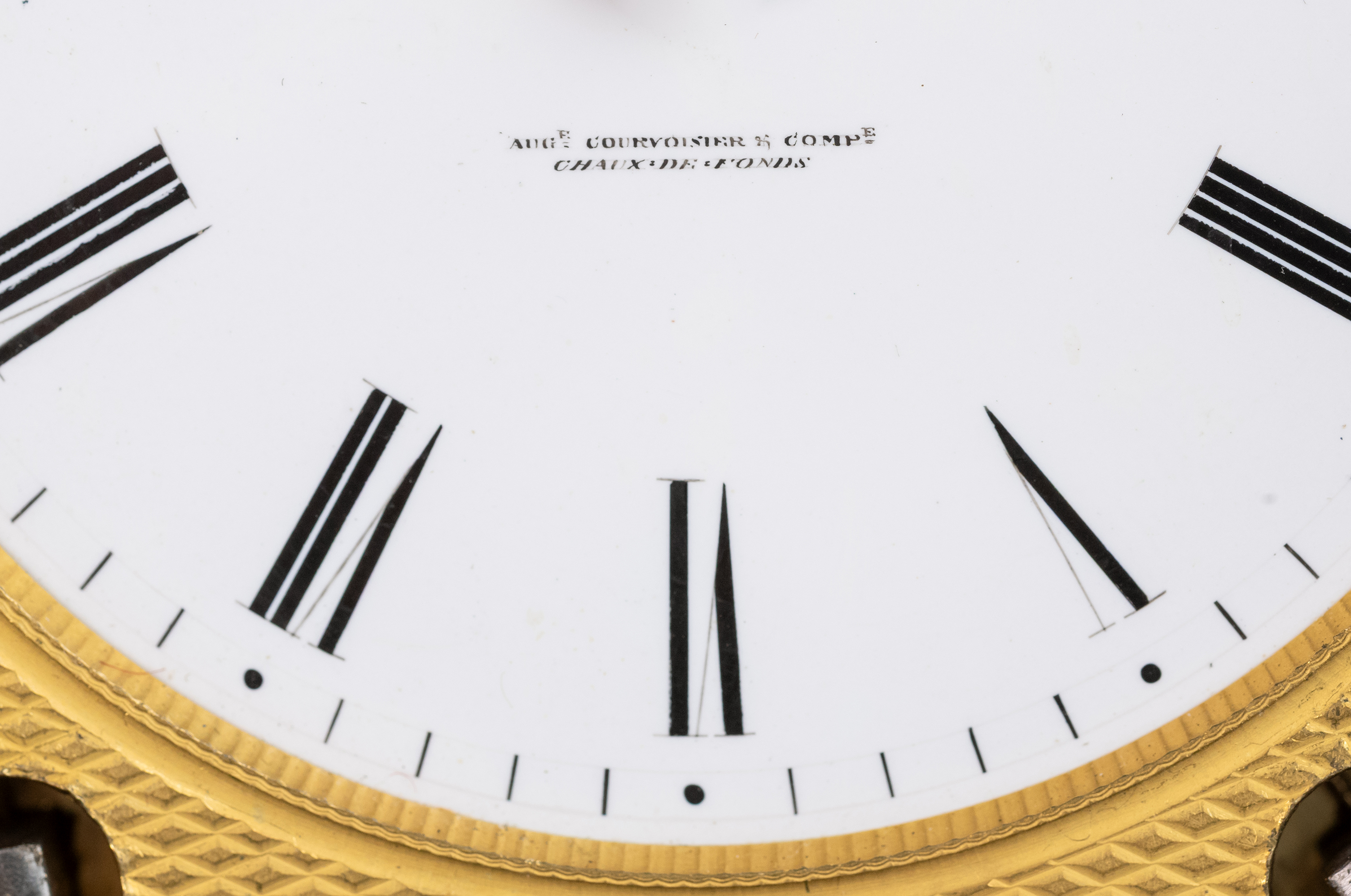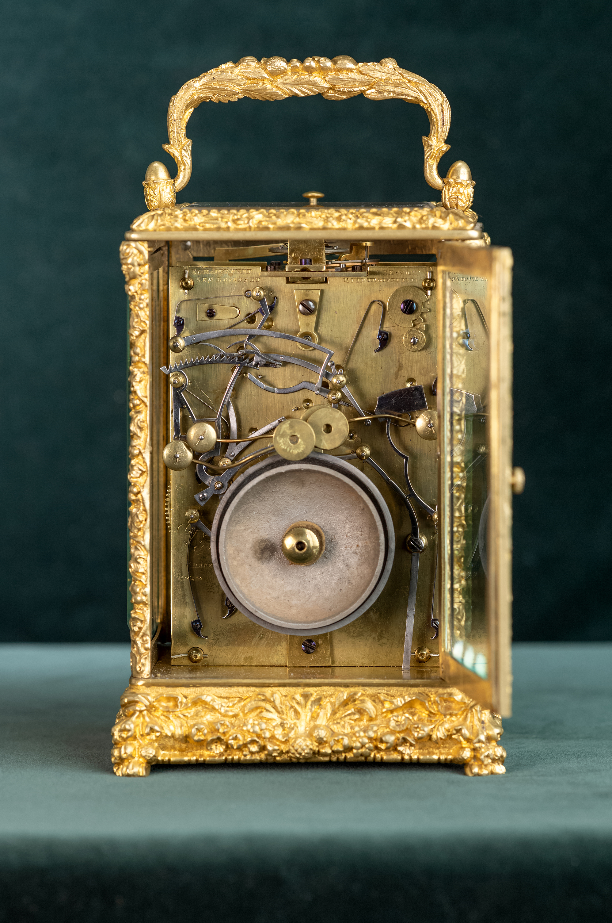 Reisklok August Courvoisier a Chaux de Fonds gesigneerd op de wijzerplaat. Klokje met gaandwerk en slagwerk op de uren, en de kwartieren grand sonnerie op twee bellen. ‘s Nachts vanaf 22u slaat het slagwerk automatisch petit sonnerie, d.w.z. geen kwartieren alleen de uren. Het gaandwerk heeft het uitzonderlijke chronometer echappement. De wijzerplaat heeft vier aanduidingen, De tijd, de wekker, datum en seconde aanduiding. De twee geblauwde Breguet wijzers geven de tijd aan. Het kastje is met bloemmotief geciseleerd en heeft nog zijn originele vergulding. Rondom gefaceteerde glazen. Bovenop vindt u een knopje voor de slagwerk repetitie. Deurtjes vanvoor en vanachter. Hoogte ( met handvat ) 20 cm breedte 11 cm en diepte 10 cm.