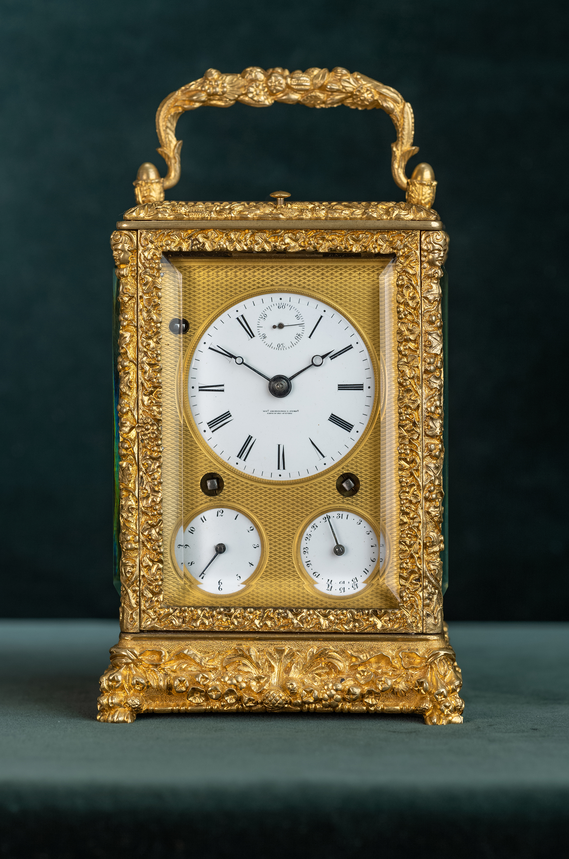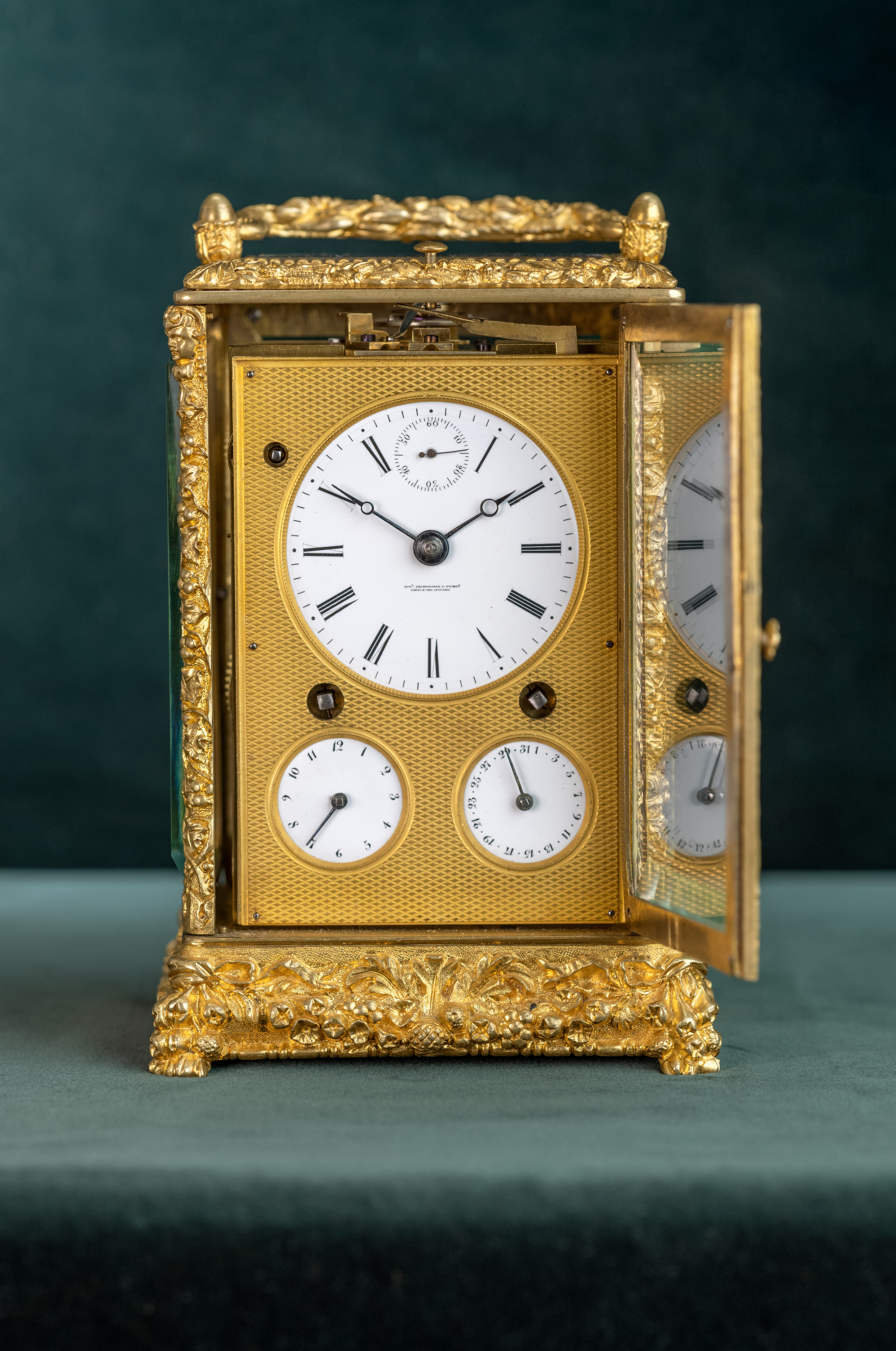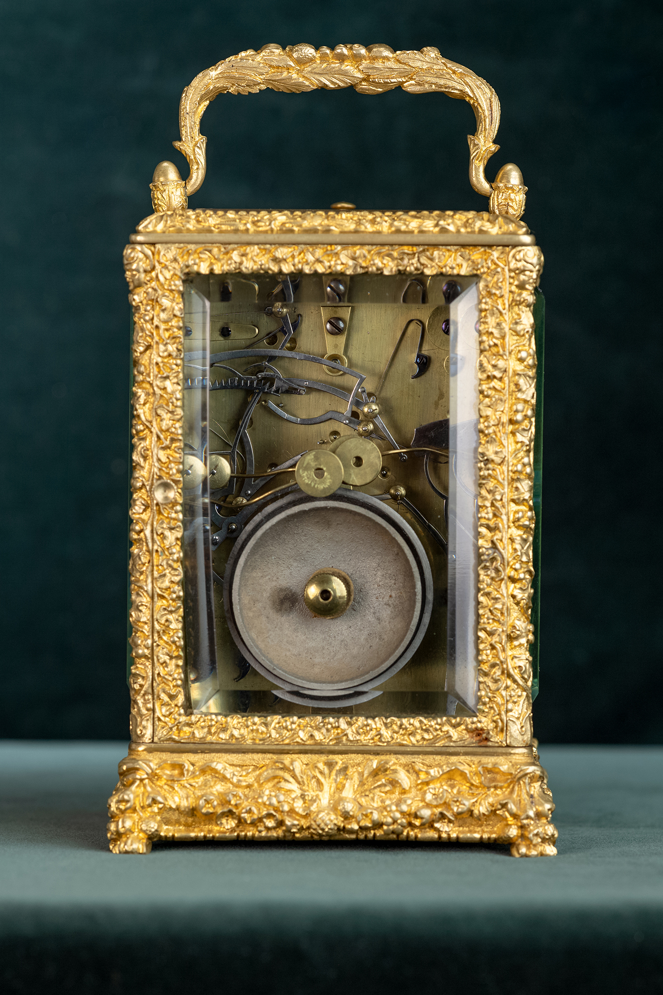 Reisklok August Courvoisier a Chaux de Fonds gesigneerd op de wijzerplaat. Klokje met gaandwerk en slagwerk op de uren, en de kwartieren grand sonnerie op twee bellen. ‘s Nachts vanaf 22u slaat het slagwerk automatisch petit sonnerie, d.w.z. geen kwartieren alleen de uren. Het gaandwerk heeft het uitzonderlijke chronometer echappement. De wijzerplaat heeft vier aanduidingen, De tijd, de wekker, datum en seconde aanduiding. De twee geblauwde Breguet wijzers geven de tijd aan. Het kastje is met bloemmotief geciseleerd en heeft nog zijn originele vergulding. Rondom gefaceteerde glazen. Bovenop vindt u een knopje voor de slagwerk repetitie. Deurtjes vanvoor en vanachter. Hoogte ( met handvat ) 20 cm breedte 11 cm en diepte 10 cm.